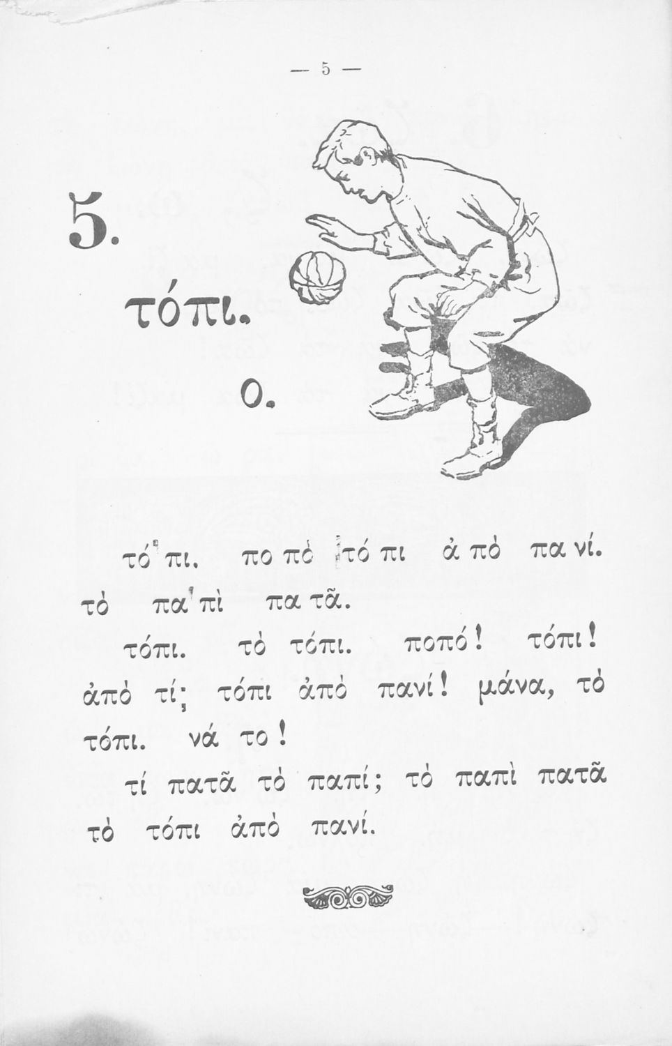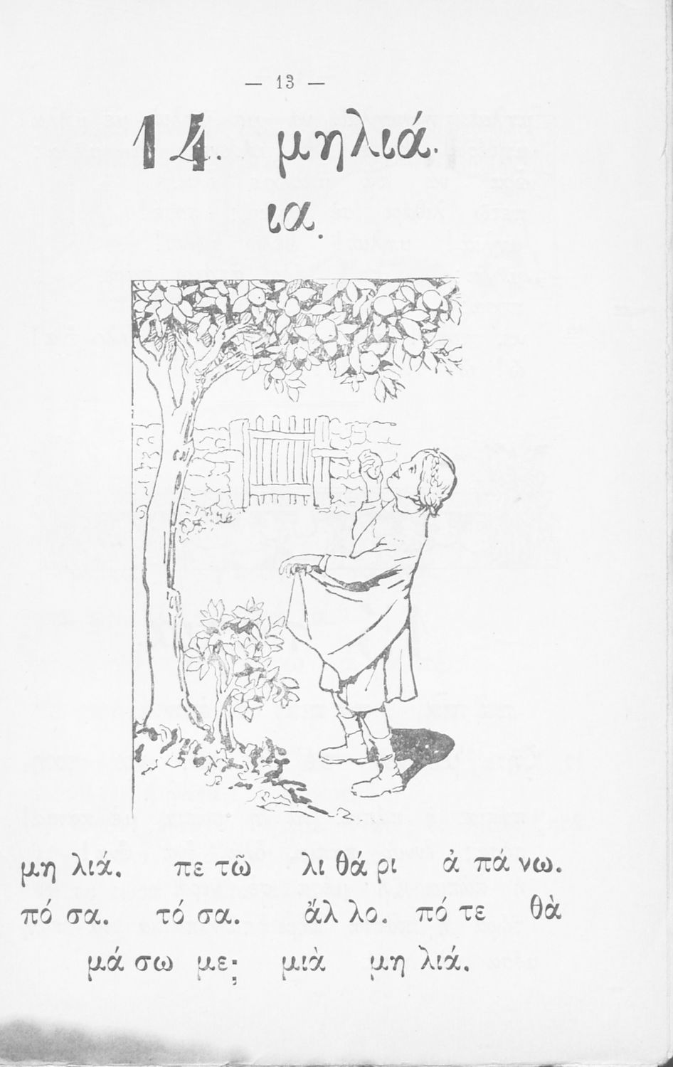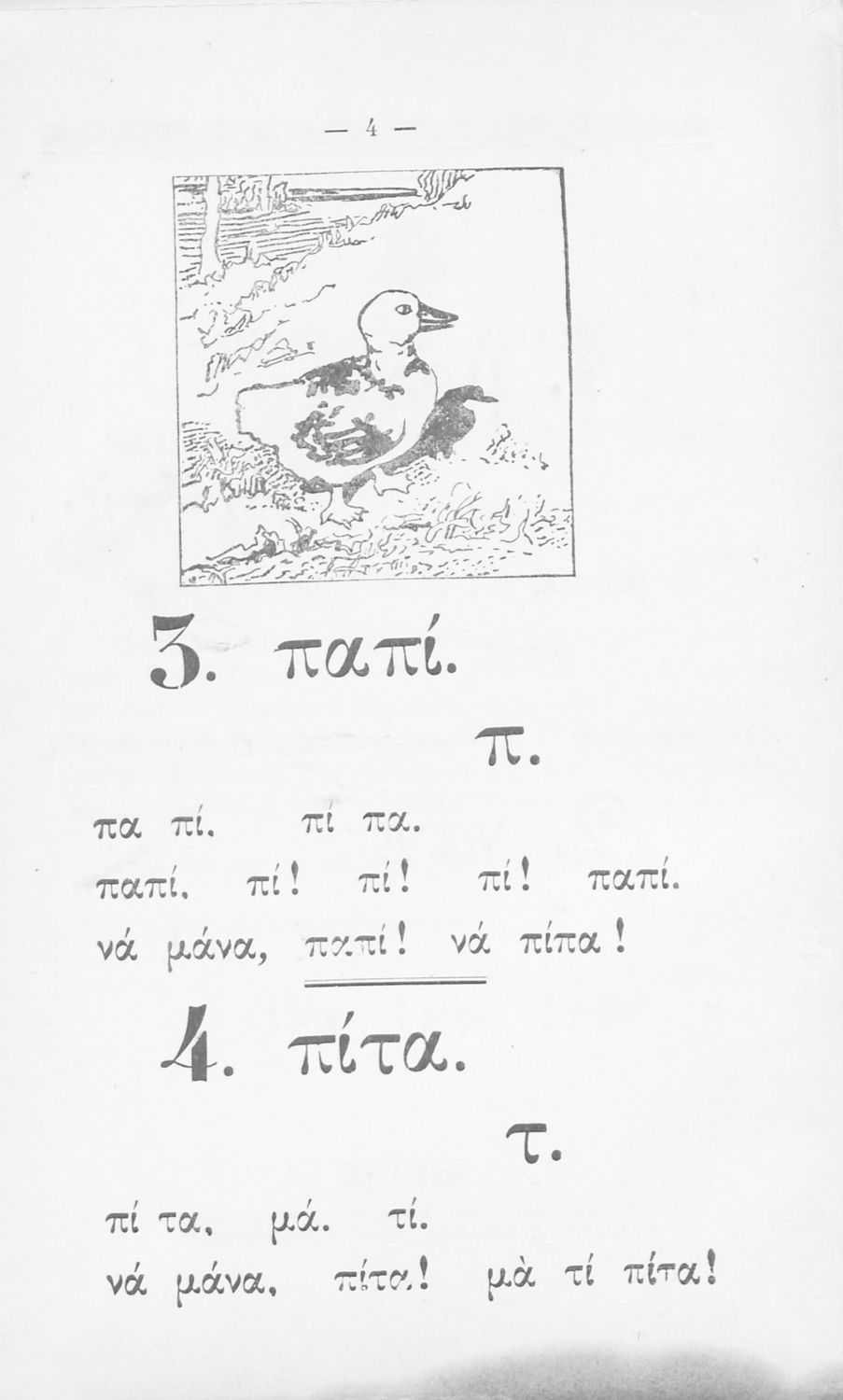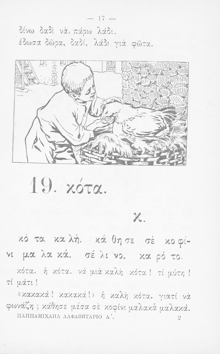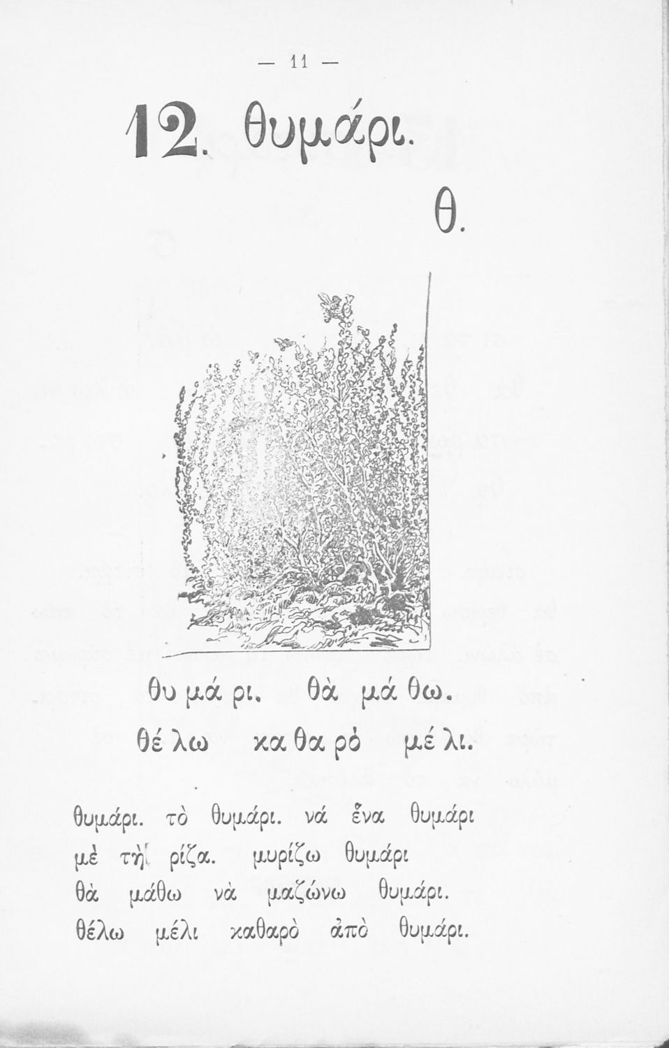 Βαθμίδα εκπαίδευσης: Πρωτοβάθμια Τάξη: Α' Δημοτικού Μάθημα: Νέα Ελληνικά Γλώσσα: Δημοτική Παρουσίαση περιεχομένου: Αναγνωστικό Α΄ Δημοτικού που περιλαμβάνει την εκμάθηση του ελληνικού αλφάβητου, των πρώτων συλλαβών, λέξεων, φράσεων και μικρών παραγράφων. Η θεματολογία αντλείται από την ελληνική ύπαιθρο, την αγροτική ζωή και τον οικογενειακό περίγυρο. |