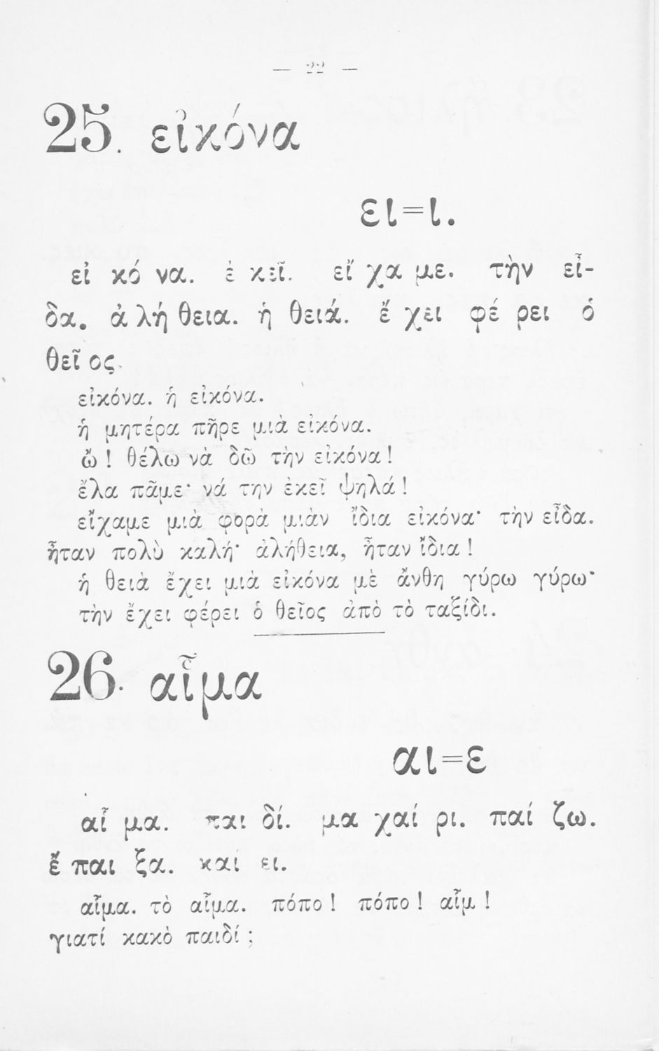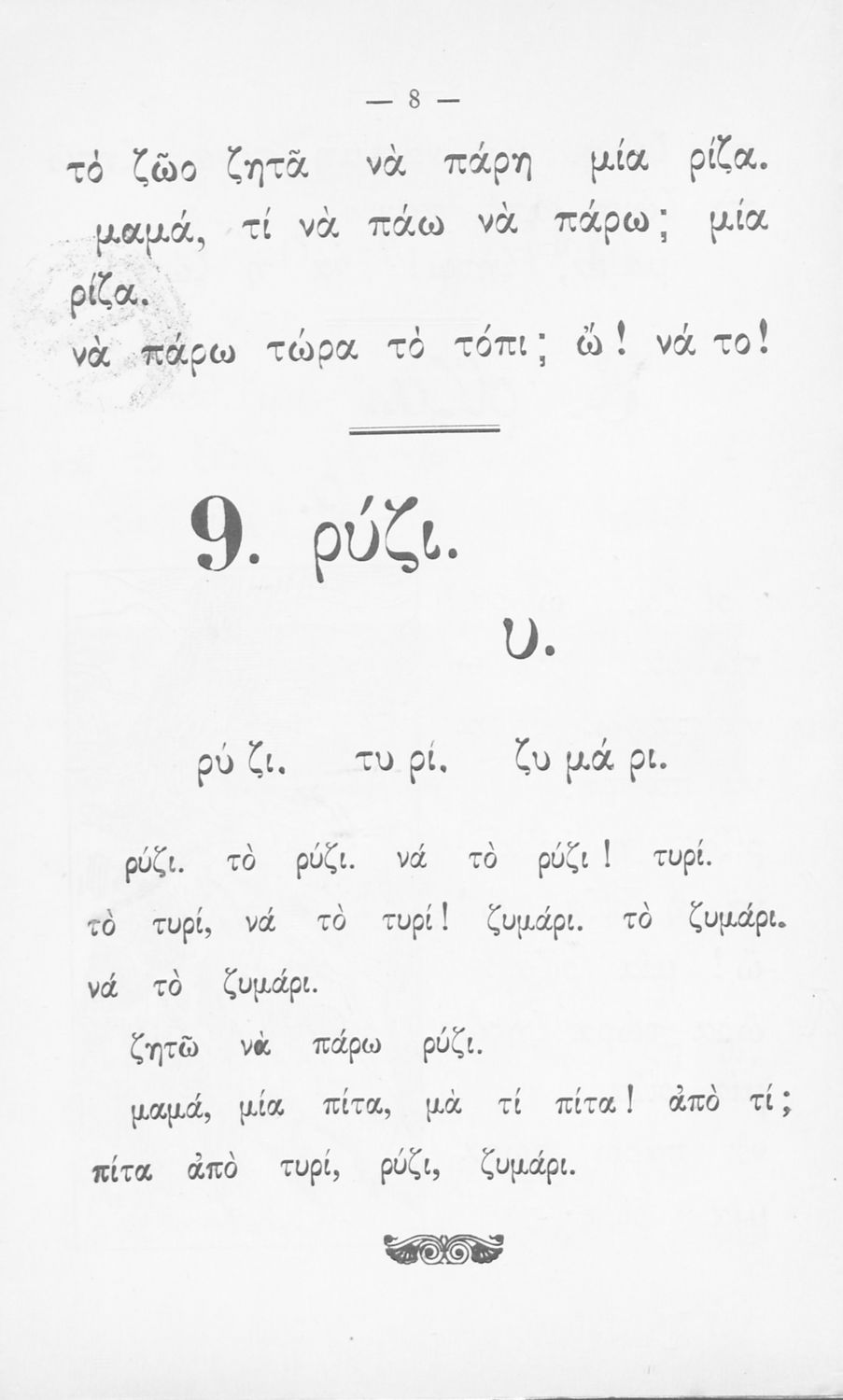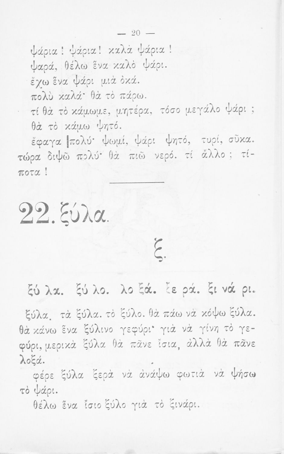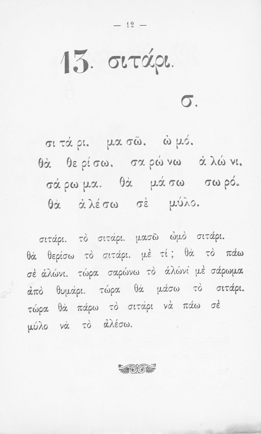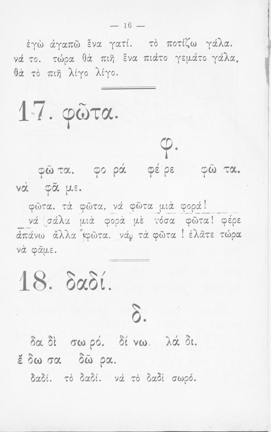 Βαθμίδα εκπαίδευσης: Πρωτοβάθμια Τάξη: Α' Δημοτικού Μάθημα: Νέα Ελληνικά Γλώσσα: Δημοτική Παρουσίαση περιεχομένου: Αναγνωστικό Α΄ Δημοτικού που περιλαμβάνει την εκμάθηση του ελληνικού αλφάβητου, των πρώτων συλλαβών, λέξεων, φράσεων και μικρών παραγράφων. Η θεματολογία αντλείται από την ελληνική ύπαιθρο, την αγροτική ζωή και τον οικογενειακό περίγυρο. |