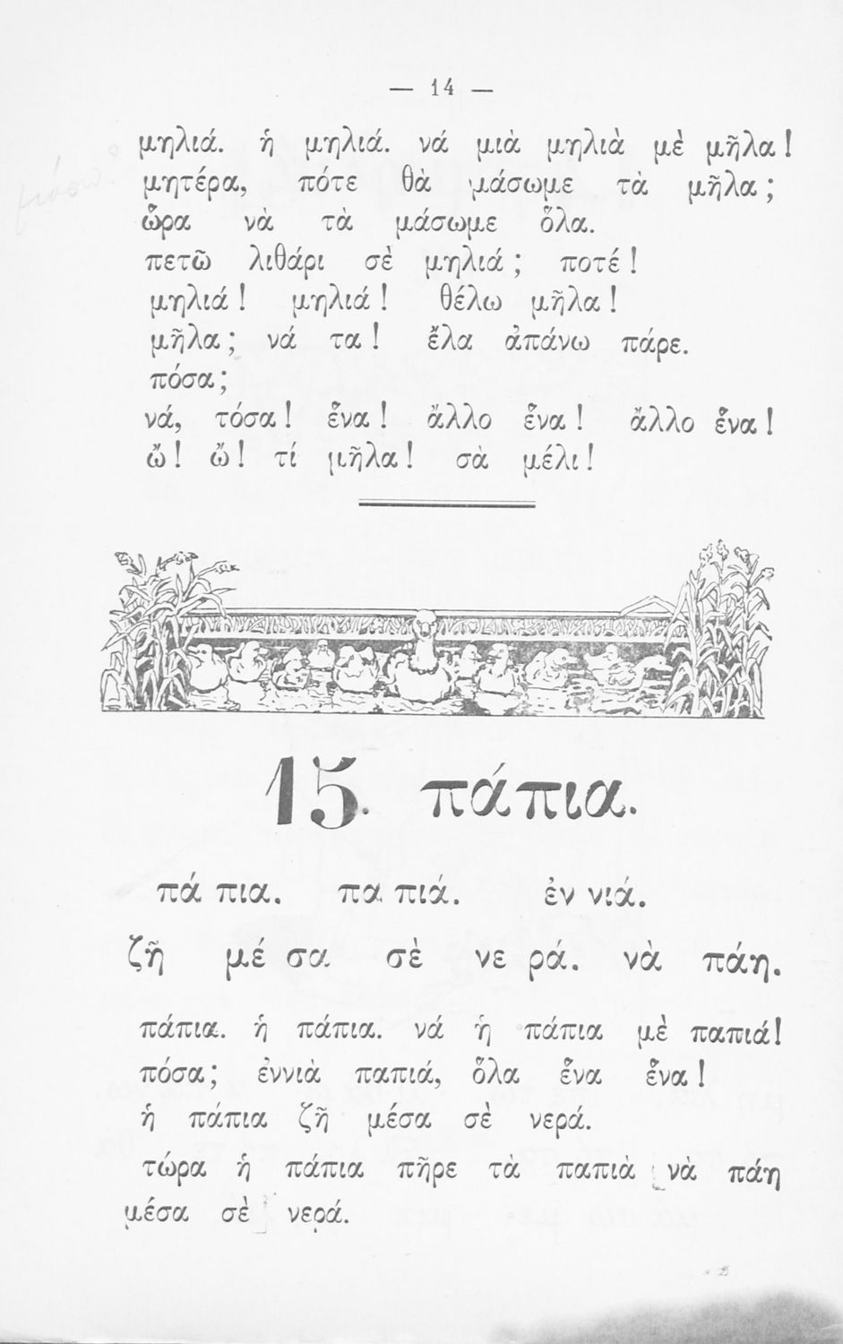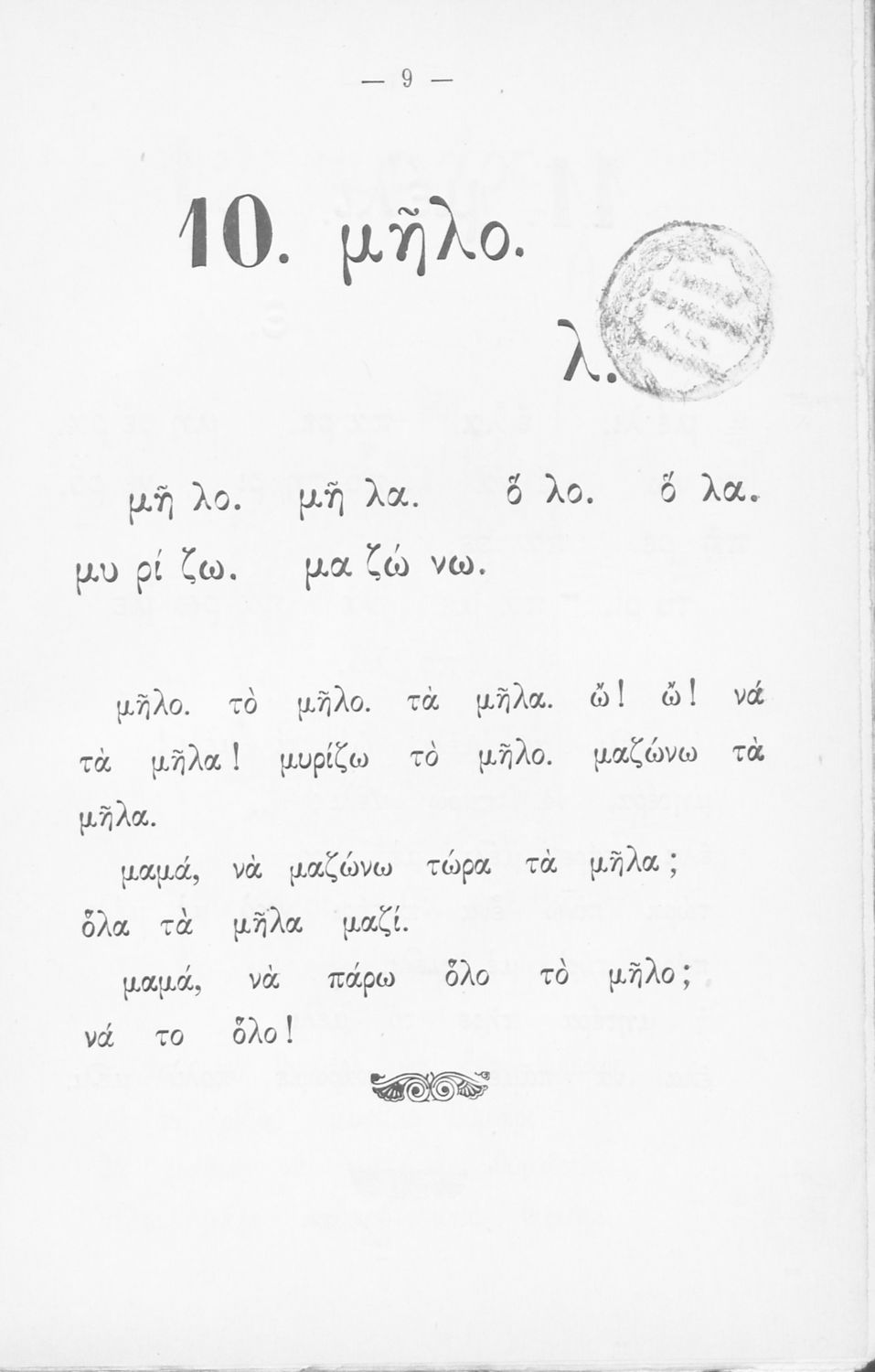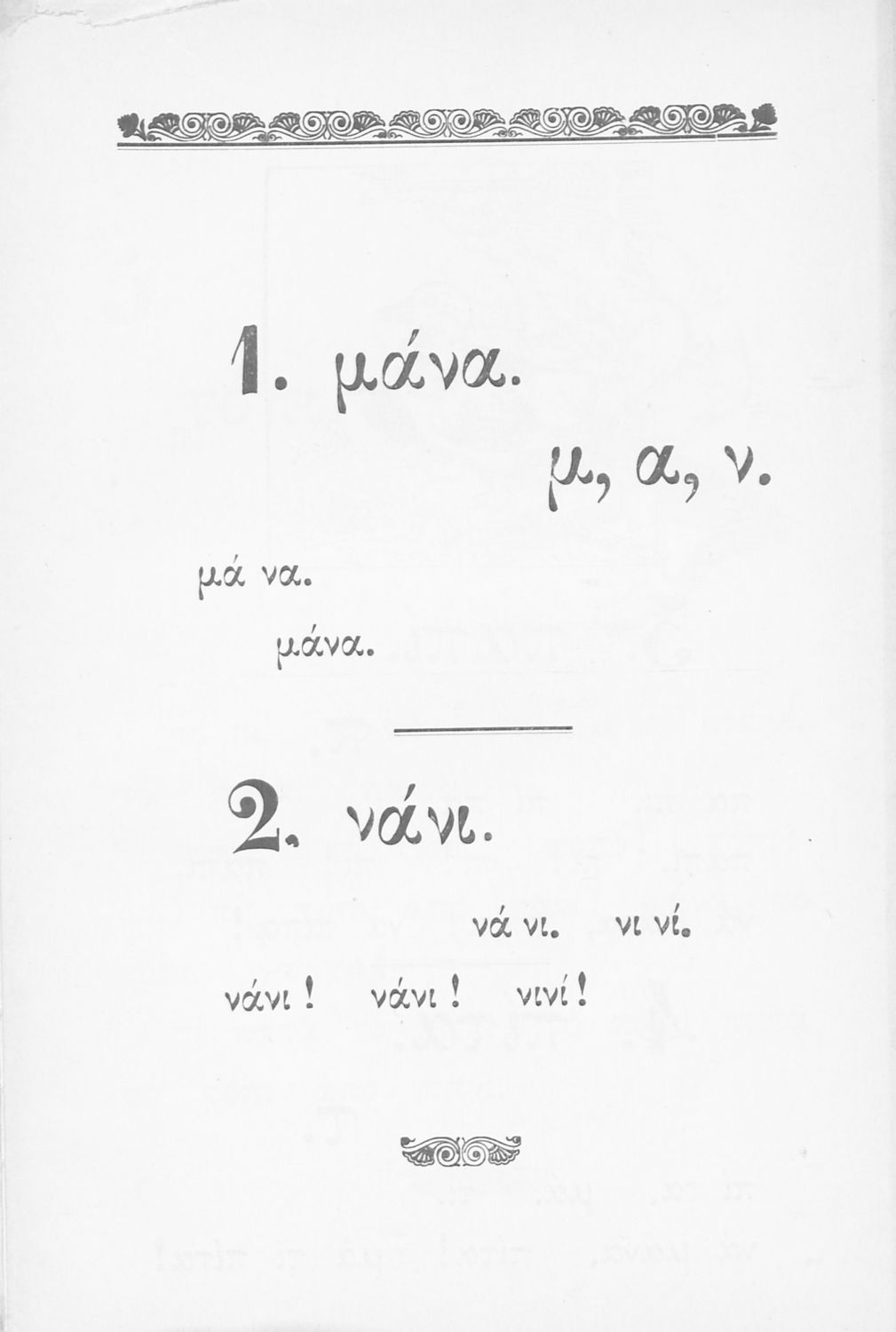 LDR 01215 2200205 4500 035 ## _a05-00079 040 ## _aΕργαστήρι Ιστορίας Ν.Ε. Εκπαίδευσης, Πανεπιστήμιο Ιωαννίνων 041 ## _ael 100 ## _aΕπ. Γ. Παπαμιχαήλ 110 ## _a079 245 0# _aΑλφαβητάριο. Μέρος Α΄ 260 ## _aΑθήνα _bΔημ. Δημητράκος _c1917 300 ## _a56 _bΣκίτσα (ασπρόμαυρα) 520 ## _aΑναγνωστικό Α΄ Δημοτικού που περιλαμβάνει την εκμάθηση του ελληνικού αλφάβητου, των πρώτων συλλαβών, λέξεων, φράσεων και μικρών παραγράφων. Η θεματολογία αντλείται από την ελληνική ύπαιθρο, την αγροτική ζωή και τον οικογενειακό περίγυρο. 521 ## _aΑ' Δημοτικού 522 ## _aΕλλάδα 546 ## _aΔημοτική 563 ## _aΣκληρό Εξώφυλλο 583 ## _a26156/17-10-1917 _c1917 650 #4 _aΑλφαβητάριο _aΚαθημερινή ζωή _aΛέξεις _aΠροτάσεις _aΣυλλαβές _aΦθόγγοι