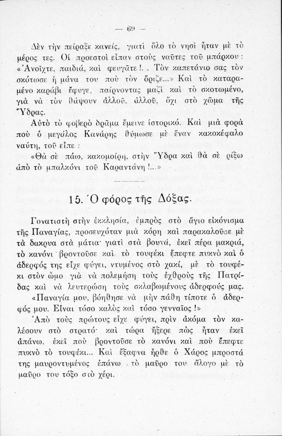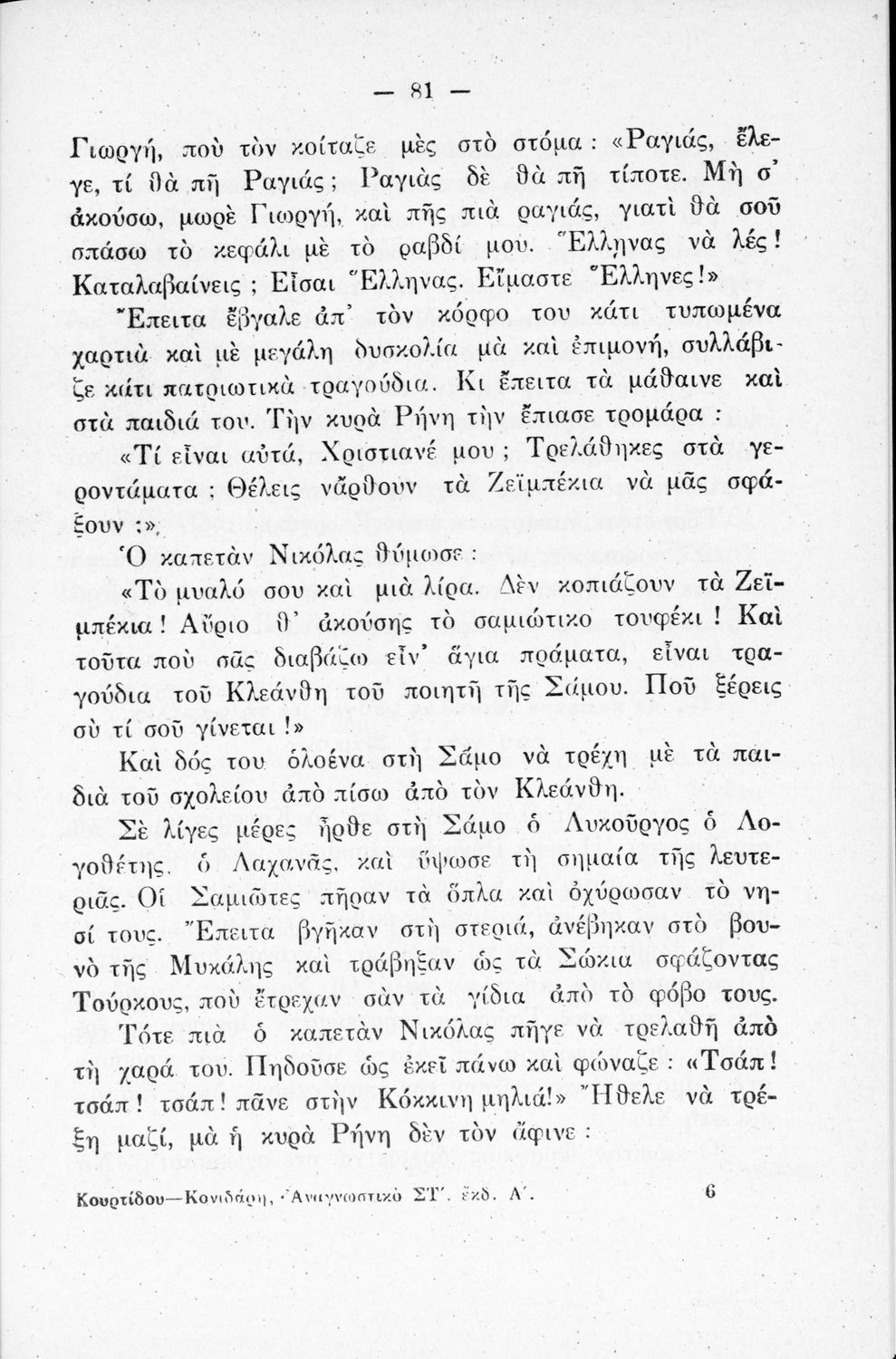 Αναγνωστικό ΣΤ΄ Δημοτικού που περιλαμβάνει ποιήματα και πεζά που εκθειάζουν αξίες όπως της πατρίδας, της θρησκείας, της οικογένειας, της αυτοθυσίας και του ηρωισμού των γυναικών, της τιμιότητας και της αγάπης.
