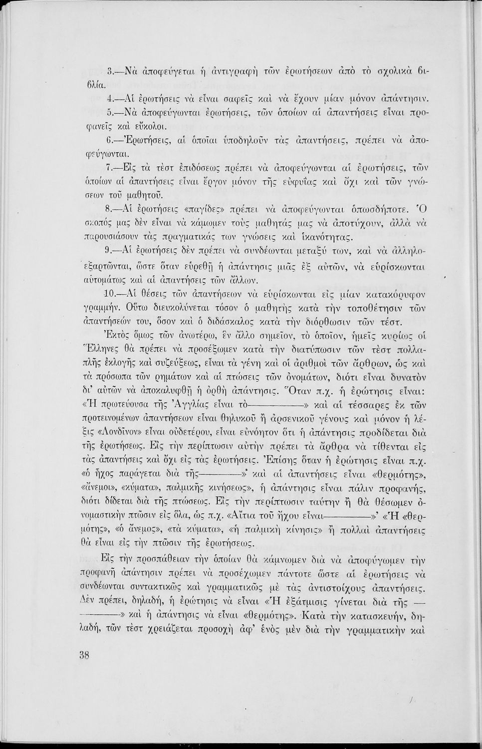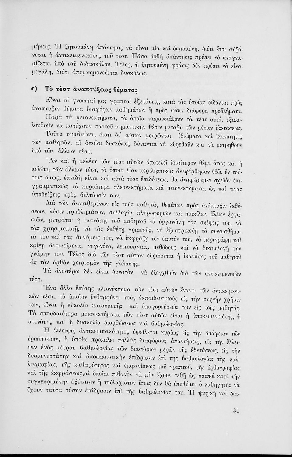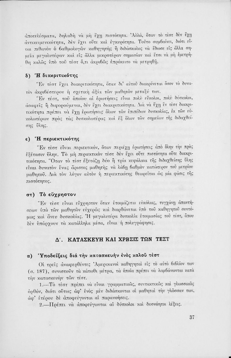 Γλώσσα: Καθαρεύουσα Παρουσίαση περιεχομένου: Παιδαγωγικό βοήθημα που περιέχει γενικές πληροφορίες για τα τεστ επίδοσης στο σχολείο, τις προφορικές και γραπτές δοκιμασίες και τους τρόπους αξιολόγησής τους. |