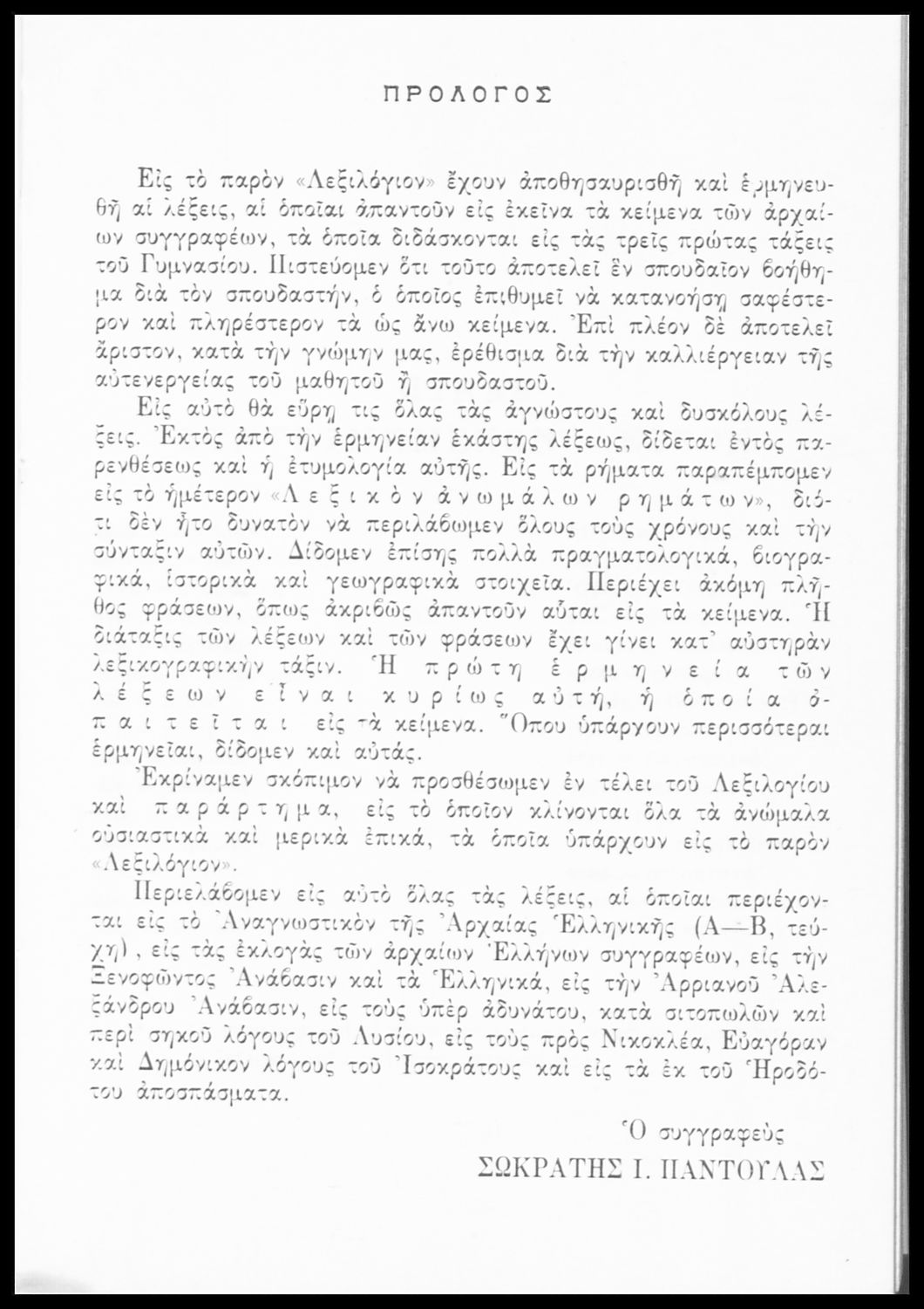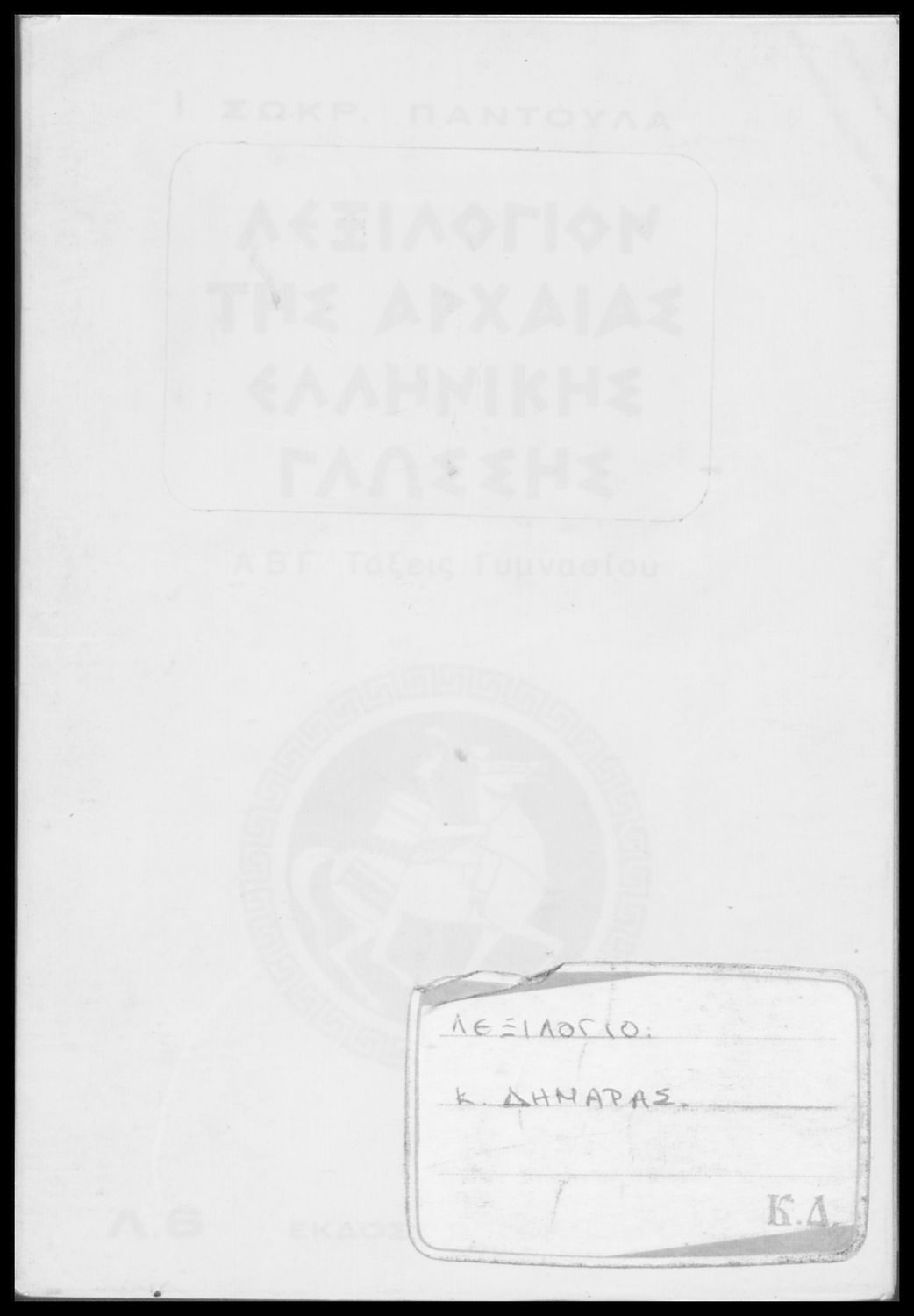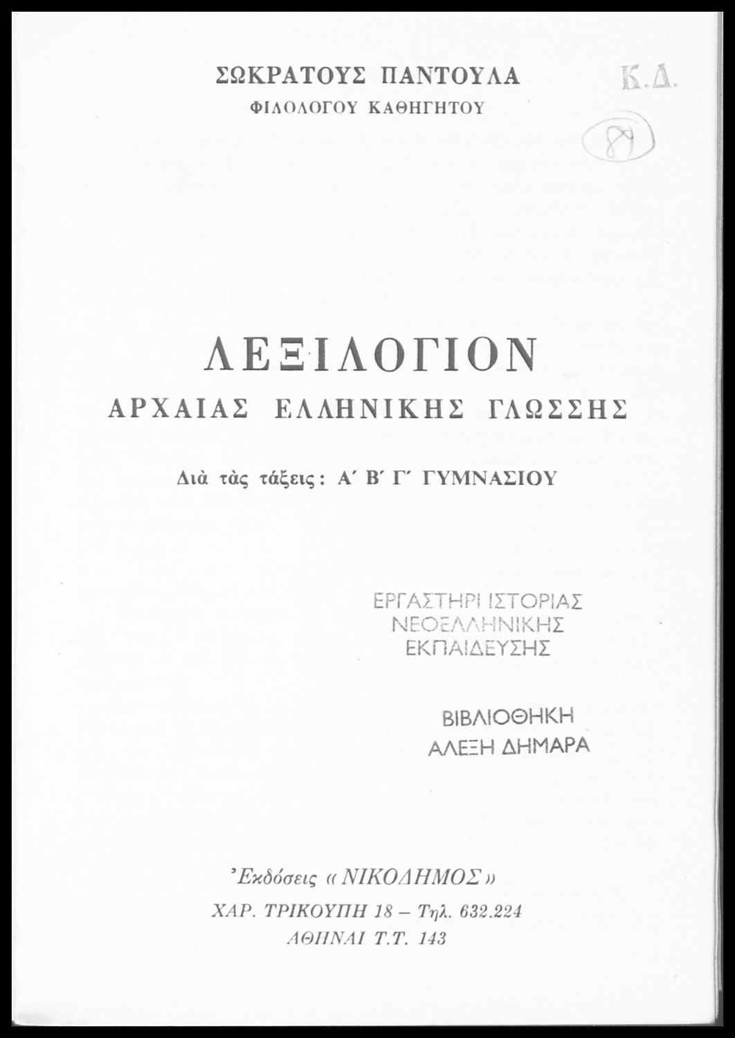 Κωδικός αναγνώρισης: 05-00089 Τίτλος: Λεξιλόγιον αρχαίας ελληνικής γλώσσης. Διά τας τάξεις: Α΄ Β΄ Γ΄ Γυμνασίου Συγγραφέας: Σωκράτης Παντούλας Μέγεθος και υπόστρωμα: Μαθητικό βοήθημα, μαλακό εξώφυλλο, 166 σελίδες. |