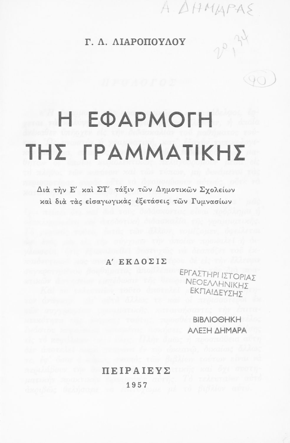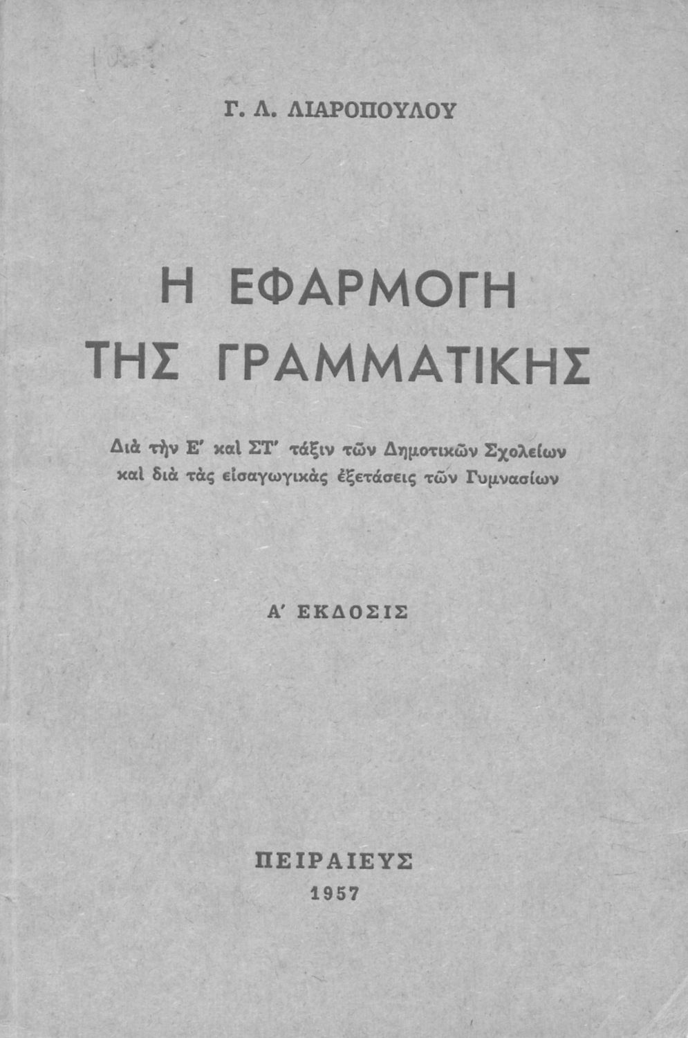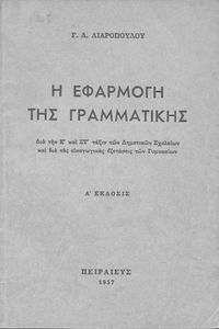 Κωδικός αναγνώρισης: 05-00090 Τίτλος: Η εφαρμογή της γραμματικής. Διά την Ε΄ και ΣΤ΄ τάξιν των Δημοτικών Σχολείων και διά τας εισαγωγικάς εξετάσεις των Γυμνασίων Συγγραφέας: Γ. Λ. Λιαρόπουλος Μέγεθος και υπόστρωμα: Μαθητικό βοήθημα, μαλακό εξώφυλλο, 69 σελίδες. |