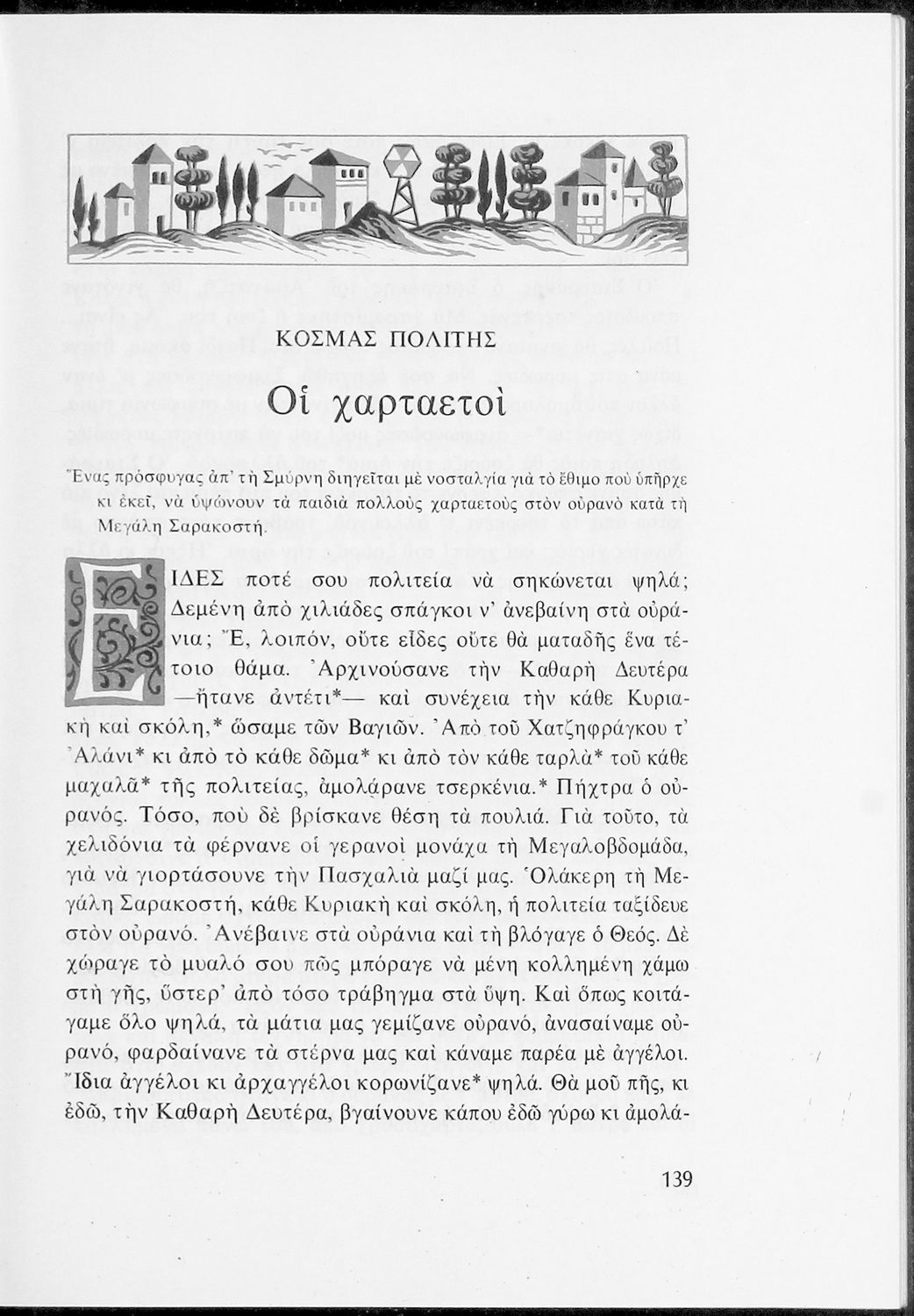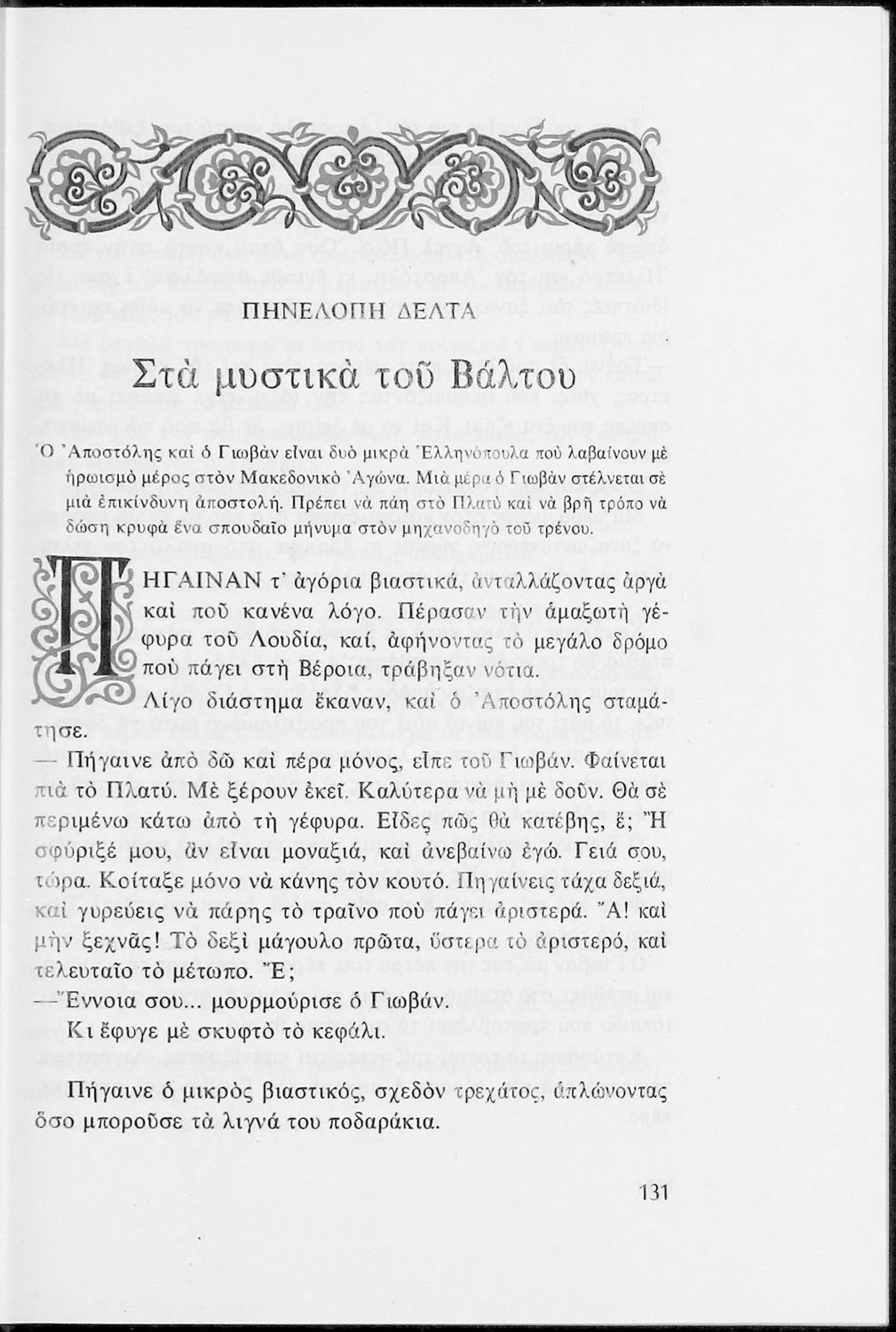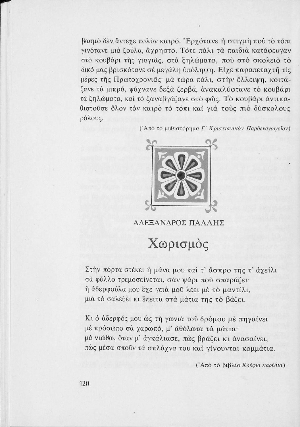 Αναγνωστικό για τις Ε΄ και ΣΤ΄ Δημοτικού που αποτελείται από πεζά και ποιήματα Ελλήνων συγγραφέων εμπνευσμένα από την καθημερινότητα των παιδιών και των οικογενειών τους, την ελληνική ιστορία, τις οικογενειακές στιγμές και εορτές, το παιχνίδι και την εθνική παράδοση, και δημοτικά και ακριτικά τραγούδια. Περιέχει και 5 κείμενα γραμμένα στην καθαρεύουσα με θέματα από τον κοινωνικό και εθνικό βίο.