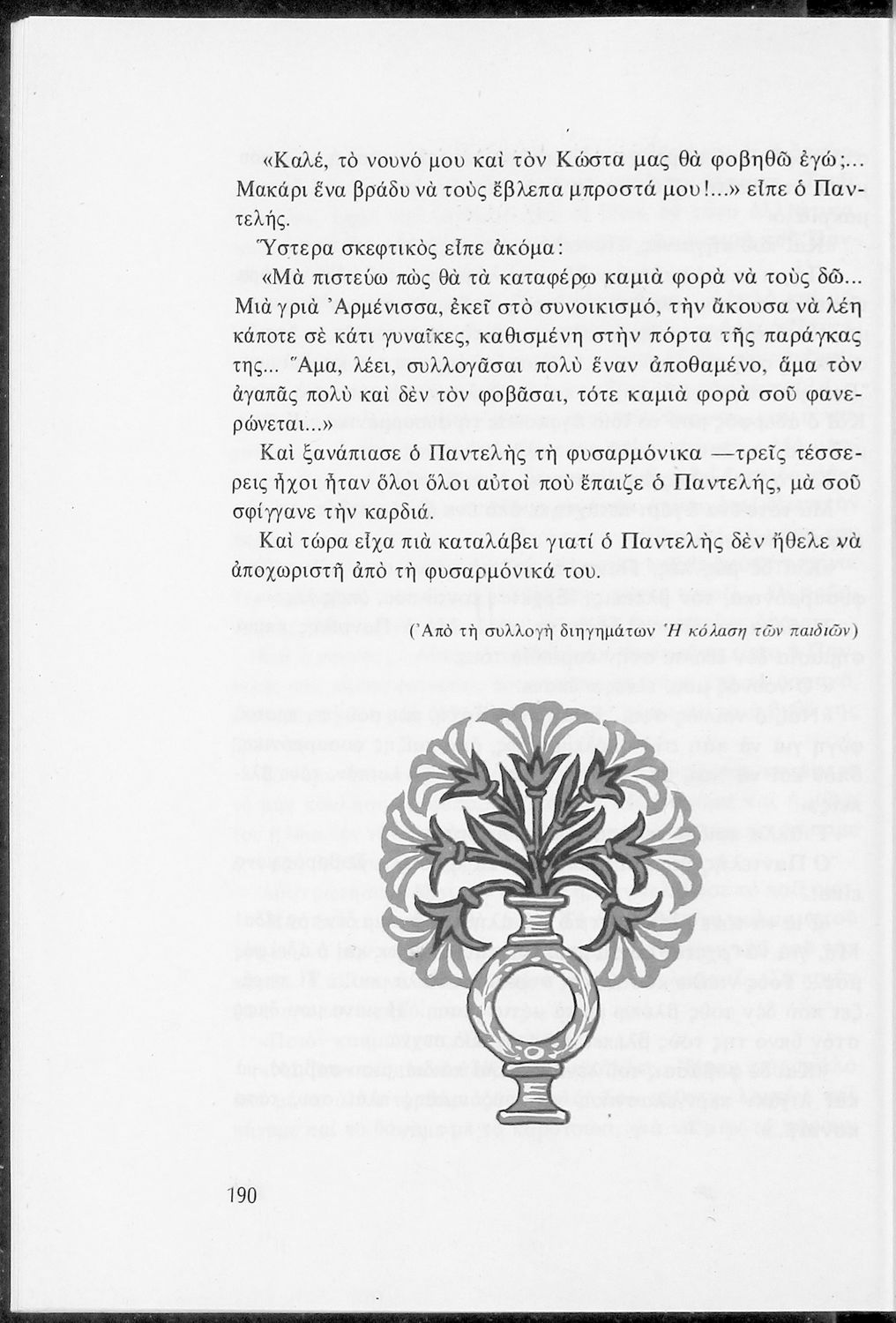 520 ## _aΑναγνωστικό για τις Ε΄ και ΣΤ΄ Δημοτικού που αποτελείται από πεζά και ποιήματα Ελλήνων συγγραφέων εμπνευσμένα από την καθημερινότητα των παιδιών και των οικογενειών τους, την ελληνική ιστορία, τις οικογενειακές στιγμές και εορτές, το παιχνίδι και την εθνική παράδοση, και δημοτικά και ακριτικά τραγούδια. Περιέχει και 5 κείμενα γραμμένα στην καθαρεύουσα με θέματα από τον κοινωνικό και εθνικό βίο.
