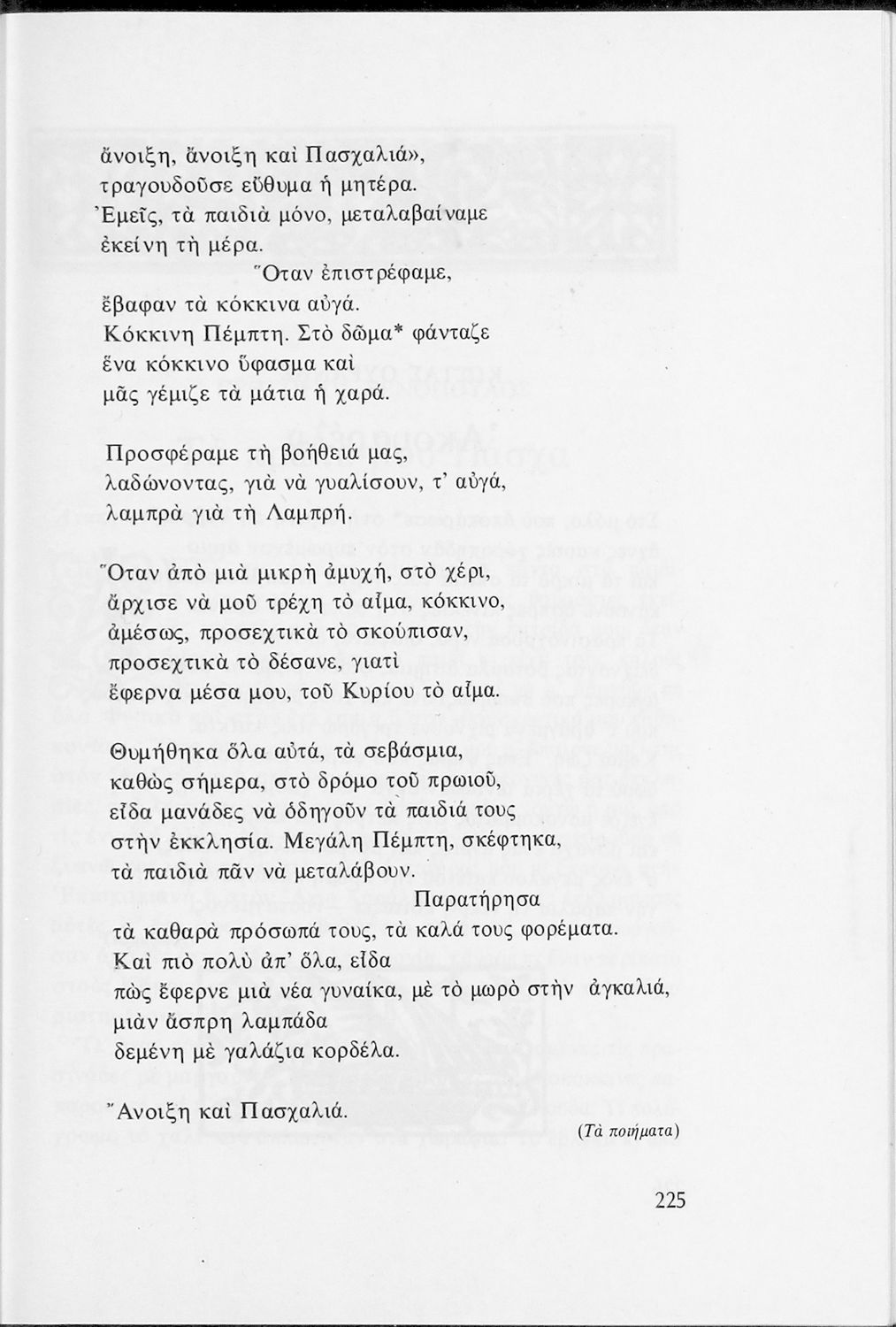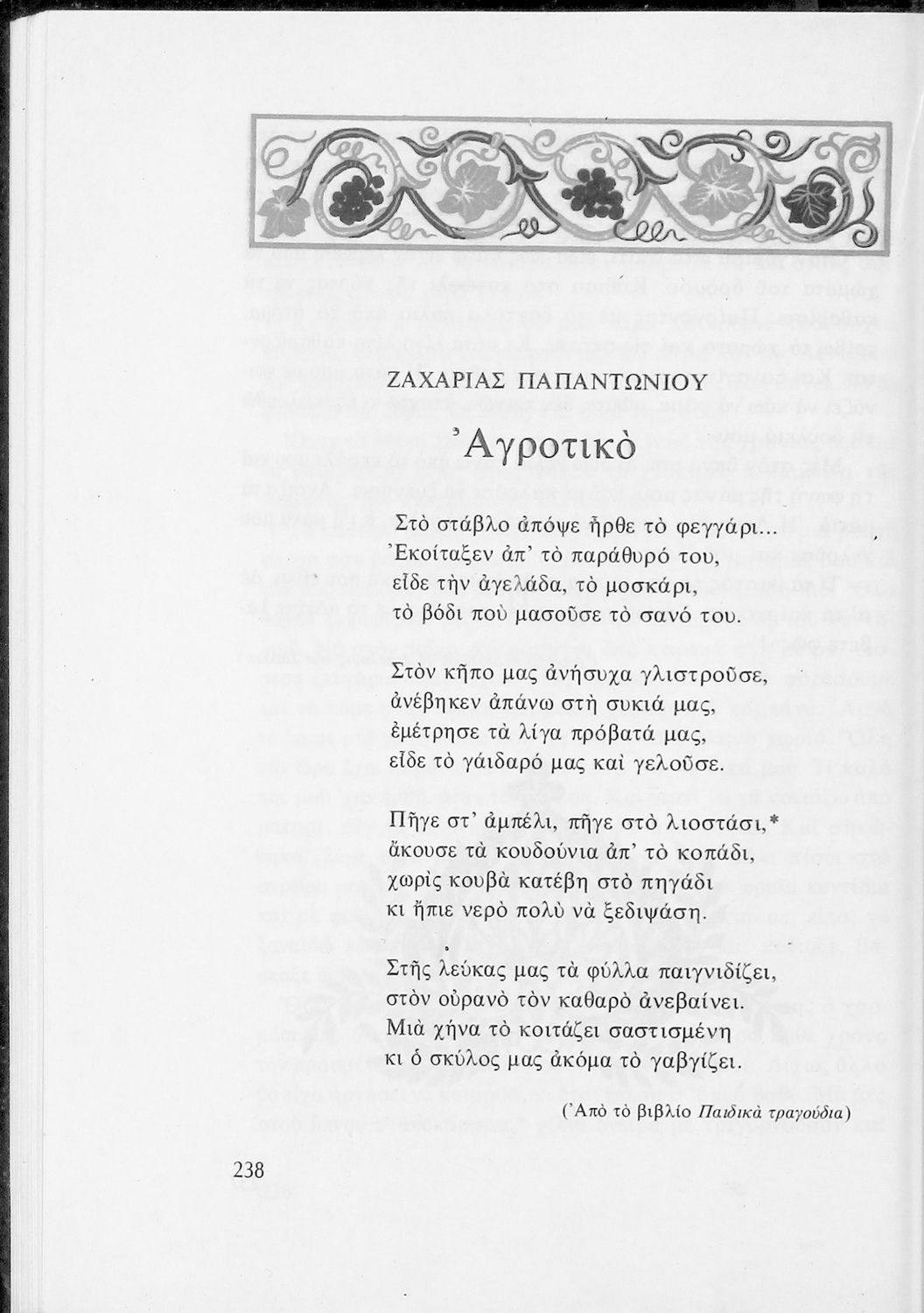 Αναγνωστικό για τις Ε΄ και ΣΤ΄ Δημοτικού που αποτελείται από πεζά και ποιήματα Ελλήνων συγγραφέων εμπνευσμένα από την καθημερινότητα των παιδιών και των οικογενειών τους, την ελληνική ιστορία, τις οικογενειακές στιγμές και εορτές, το παιχνίδι και την εθνική παράδοση, και δημοτικά και ακριτικά τραγούδια. Περιέχει και 5 κείμενα γραμμένα στην καθαρεύουσα με θέματα από τον κοινωνικό και εθνικό βίο.