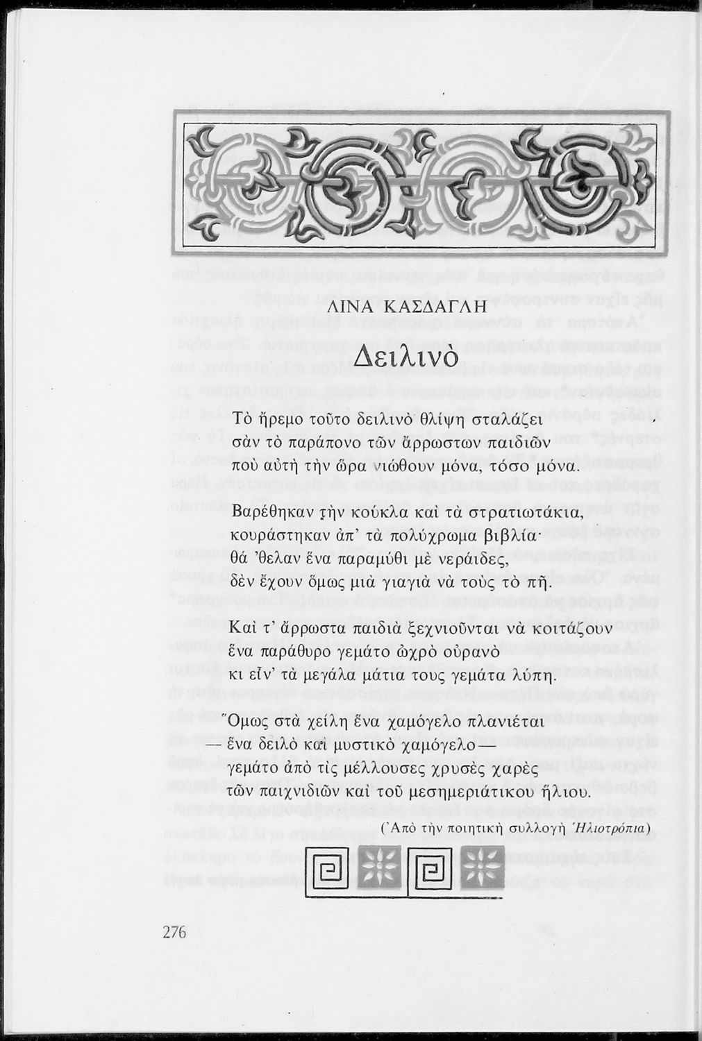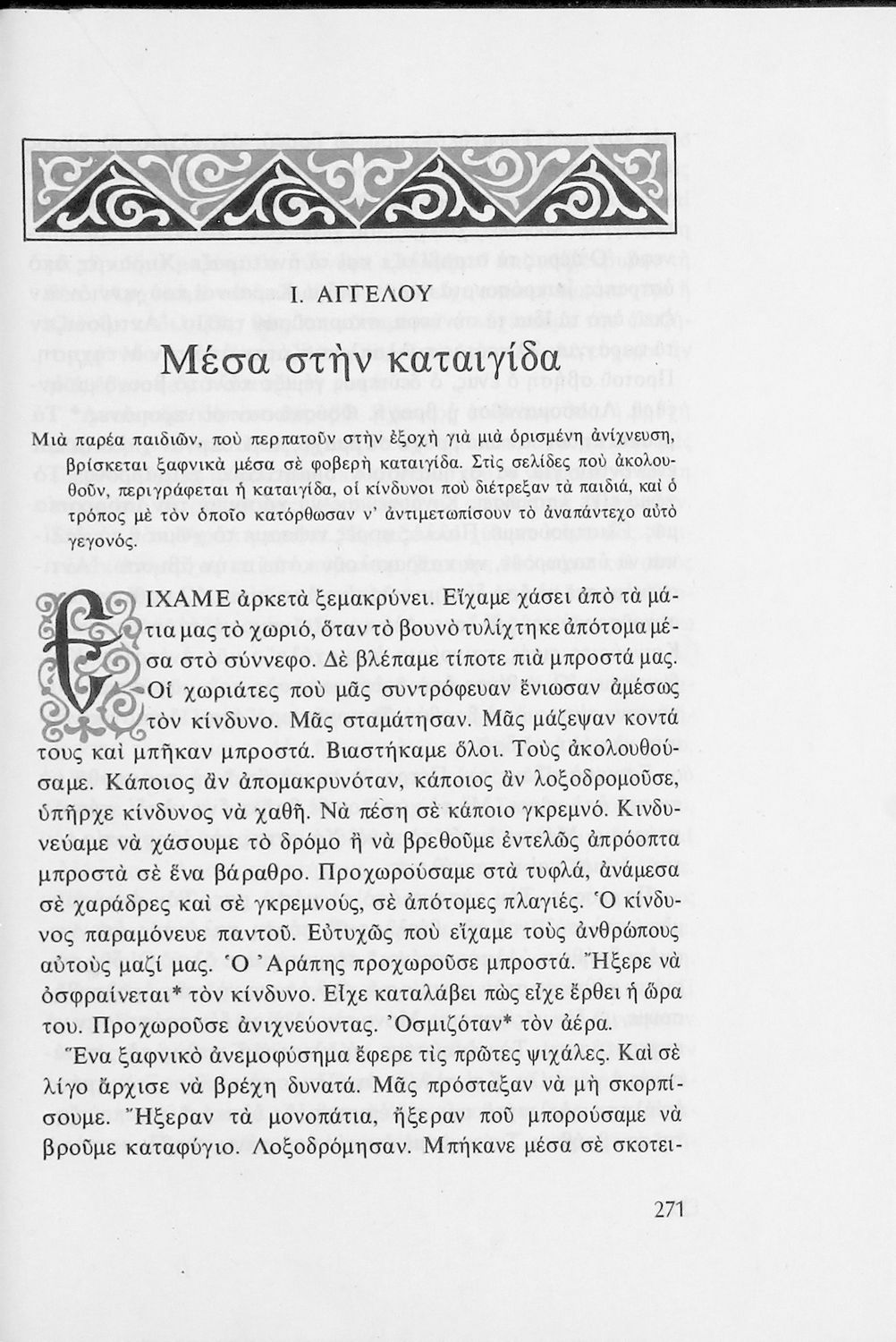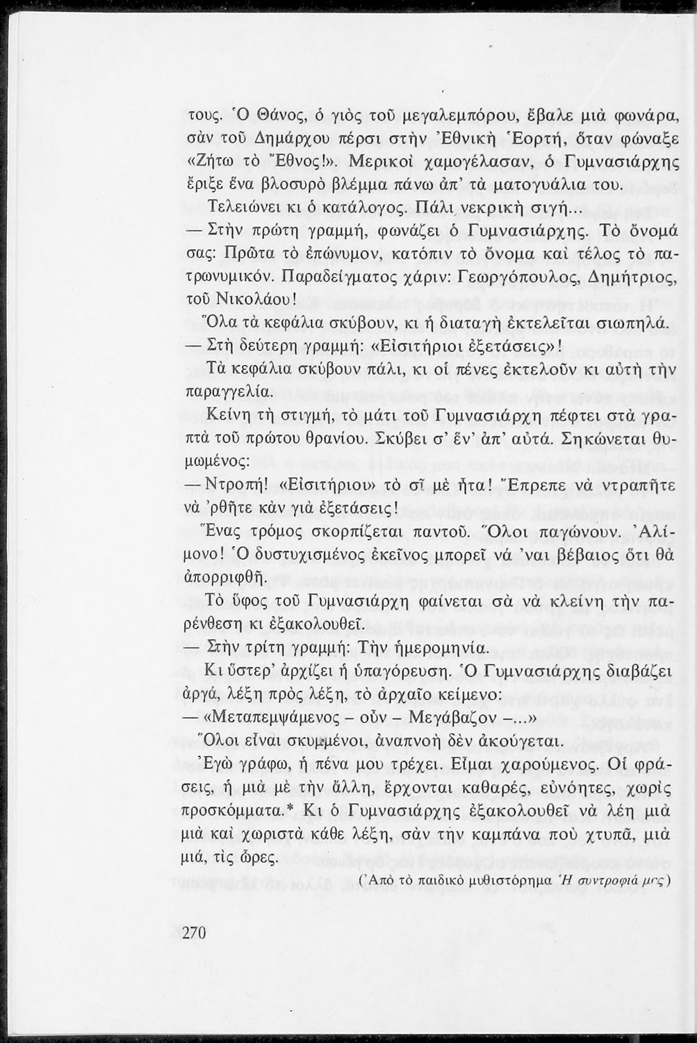 520 ## _aΑναγνωστικό για τις Ε΄ και ΣΤ΄ Δημοτικού που αποτελείται από πεζά και ποιήματα Ελλήνων συγγραφέων εμπνευσμένα από την καθημερινότητα των παιδιών και των οικογενειών τους, την ελληνική ιστορία, τις οικογενειακές στιγμές και εορτές, το παιχνίδι και την εθνική παράδοση, και δημοτικά και ακριτικά τραγούδια. Περιέχει και 5 κείμενα γραμμένα στην καθαρεύουσα με θέματα από τον κοινωνικό και εθνικό βίο.