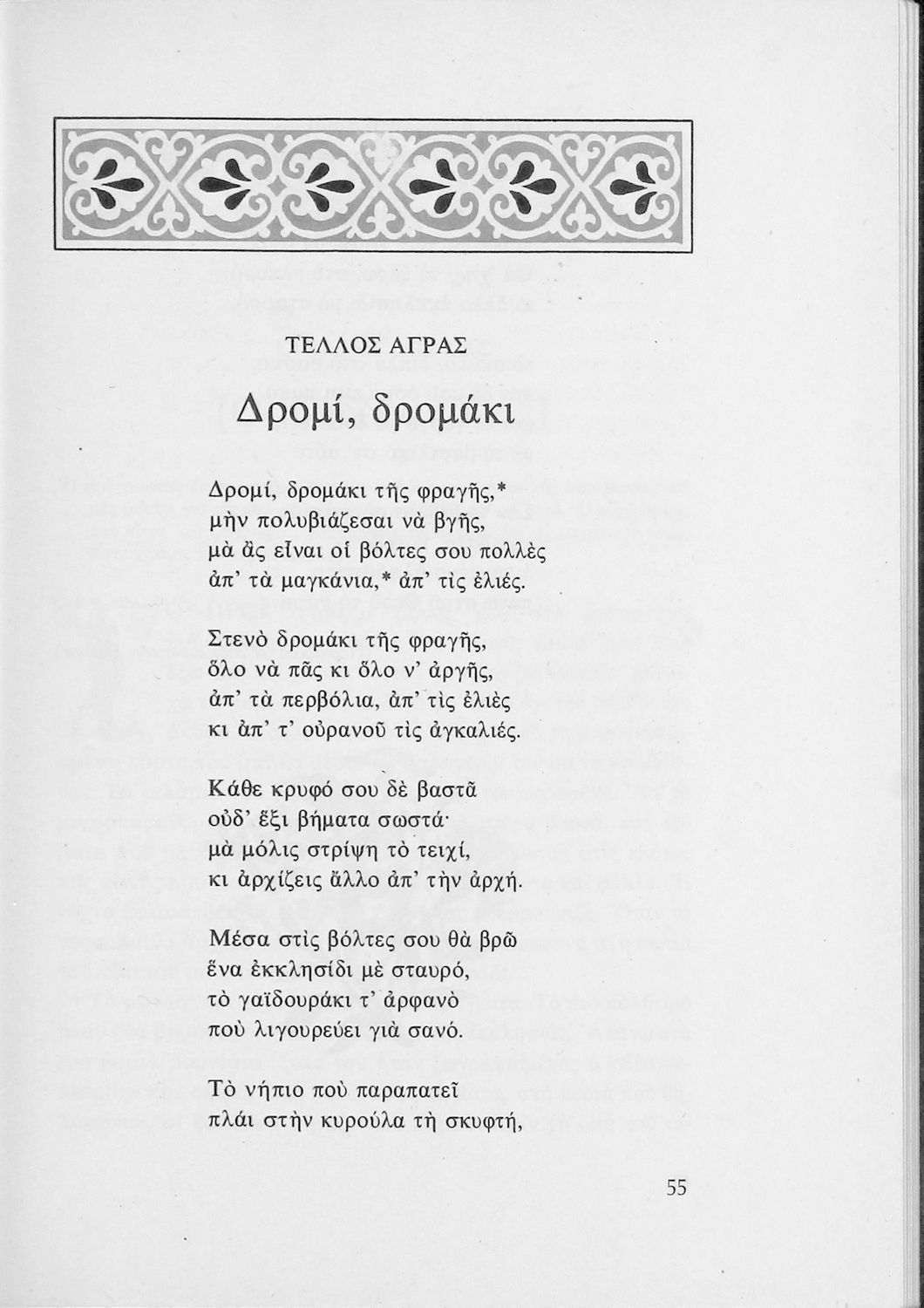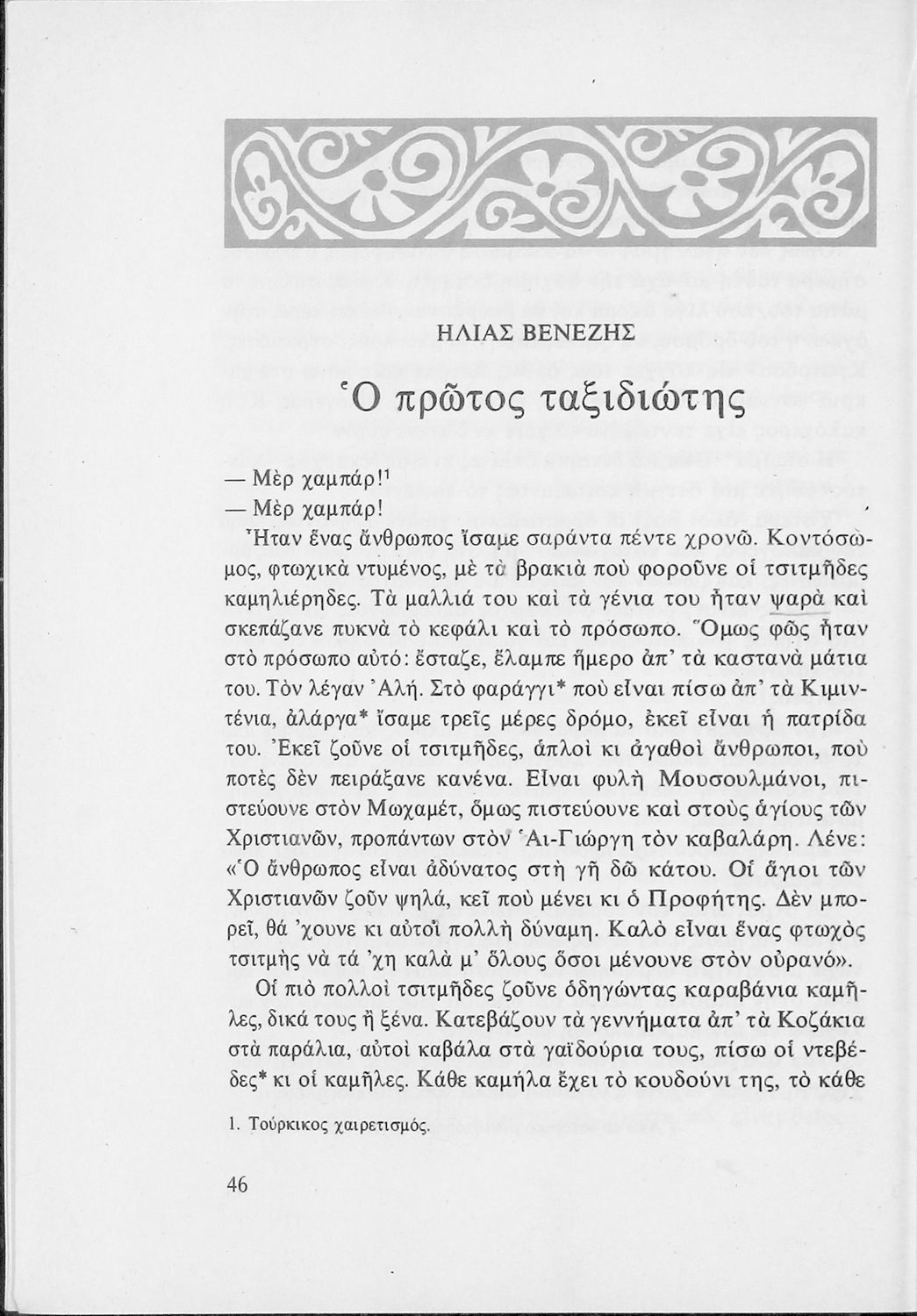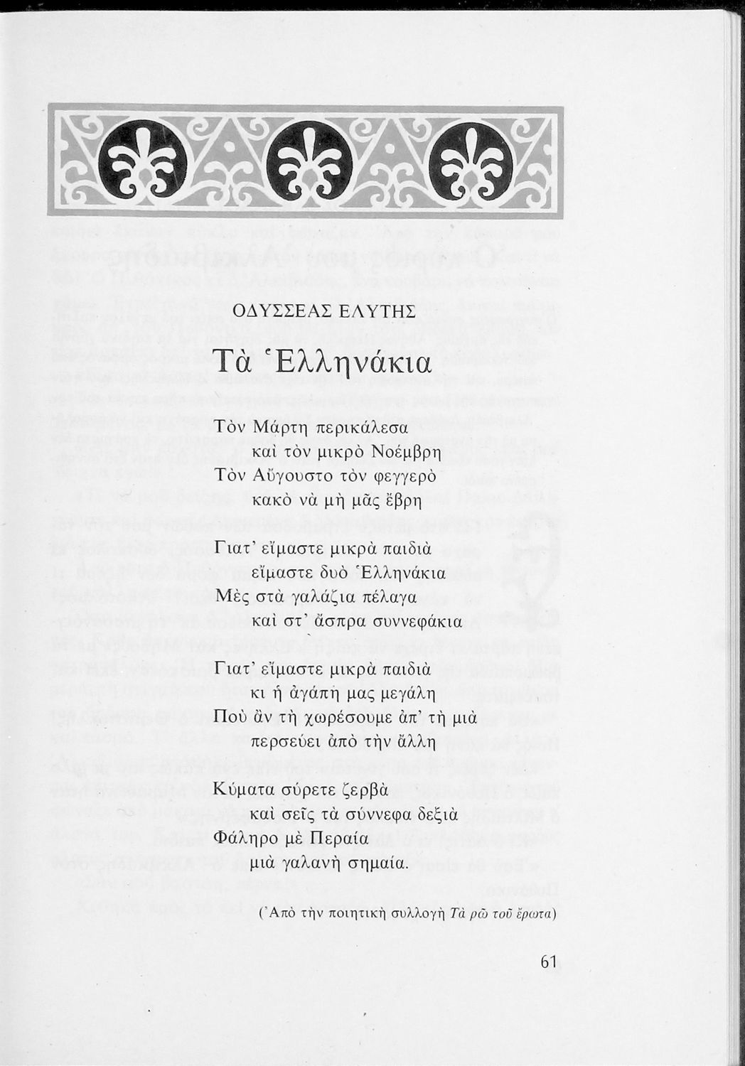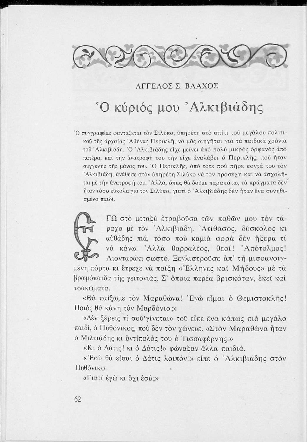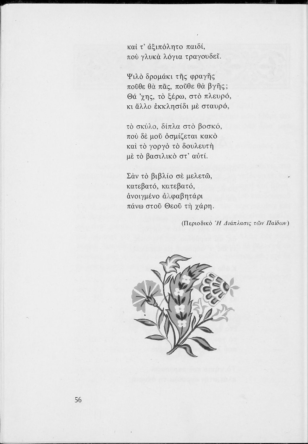 Αναγνωστικό για τις Ε΄ και ΣΤ΄ Δημοτικού που αποτελείται από πεζά και ποιήματα Ελλήνων συγγραφέων εμπνευσμένα από την καθημερινότητα των παιδιών και των οικογενειών τους, την ελληνική ιστορία, τις οικογενειακές στιγμές και εορτές, το παιχνίδι και την εθνική παράδοση, και δημοτικά και ακριτικά τραγούδια. Περιέχει και 5 κείμενα γραμμένα στην καθαρεύουσα με θέματα από τον κοινωνικό και εθνικό βίο.