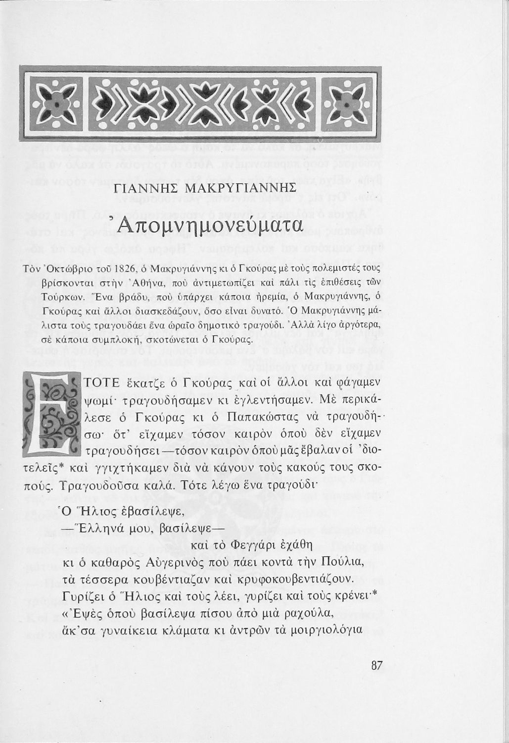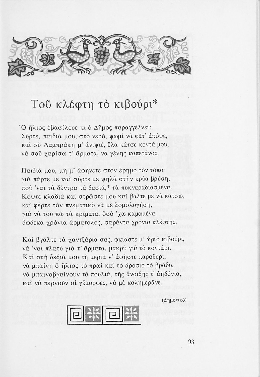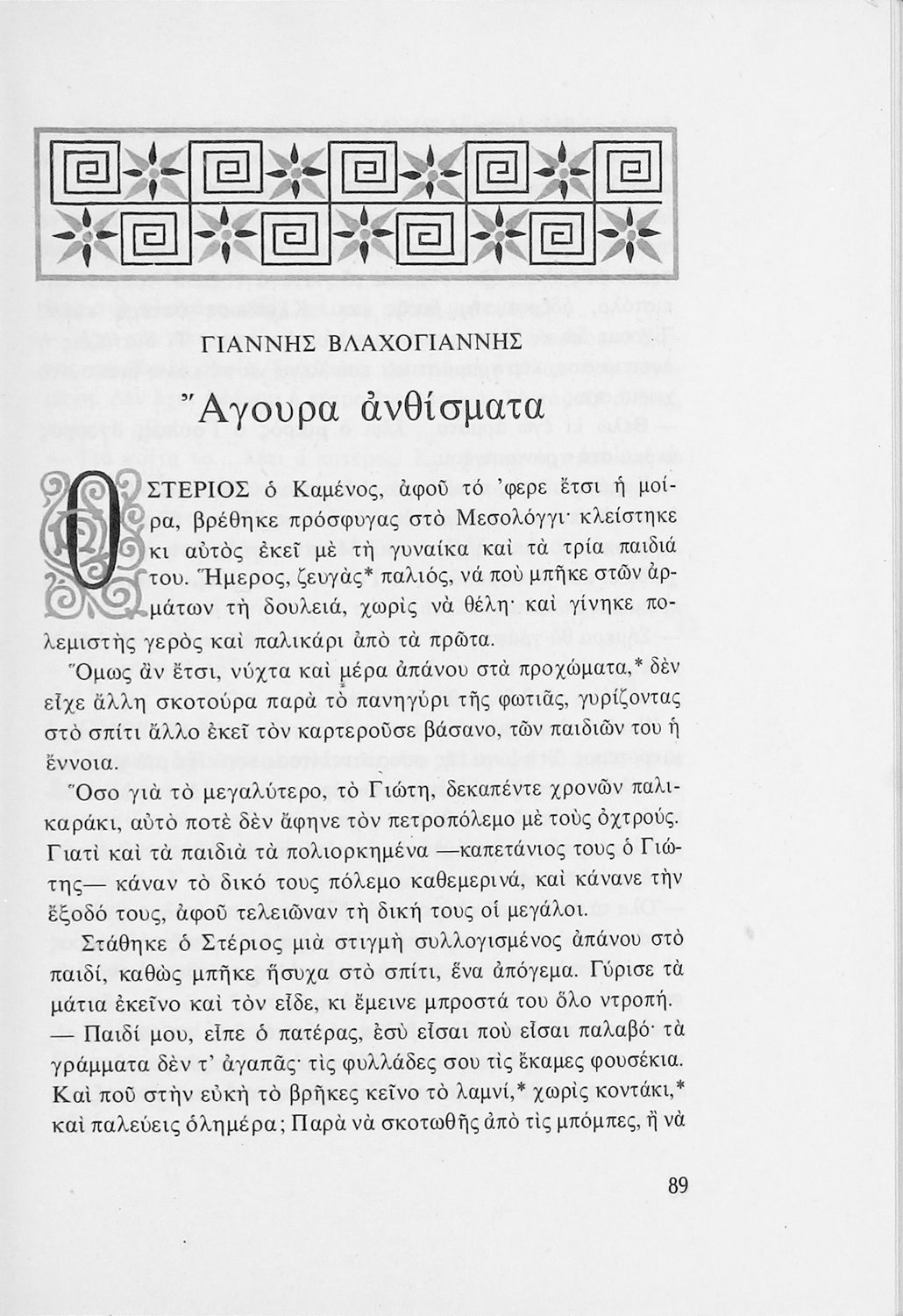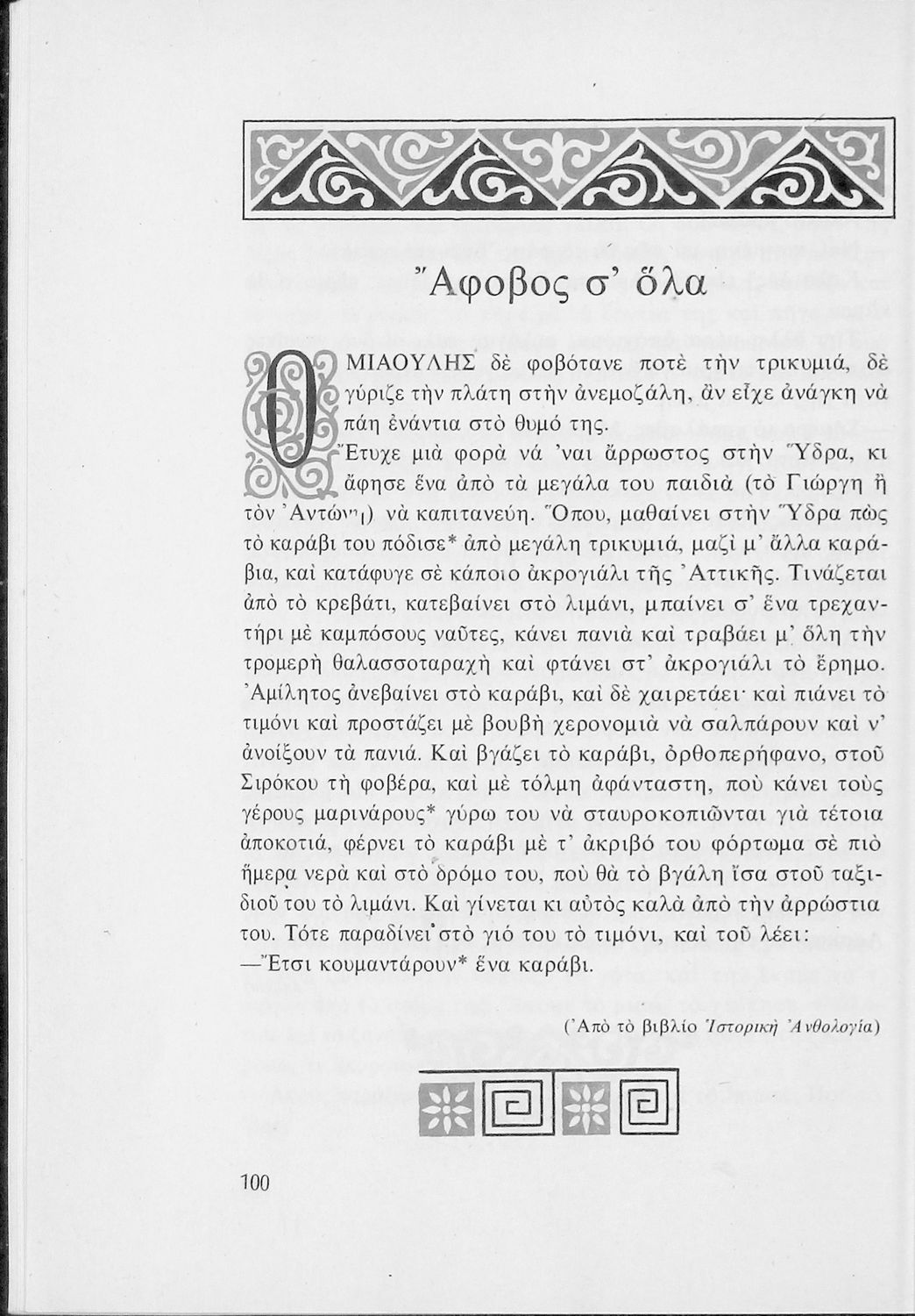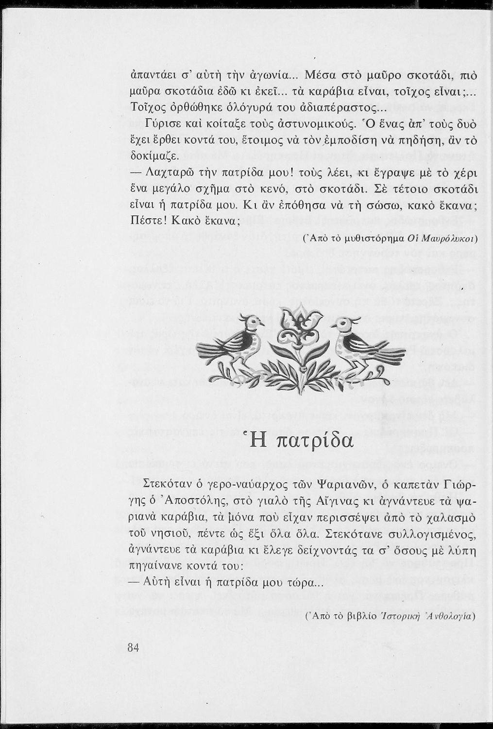 Αναγνωστικό για τις Ε΄ και ΣΤ΄ Δημοτικού που αποτελείται από πεζά και ποιήματα Ελλήνων συγγραφέων εμπνευσμένα από την καθημερινότητα των παιδιών και των οικογενειών τους, την ελληνική ιστορία, τις οικογενειακές στιγμές και εορτές, το παιχνίδι και την εθνική παράδοση, και δημοτικά και ακριτικά τραγούδια. Περιέχει και 5 κείμενα γραμμένα στην καθαρεύουσα με θέματα από τον κοινωνικό και εθνικό βίο.