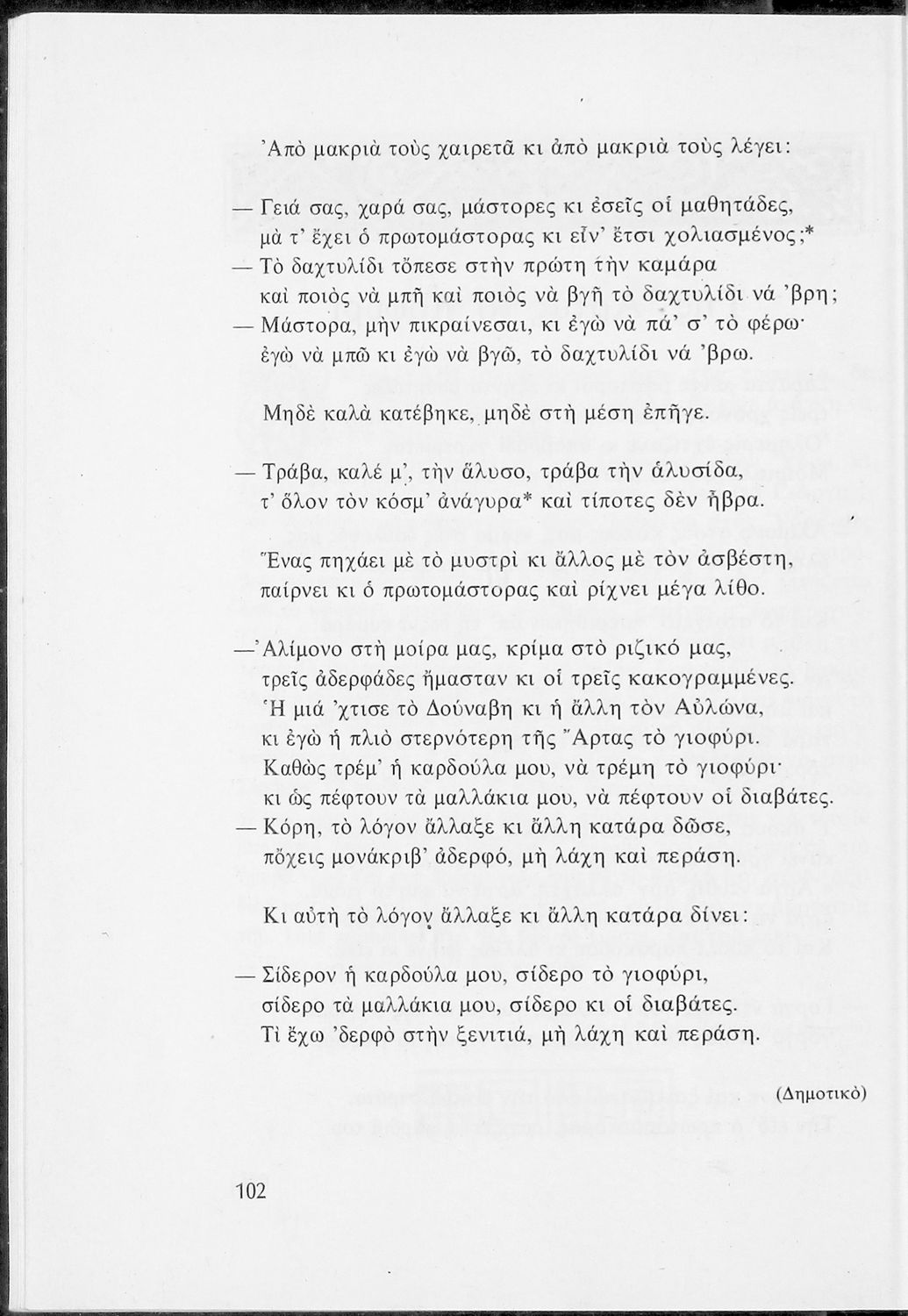Βαθμίδα εκπαίδευσης: Πρωτοβάθμια Τάξη: Ε' Δημοτικού / ΣΤ' Δημοτικού Μάθημα: Νέα Ελληνικά Γλώσσα: Δημοτική, Καθαρεύουσα Παρουσίαση περιεχομένου: Αναγνωστικό για τις Ε΄ και ΣΤ΄ Δημοτικού που αποτελείται από πεζά και ποιήματα Ελλήνων συγγραφέων εμπνευσμένα από την καθημερινότητα των παιδιών και των οικογενειών τους, την ελληνική ιστορία, τις οικογενειακές στιγμές και εορτές, το παιχνίδι και την εθνική παράδοση, και δημοτικά και ακριτικά τραγούδια. Περιέχει και 5 κείμενα γραμμένα στην καθαρεύουσα με θέματα από τον κοινωνικό και εθνικό βίο. |