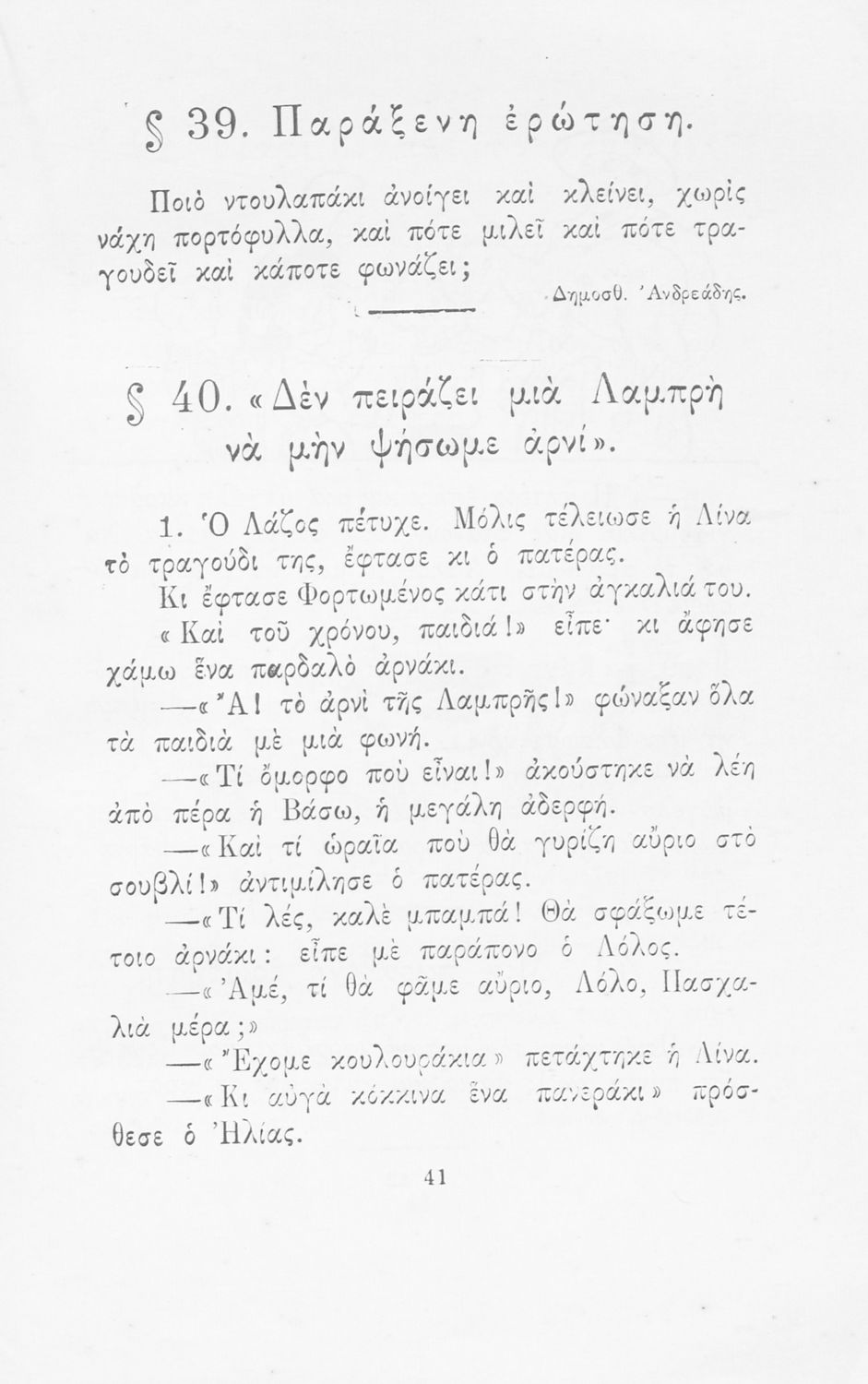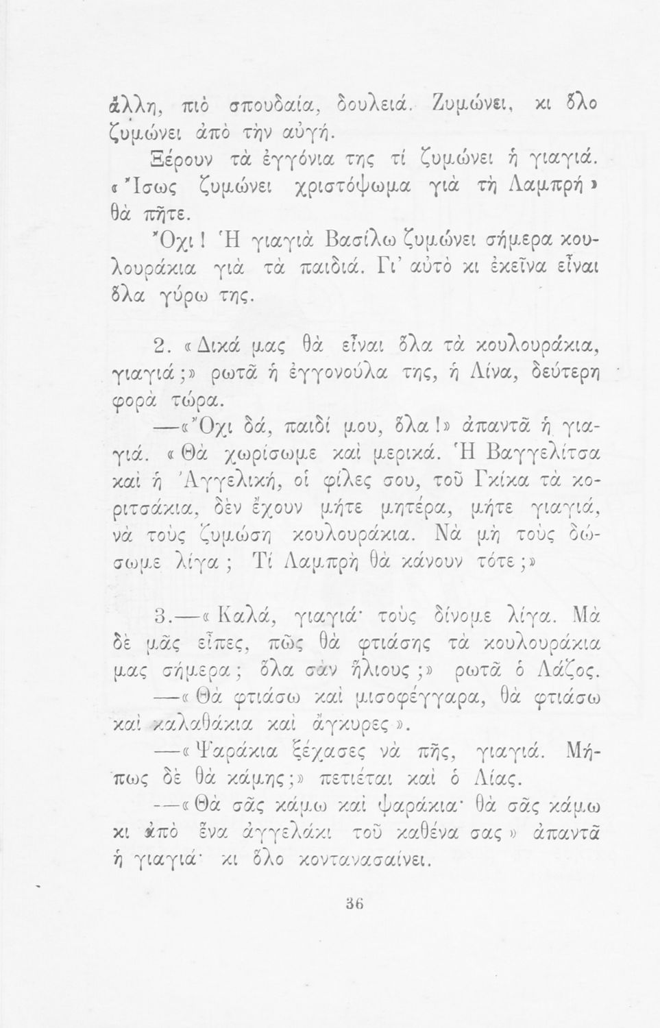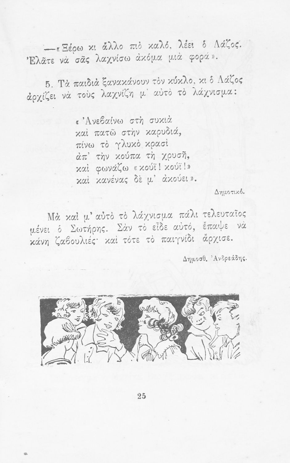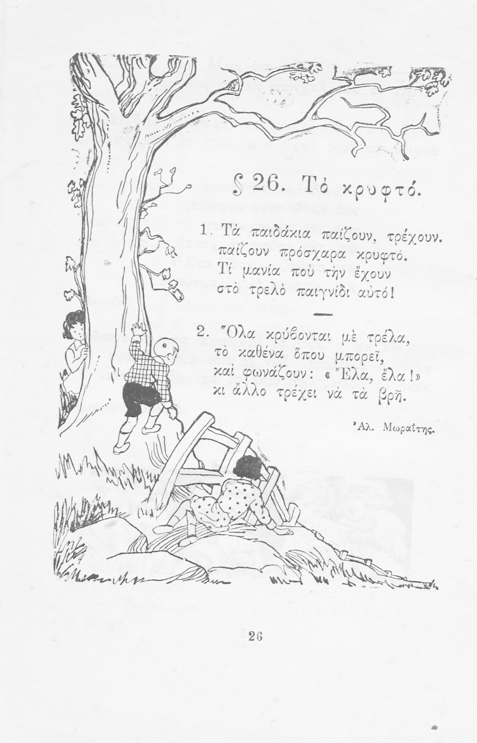 Αναγνωστικό [Α΄ Δημοτικού] που περιλαμβάνει ποιηματάκια και ιστοριούλες και αντλεί τη θεματολογία του από καθημερινά περιστατικά, την ελληνική ύπαιθρο και την ελληνική οικογένεια.