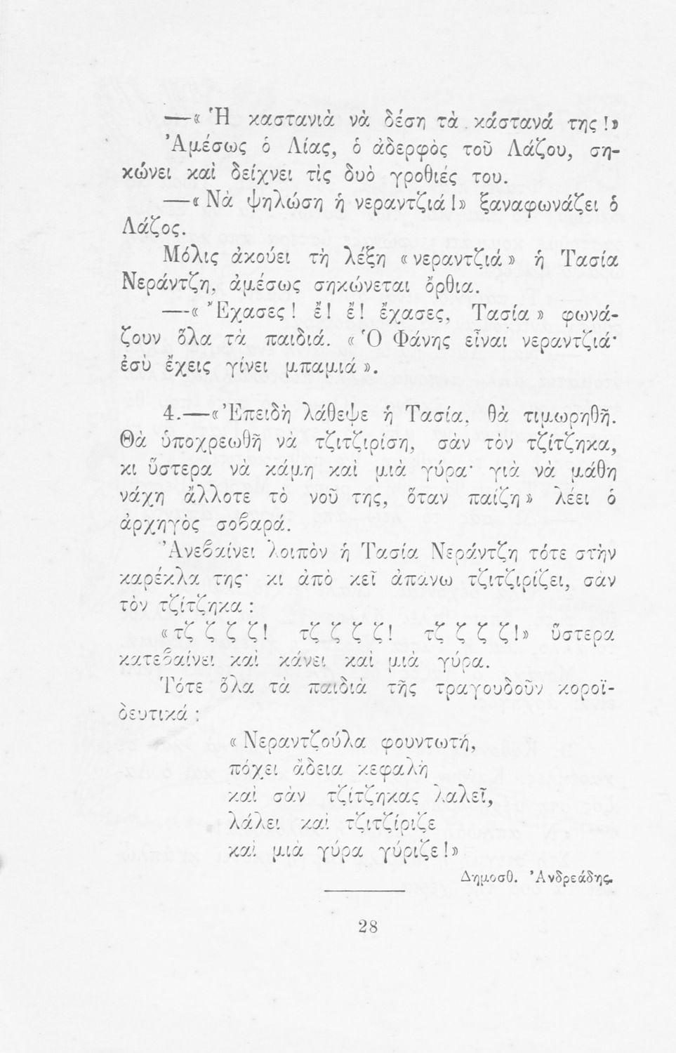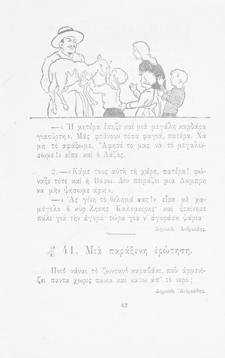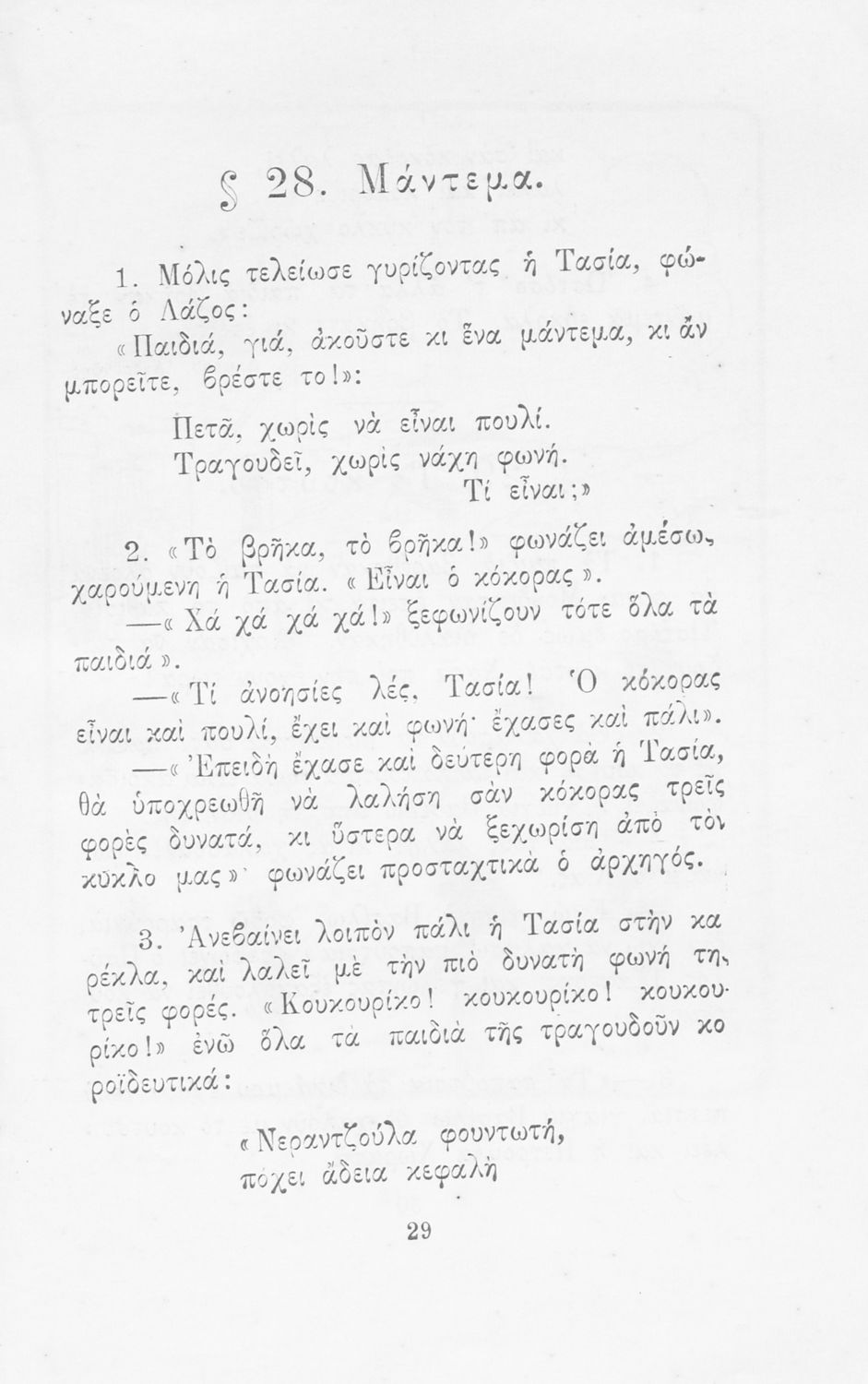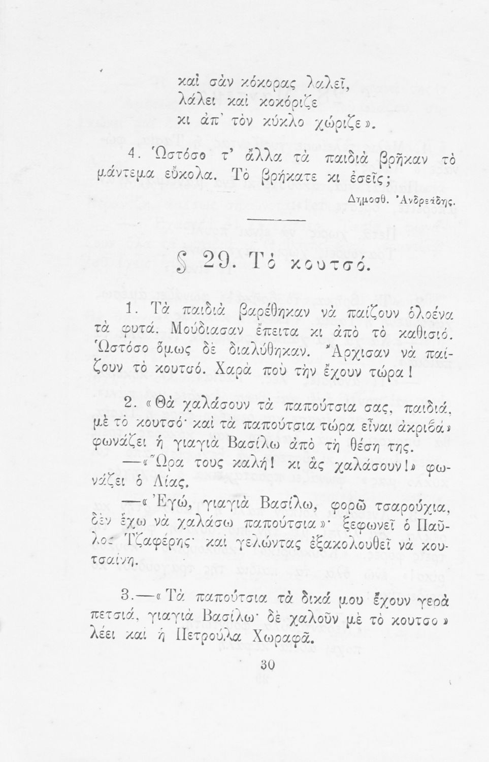 Αναγνωστικό [Α΄ Δημοτικού] που περιλαμβάνει ποιηματάκια και ιστοριούλες και αντλεί τη θεματολογία του από καθημερινά περιστατικά, την ελληνική ύπαιθρο και την ελληνική οικογένεια.