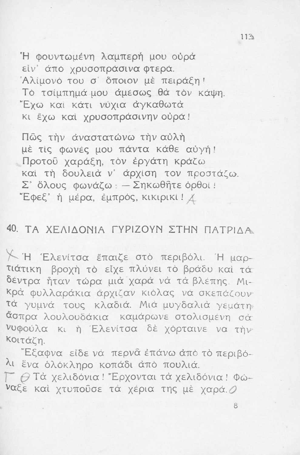 Αναγνωστικό Γ' Δημοτικού που περιέχει πεζά και ποιήματα εμπνευσμένα από τη θρησκευτική, εθνική, κοινωνική και ατομική ζωή, και την ελληνική φύση, ιστορία και μυθολογία.