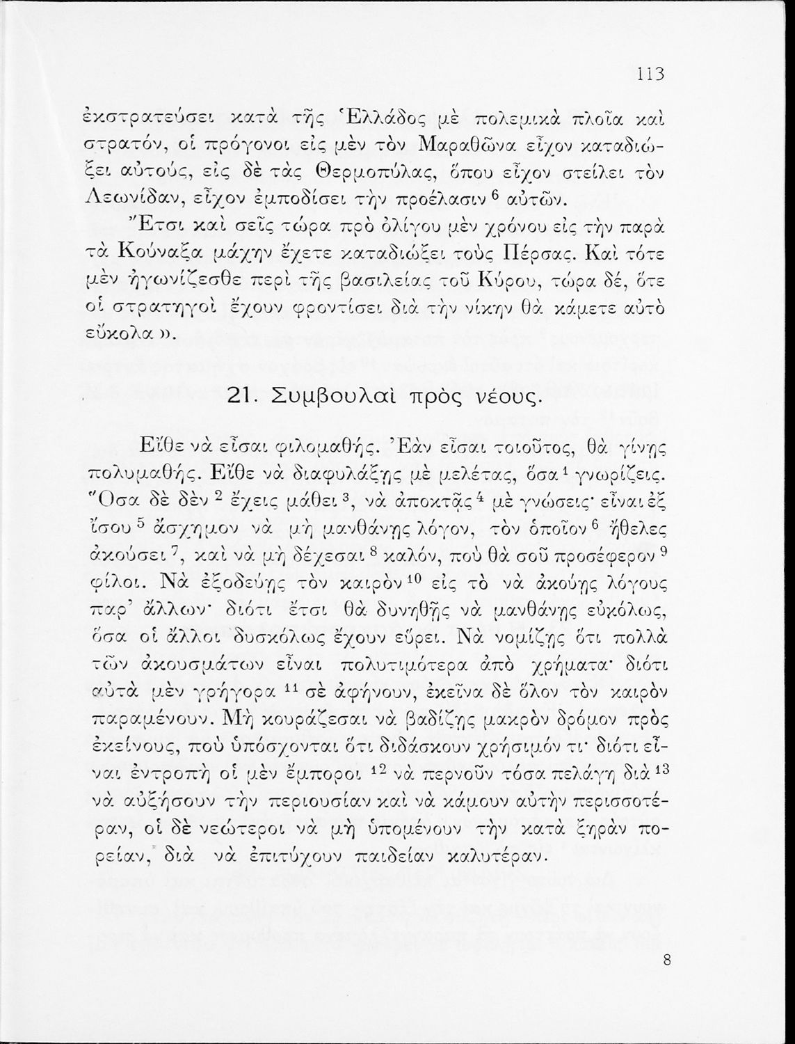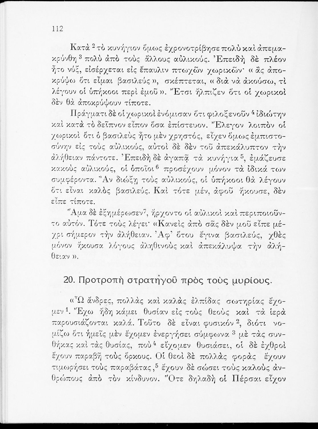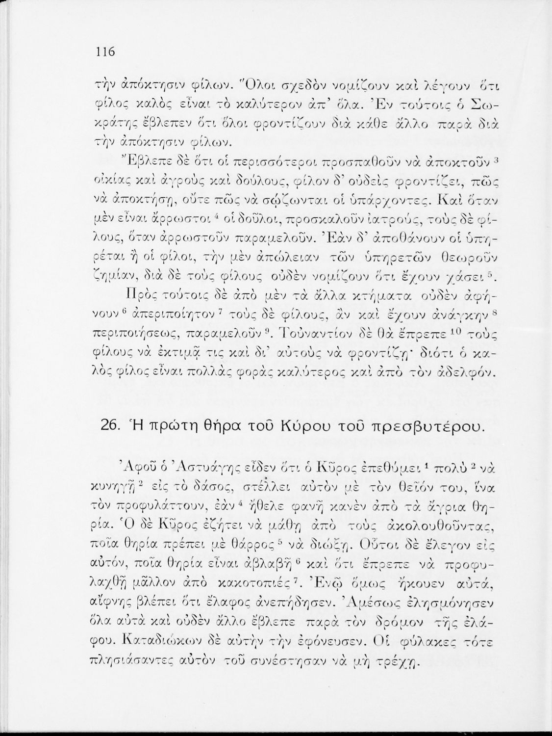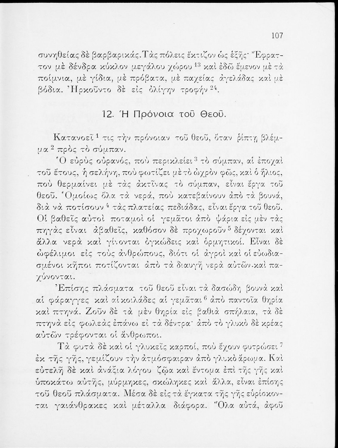 Σχολικό Εγχειρίδιο Αρχαίων Ελληνικών που περιλαμβάνει κείμενα προσαρμοσμένα στη διδασκαλία των γραμματικών και συντακτικών φαινομένων, και ερμηνευτικές και λεξιλογικές σημειώσεις.