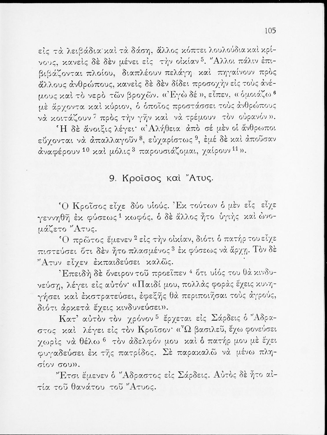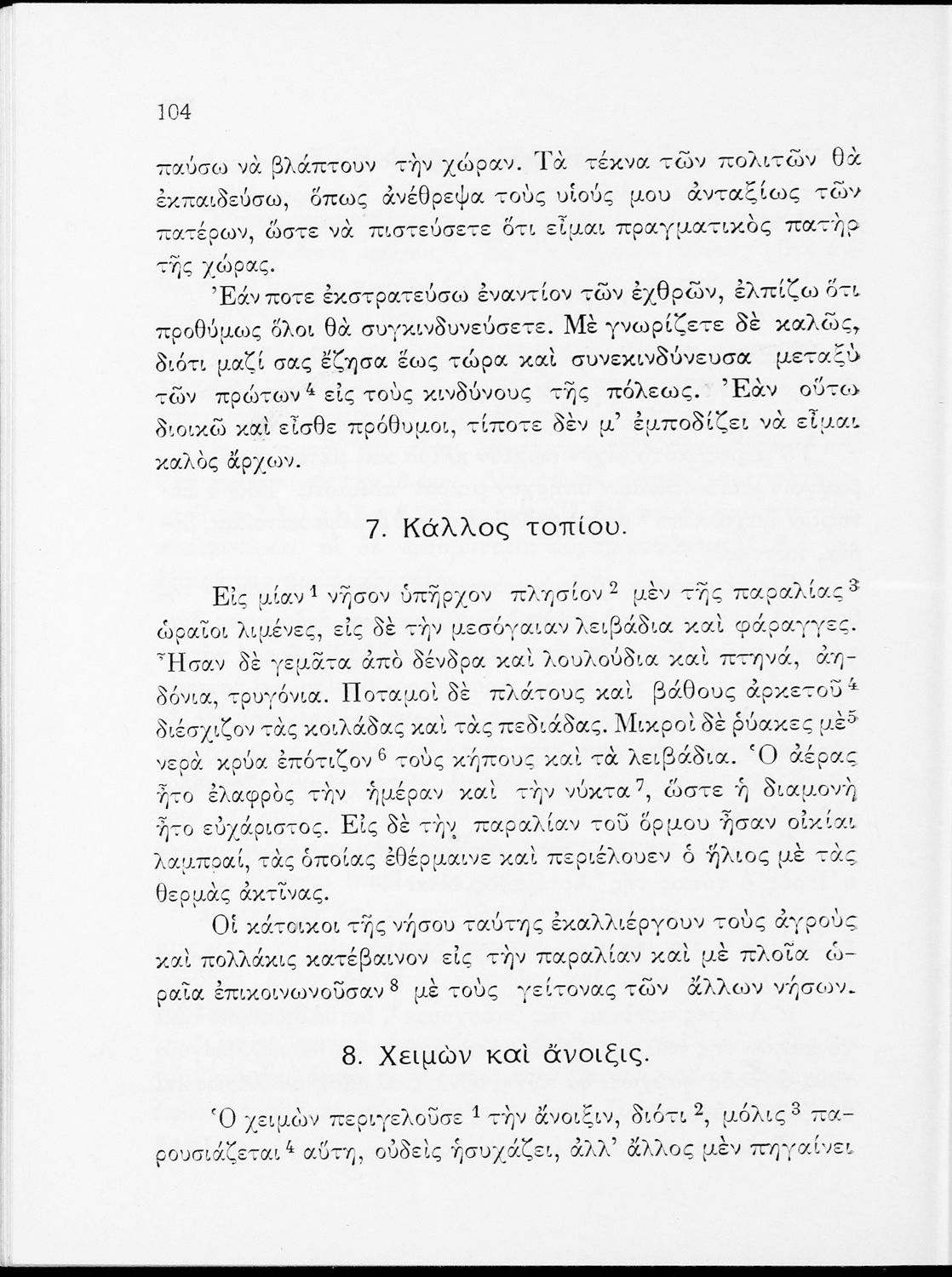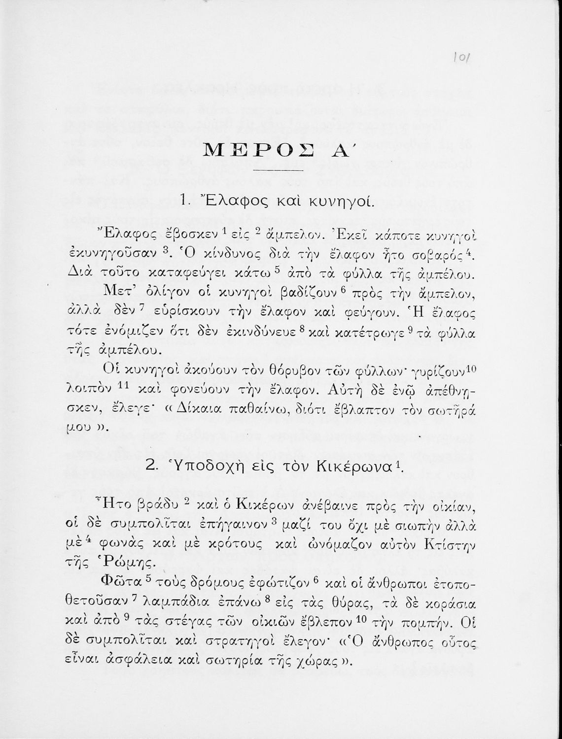 Σχολικό Εγχειρίδιο Αρχαίων Ελληνικών που περιλαμβάνει κείμενα προσαρμοσμένα στη διδασκαλία των γραμματικών και συντακτικών φαινομένων, και ερμηνευτικές και λεξιλογικές σημειώσεις.