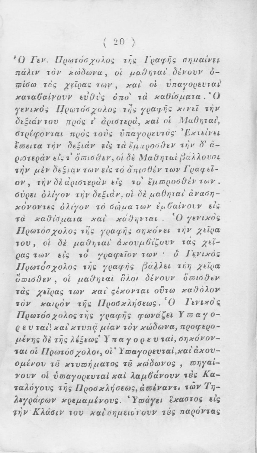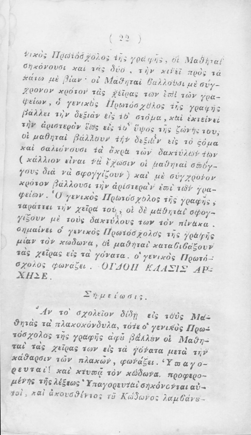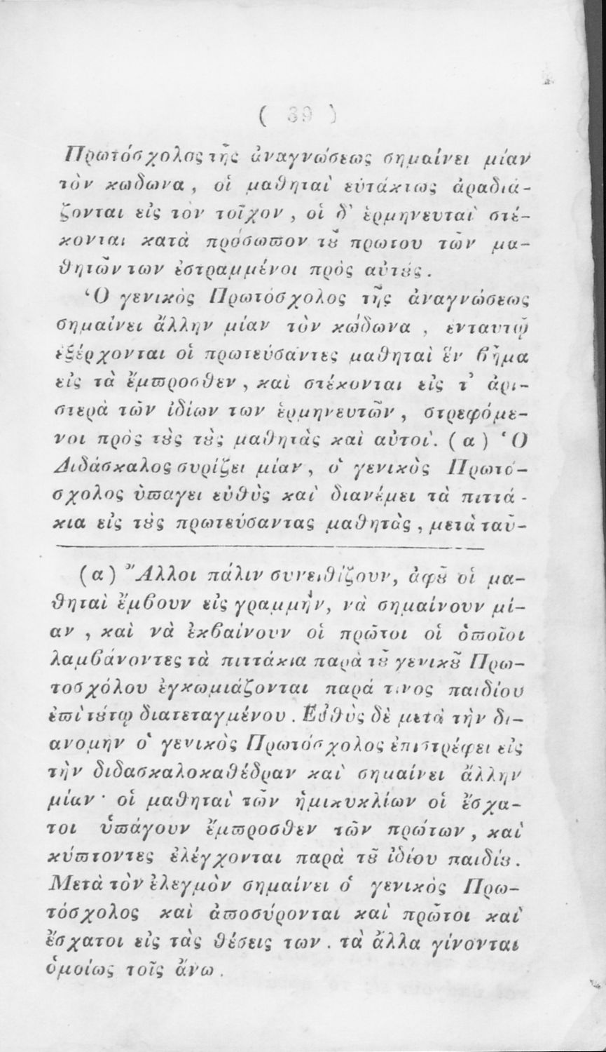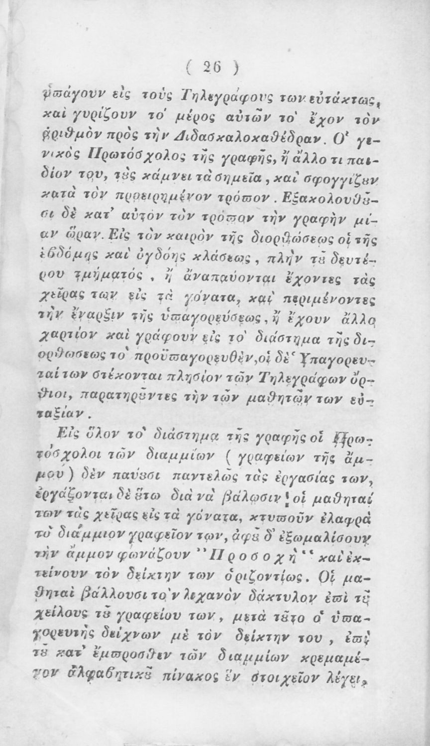 Παρουσίαση περιεχομένου: Παιδαγωγικό βοήθημα που περιλαμβάνει τις γενικές αρχές της αλληλοδιδακτικής μεθόδου διδασκαλίας που εφαρμοζόταν κατά την διάρκεια του 19ου αιώνα και εμφανίστηκε στην Ελλάδα κατά την δεκαετία του 1830. Ο δάσκαλος όριζε κάποιους μαθητές, συνήθως τους μεγαλύτερους και τους καλύτερους σε επιδόσεις (τους λεγόμενους πρωτόσχολους), για να τον βοηθήσουν με την διδασκαλία του μαθήματος.