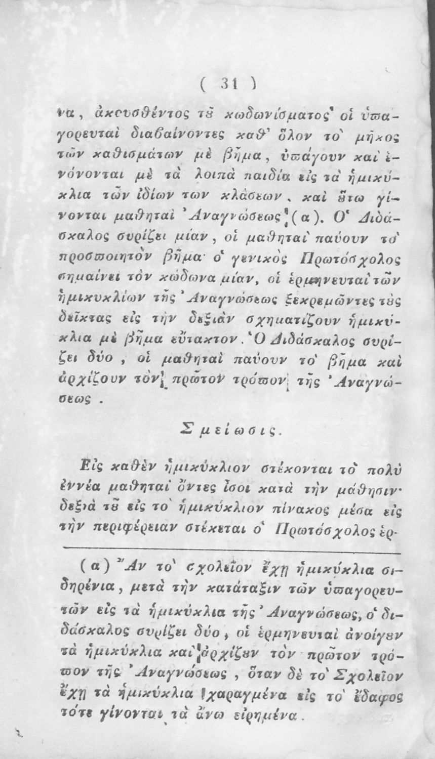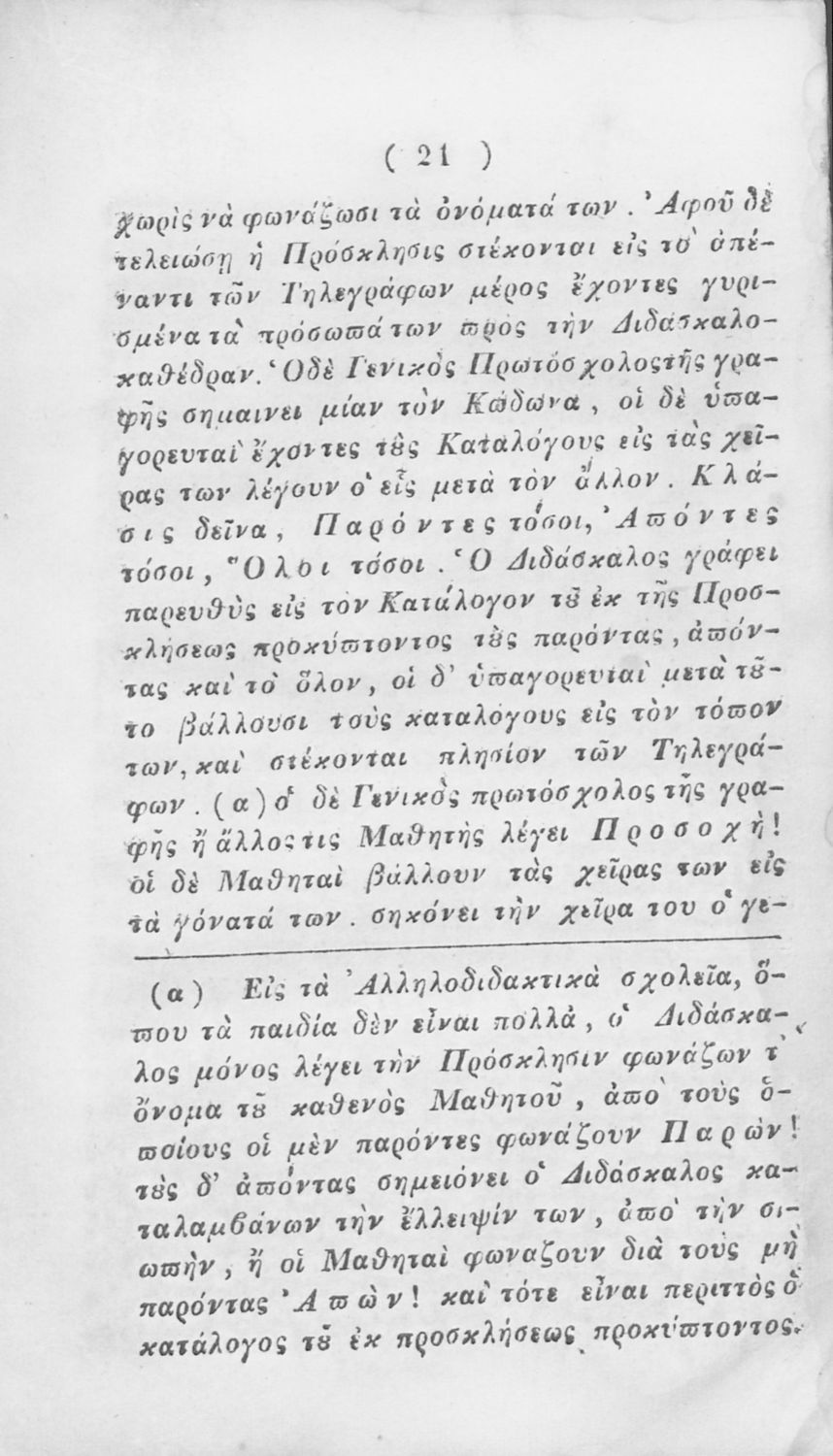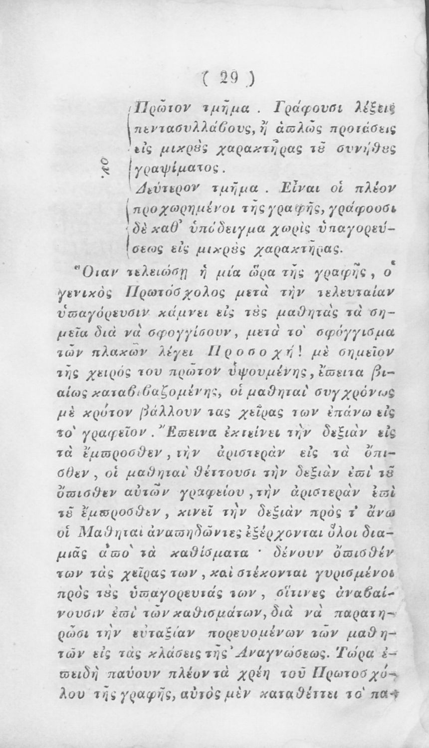 Παρουσίαση περιεχομένου: Παιδαγωγικό βοήθημα που περιλαμβάνει τις γενικές αρχές της αλληλοδιδακτικής μεθόδου διδασκαλίας που εφαρμοζόταν κατά την διάρκεια του 19ου αιώνα και εμφανίστηκε στην Ελλάδα κατά την δεκαετία του 1830. Ο δάσκαλος όριζε κάποιους μαθητές, συνήθως τους μεγαλύτερους και τους καλύτερους σε επιδόσεις (τους λεγόμενους πρωτόσχολους), για να τον βοηθήσουν με την διδασκαλία του μαθήματος.