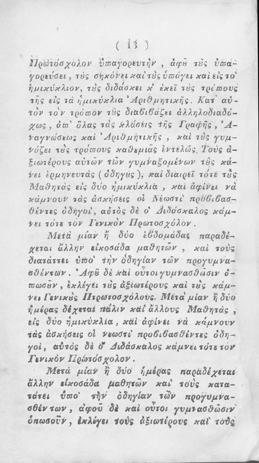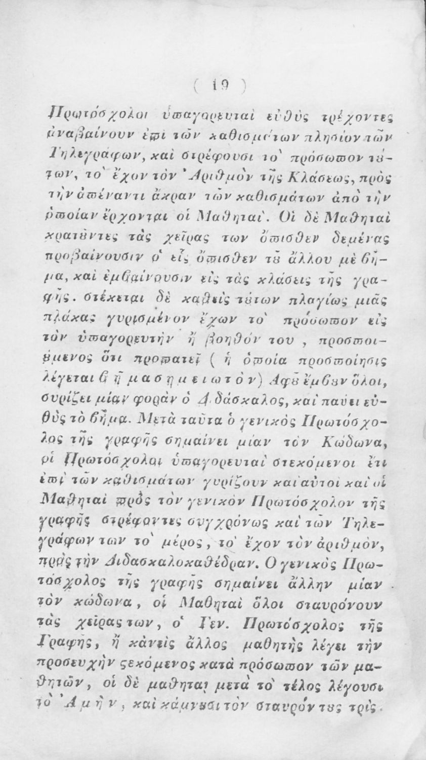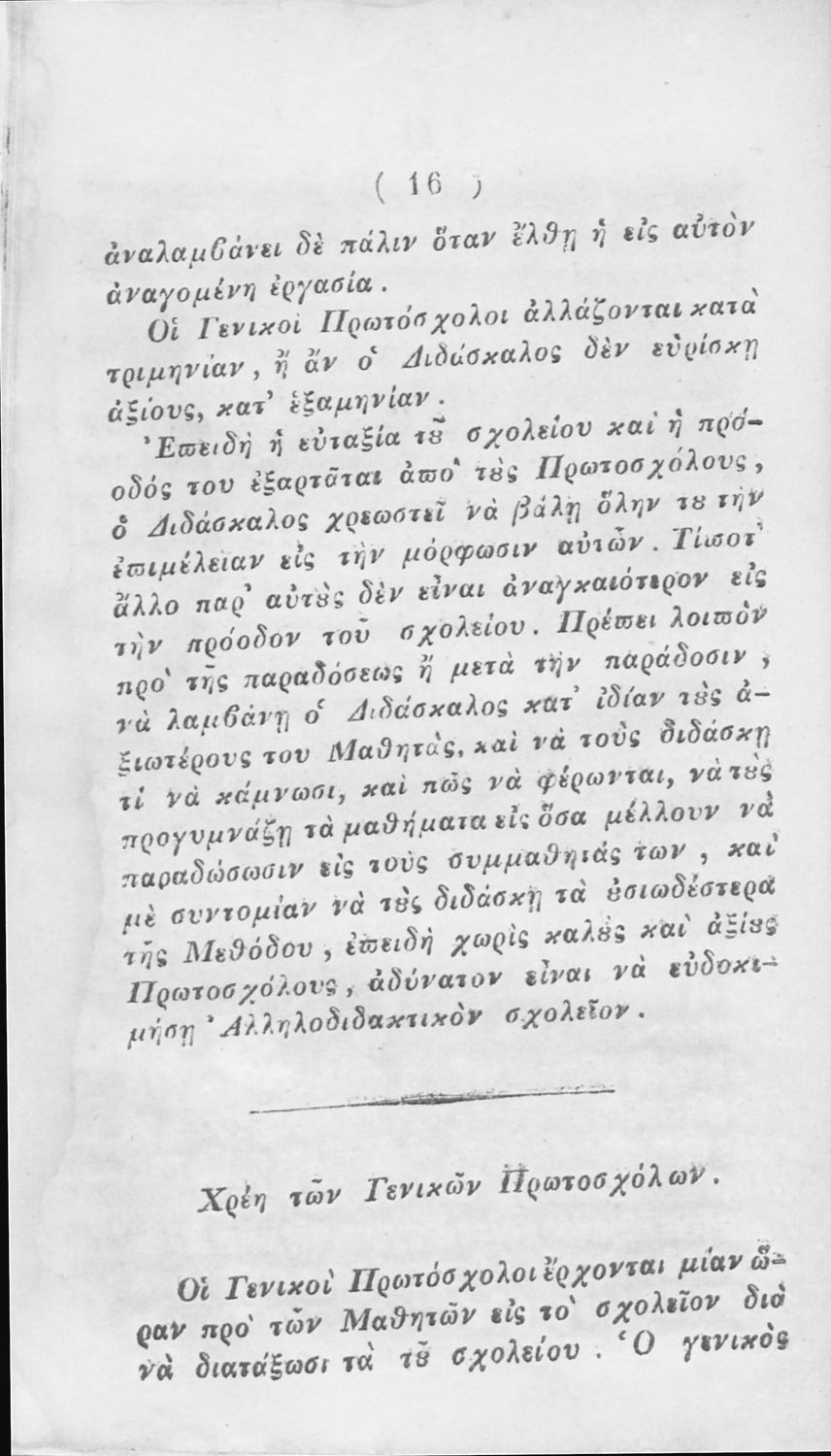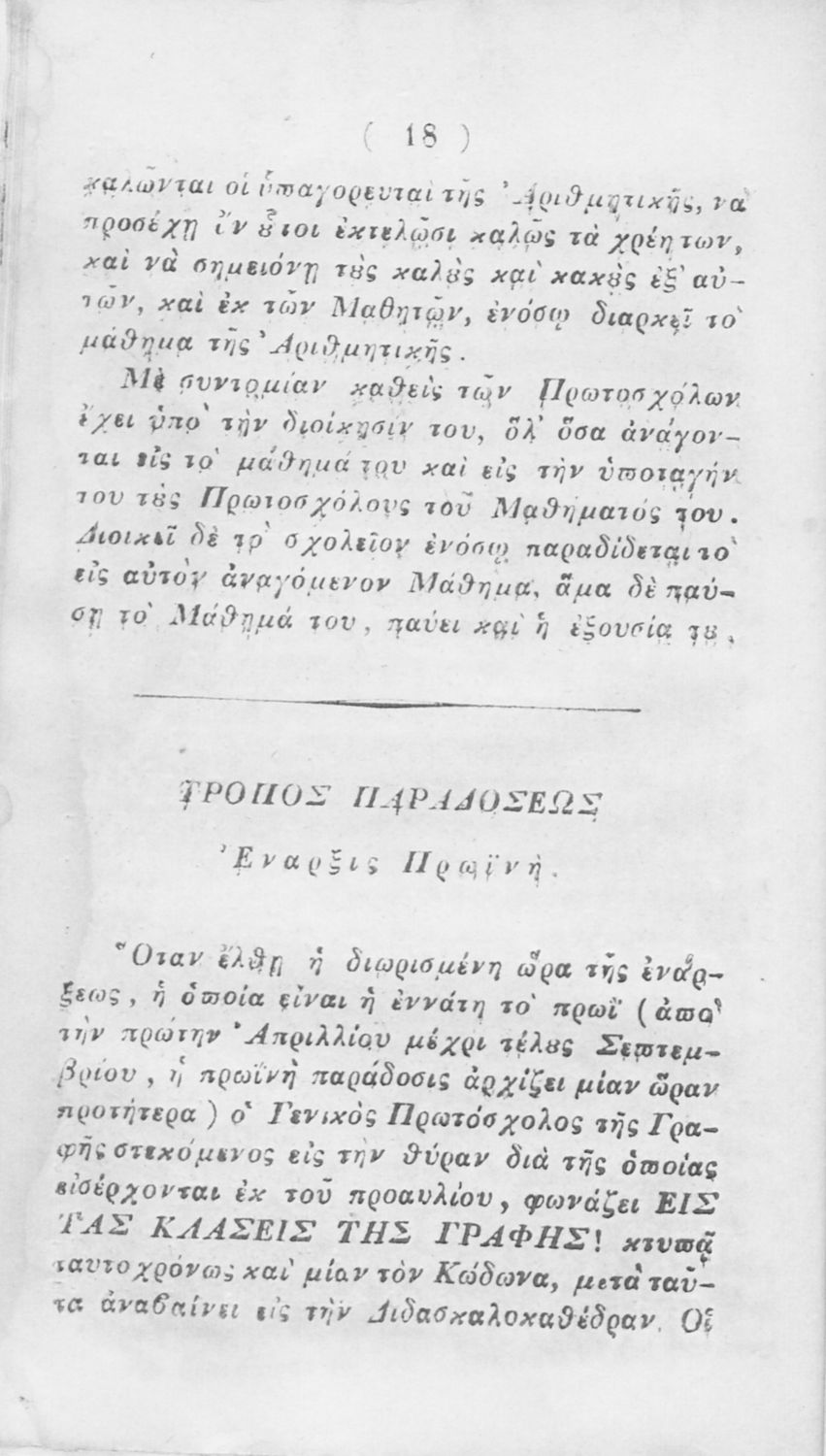 Γλώσσα: Καθαρεύουσα Παρουσίαση περιεχομένου: Παιδαγωγικό βοήθημα που περιλαμβάνει τις γενικές αρχές της αλληλοδιδακτικής μεθόδου διδασκαλίας που εφαρμοζόταν κατά την διάρκεια του 19ου αιώνα και εμφανίστηκε στην Ελλάδα κατά την δεκαετία του 1830. Ο δάσκαλος όριζε κάποιους μαθητές, συνήθως τους μεγαλύτερους και τους καλύτερους σε επιδόσεις (τους λεγόμενους πρωτόσχολους), για να τον βοηθήσουν με την διδασκαλία του μαθήματος. |