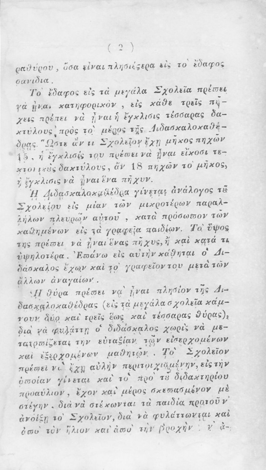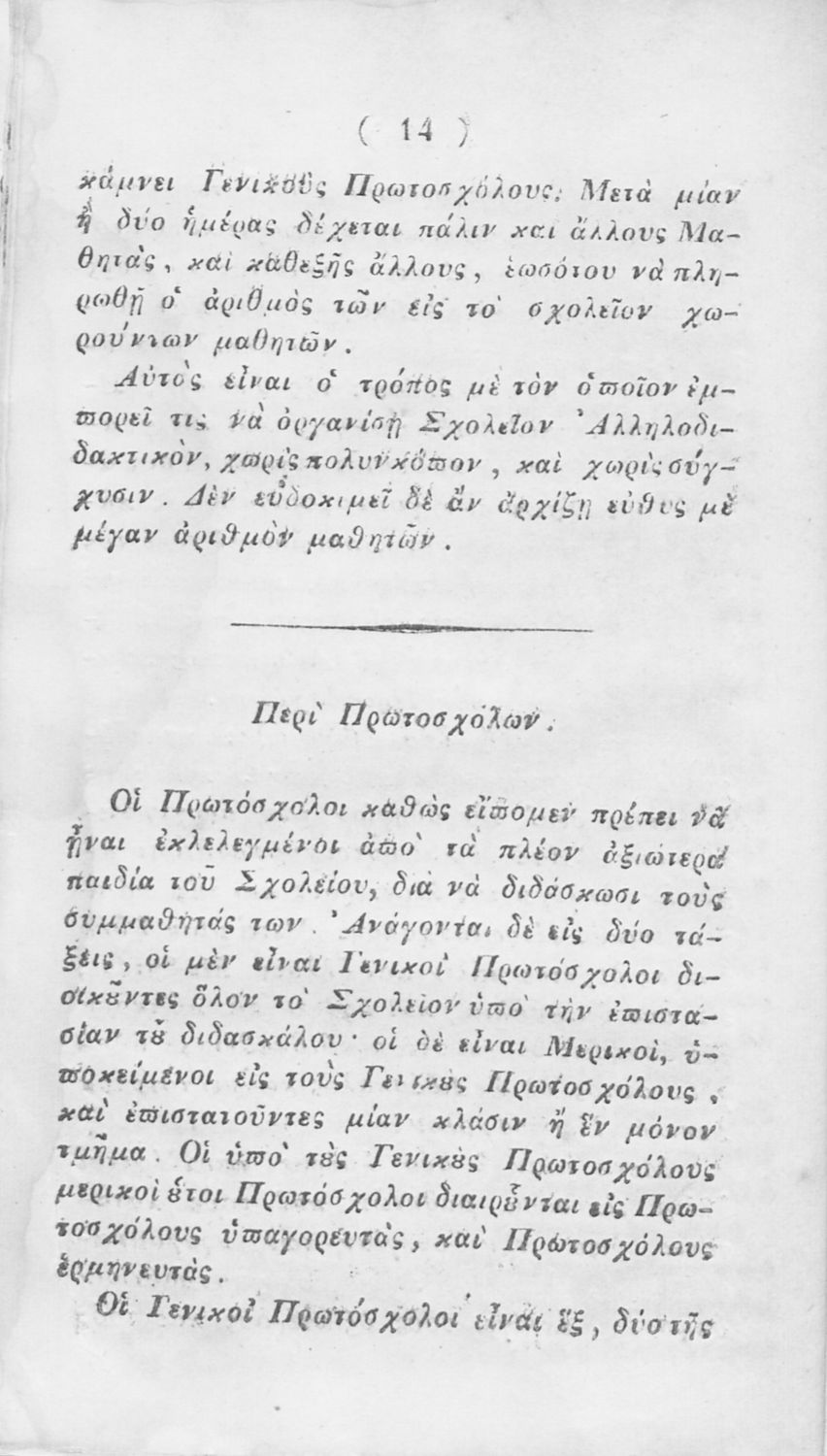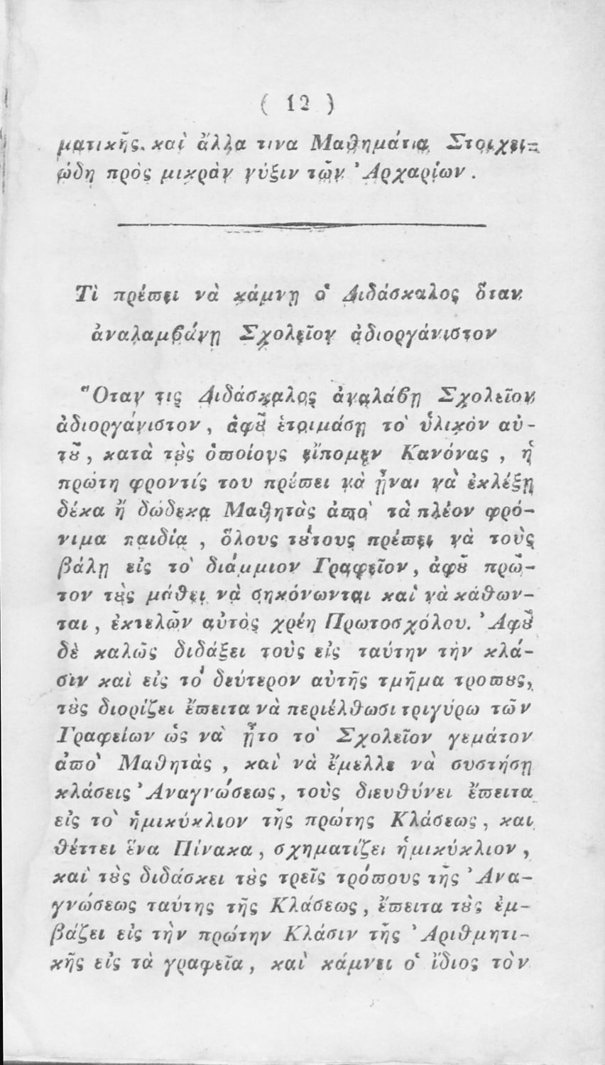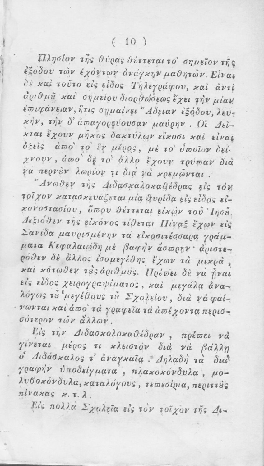 Γλώσσα: Καθαρεύουσα Παρουσίαση περιεχομένου: Παιδαγωγικό βοήθημα που περιλαμβάνει τις γενικές αρχές της αλληλοδιδακτικής μεθόδου διδασκαλίας που εφαρμοζόταν κατά την διάρκεια του 19ου αιώνα και εμφανίστηκε στην Ελλάδα κατά την δεκαετία του 1830. Ο δάσκαλος όριζε κάποιους μαθητές, συνήθως τους μεγαλύτερους και τους καλύτερους σε επιδόσεις (τους λεγόμενους πρωτόσχολους), για να τον βοηθήσουν με την διδασκαλία του μαθήματος. |