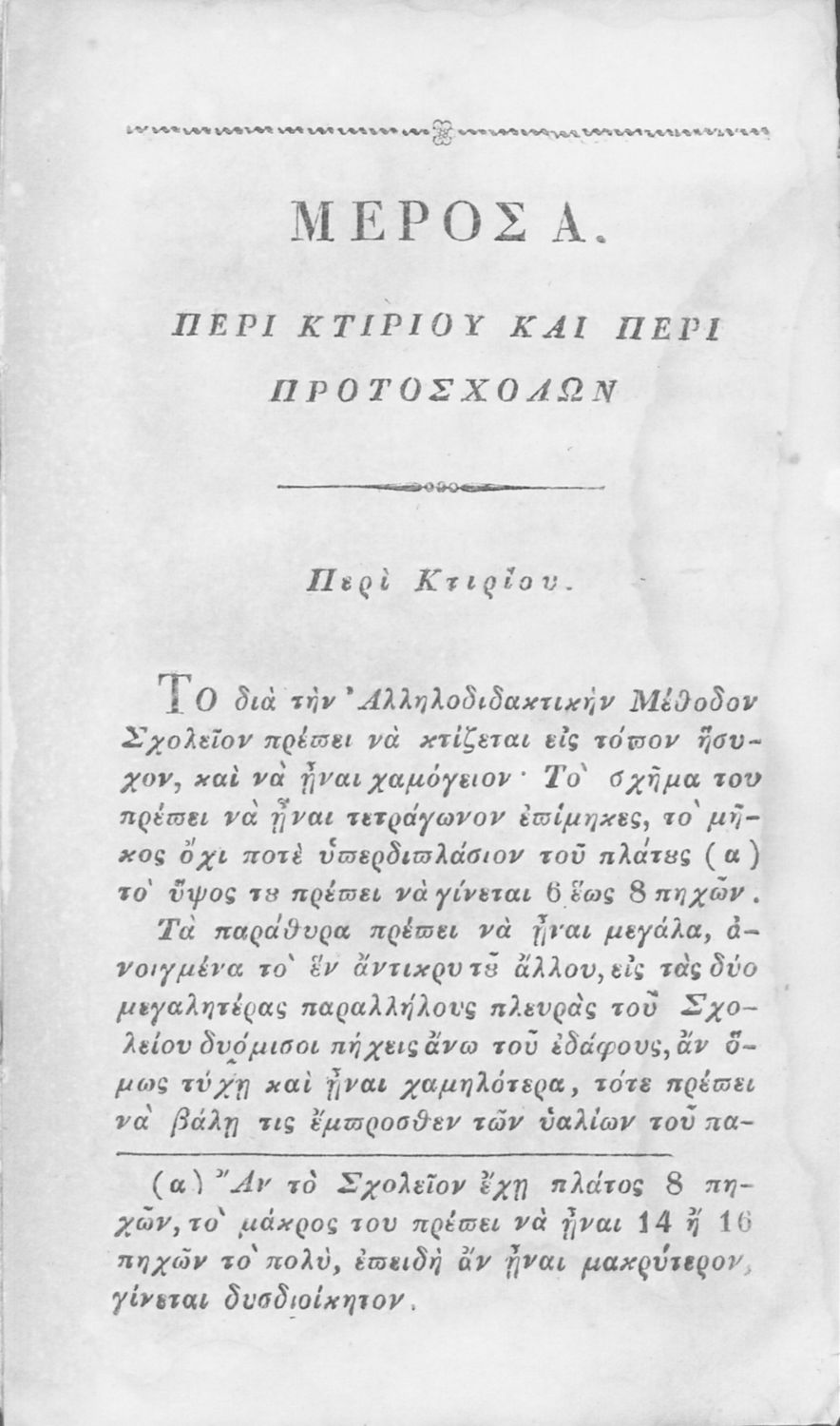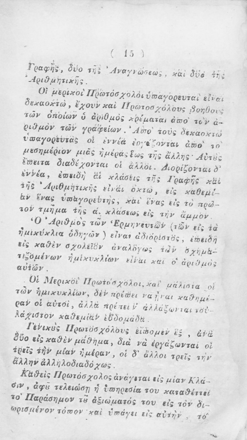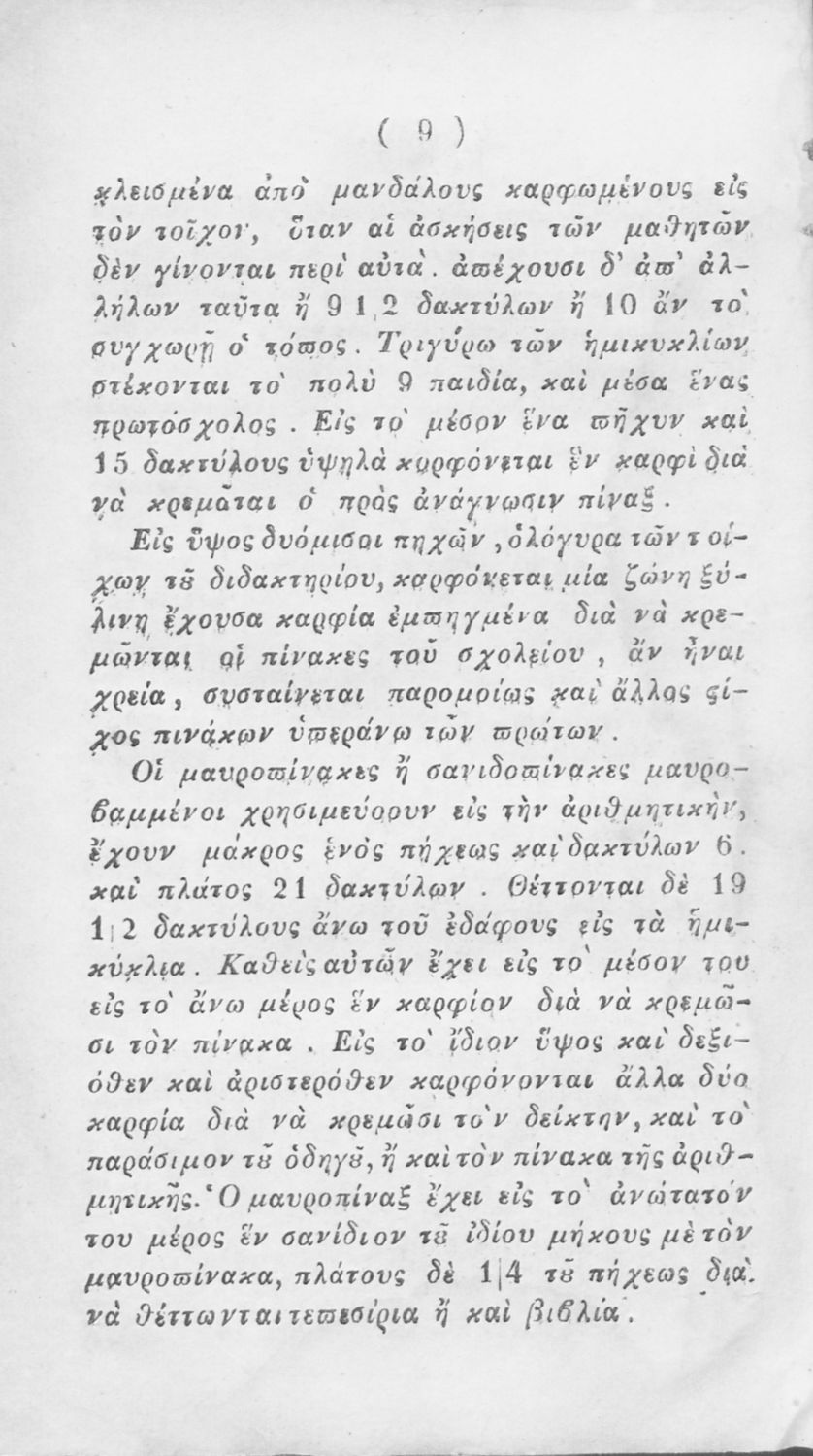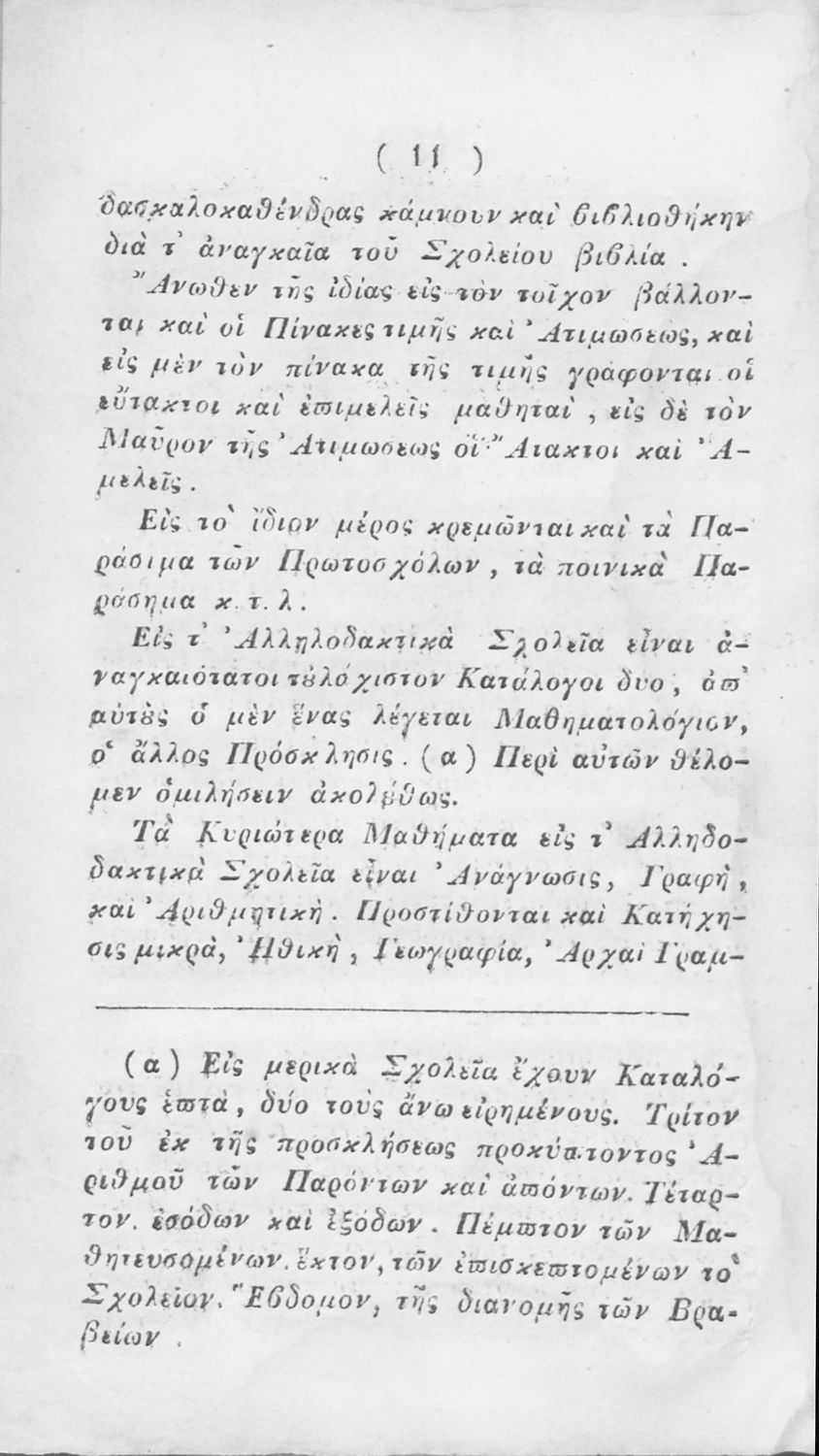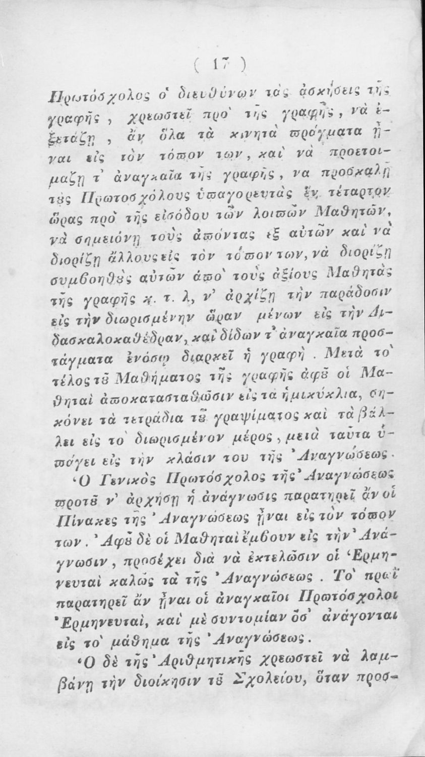 Γλώσσα: Καθαρεύουσα Παρουσίαση περιεχομένου: Παιδαγωγικό βοήθημα που περιλαμβάνει τις γενικές αρχές της αλληλοδιδακτικής μεθόδου διδασκαλίας που εφαρμοζόταν κατά την διάρκεια του 19ου αιώνα και εμφανίστηκε στην Ελλάδα κατά την δεκαετία του 1830. Ο δάσκαλος όριζε κάποιους μαθητές, συνήθως τους μεγαλύτερους και τους καλύτερους σε επιδόσεις (τους λεγόμενους πρωτόσχολους), για να τον βοηθήσουν με την διδασκαλία του μαθήματος. |