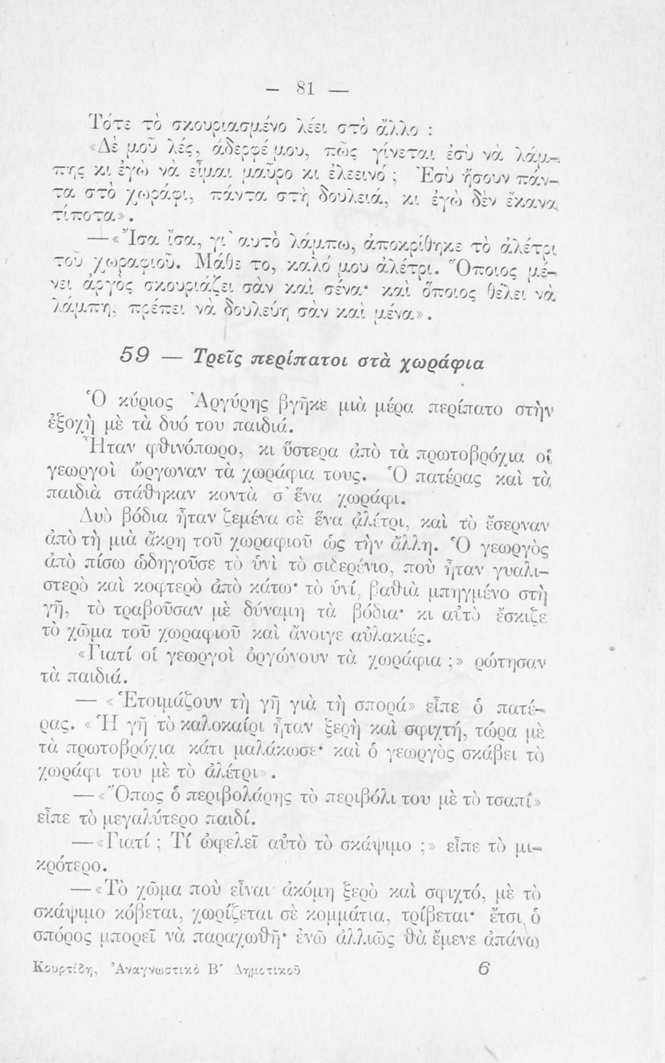 Κωδικός αναγνώρισης: 05-00105 Τίτλος: Αναγνωστικό Β΄ Δημοτικού Συγγραφέας: Αρ. Π. Κουρτίδης Μέγεθος και υπόστρωμα: Σχολικό εγχειρίδιο, μαλακό εξώφυλλο, 134 σελίδες. Σκίτσα (ασπρόμαυρα). |