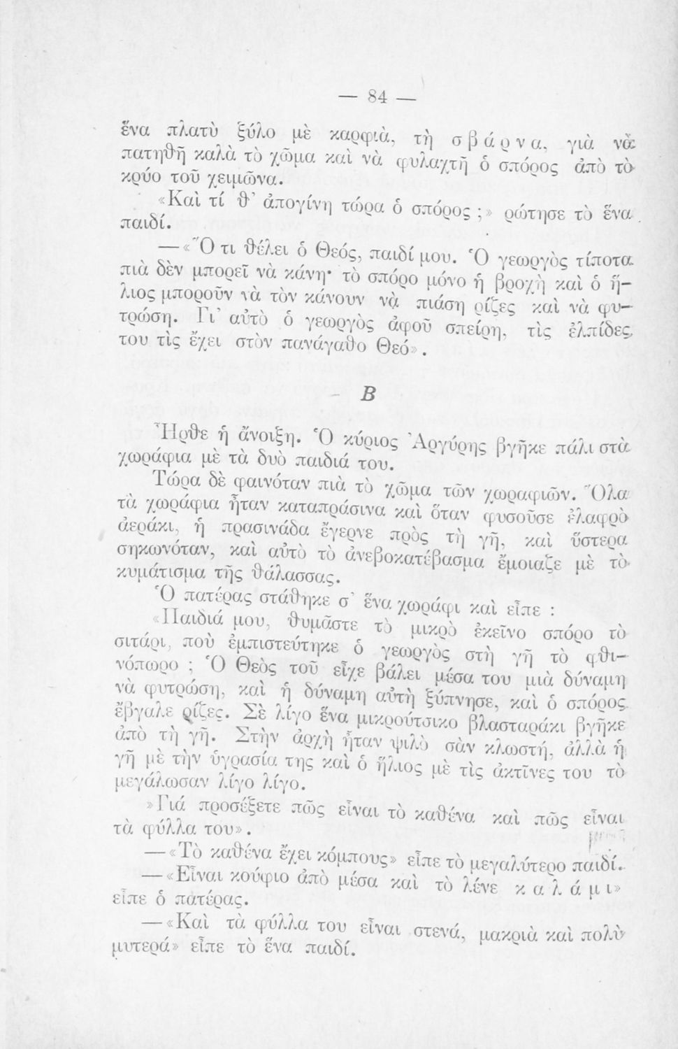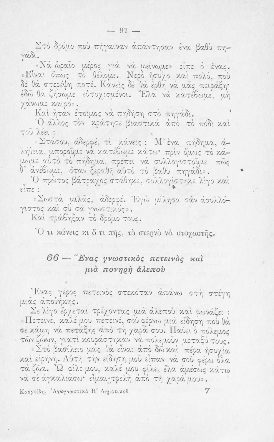 Βαθμίδα εκπαίδευσης: Πρωτοβάθμια Τάξη: Β' Δημοτικού Μάθημα: Νέα Ελληνικά Γλώσσα: Δημοτική Παρουσίαση περιεχομένου: Αναγνωστικό Β΄ Δημοτικού που περιλαμβάνει ιστορίες από την καθημερινή ζωή των παιδιών και των οικογενειών τους, την παιδαγωγική αξία των προσευχών, τις οικογενειακές και εθνικές γιορτές και τις 4 εποχές του έτους. |