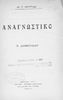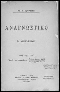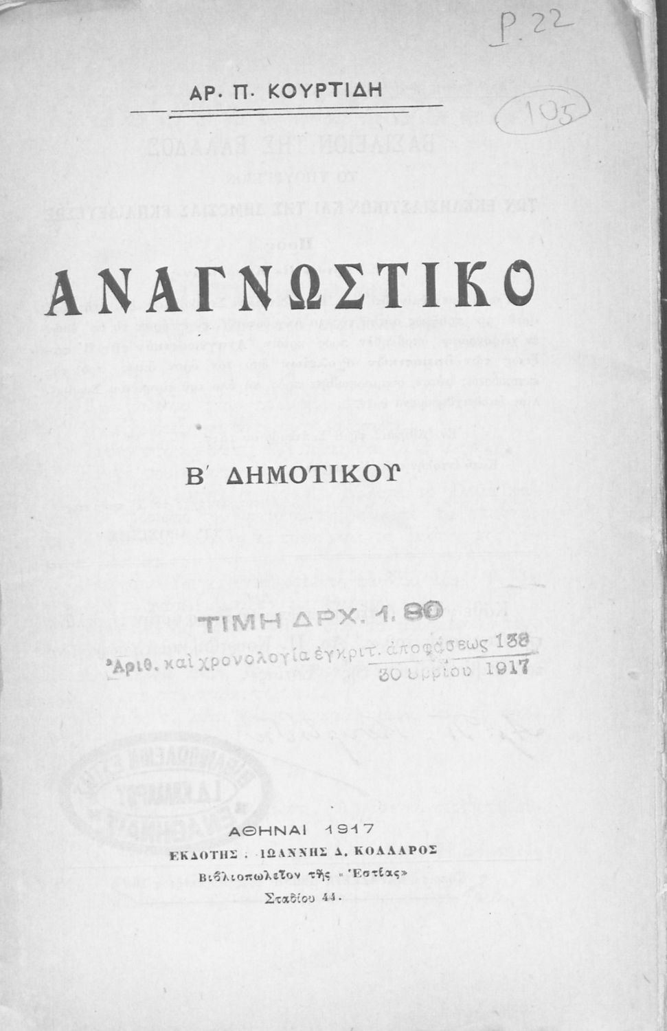 Εκδότης: Ιωάννης Δ. Κολλάρος, Βιβλιοπωλείο της "Εστίας" Έτος έκδοσης: 1917 Τόπος έκδοσης: Αθήνα Υπουργική απόφαση / Σύμβαση: 138/30-10-1917 Έτος έγκρισης: 1917 |