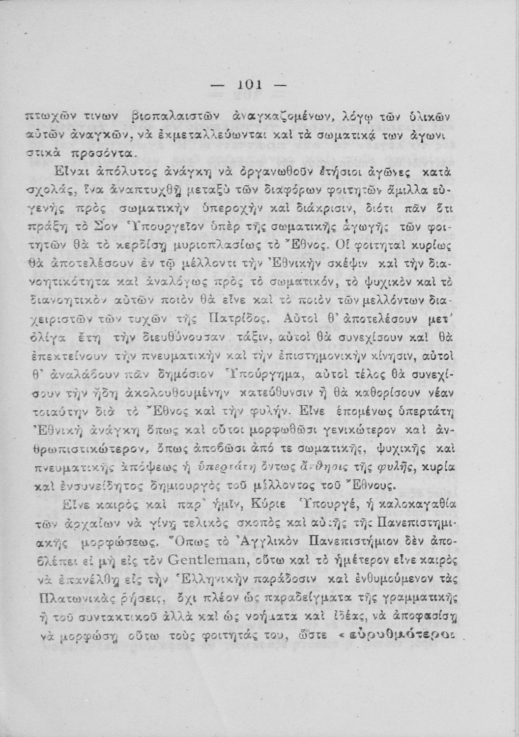 Υπόμνημα που υποβλήθηκε από τον τμηματάρχη Γυμναστικής στο Υπουργείο Εκκλησιαστικών και Δημόσιας Εκπαιδεύσεως και περιλαμβάνει ζητήματα σωματικής αγωγής των νέων, ιστορική αναδρομή και αναφορά στον προσκοπισμό.