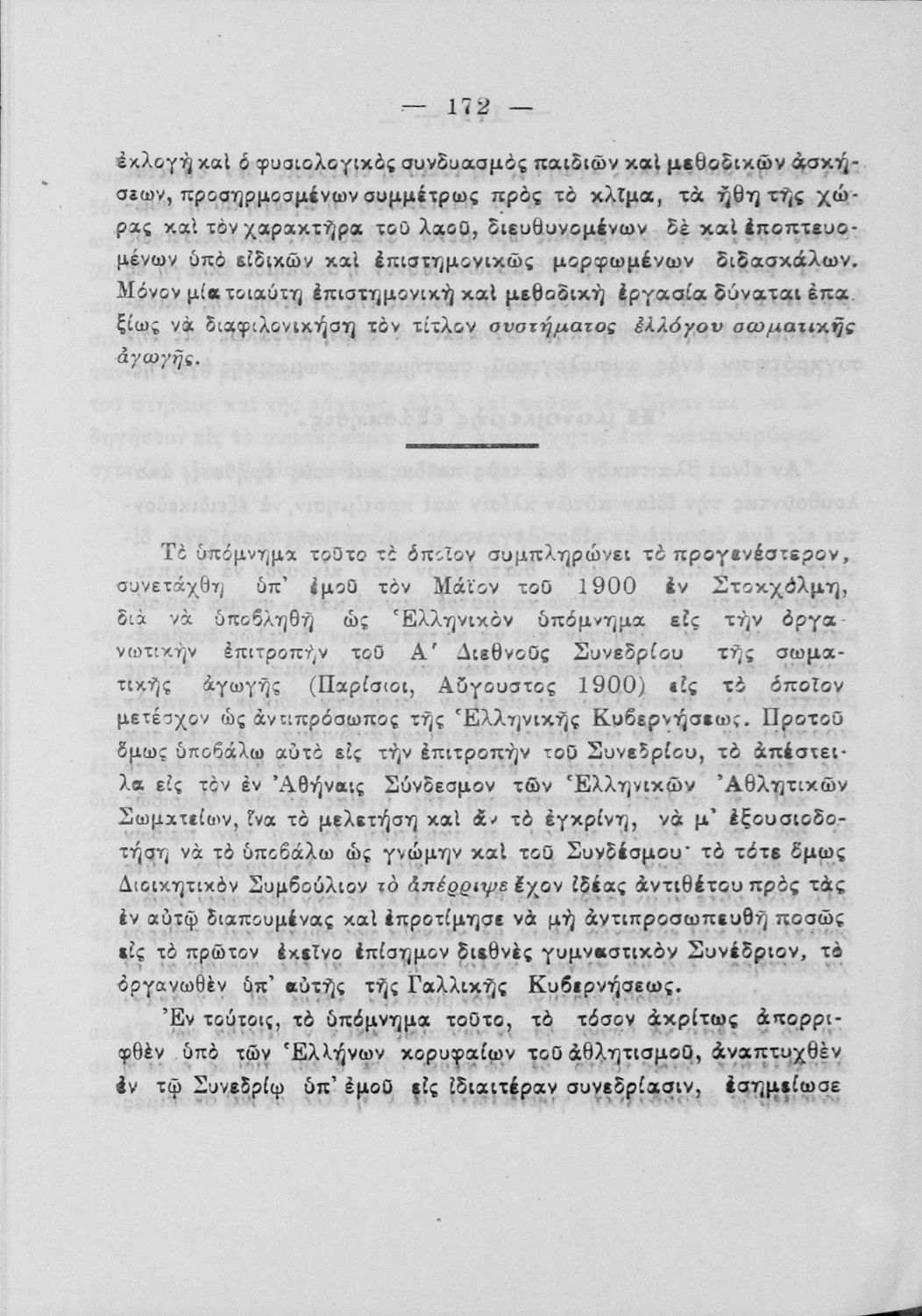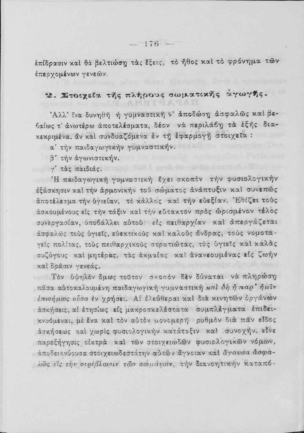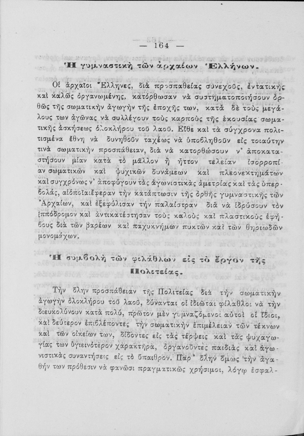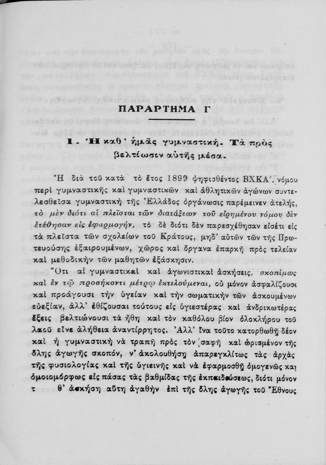 Υπόμνημα που υποβλήθηκε από τον τμηματάρχη Γυμναστικής στο Υπουργείο Εκκλησιαστικών και Δημόσιας Εκπαιδεύσεως και περιλαμβάνει ζητήματα σωματικής αγωγής των νέων, ιστορική αναδρομή και αναφορά στον προσκοπισμό.