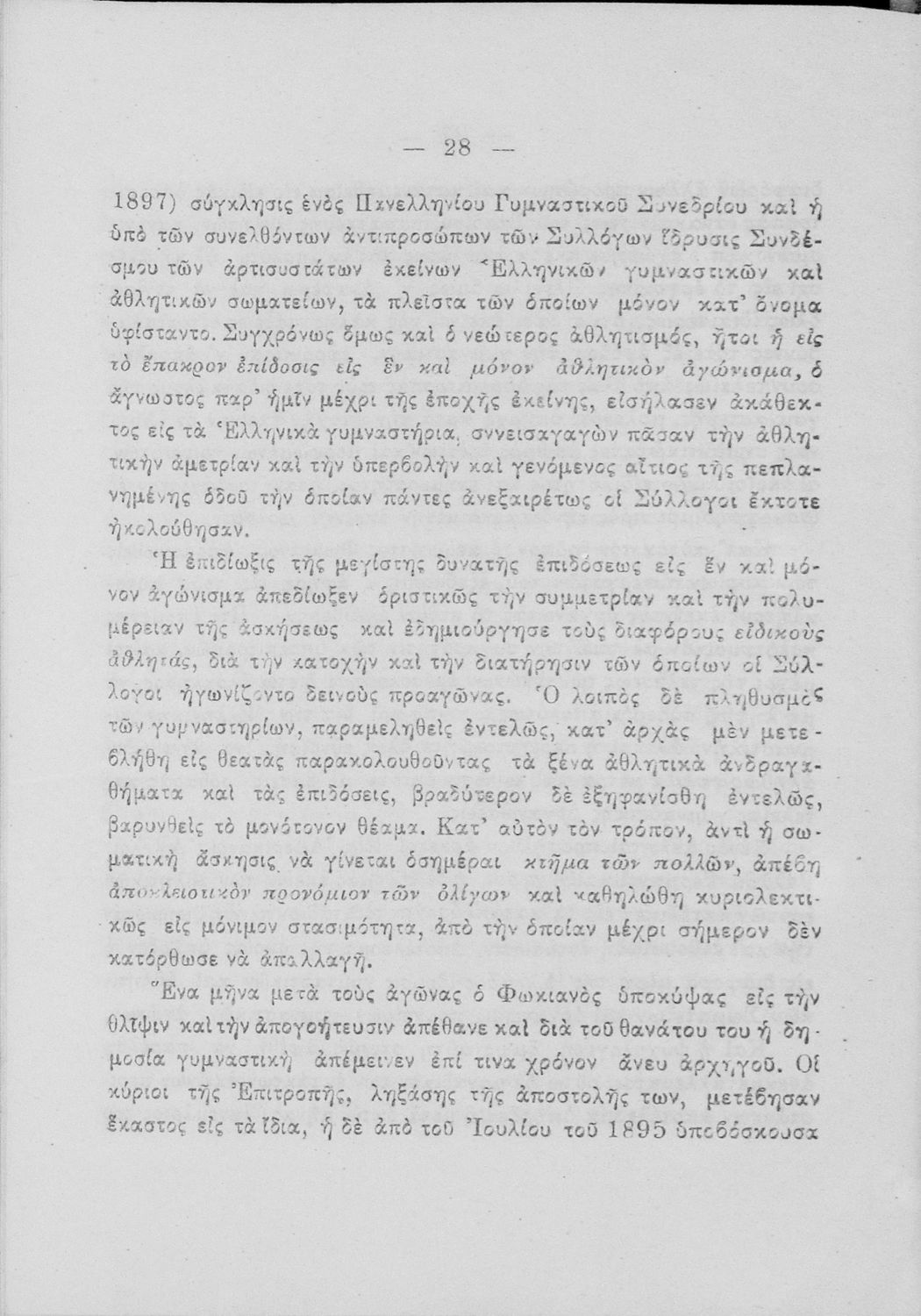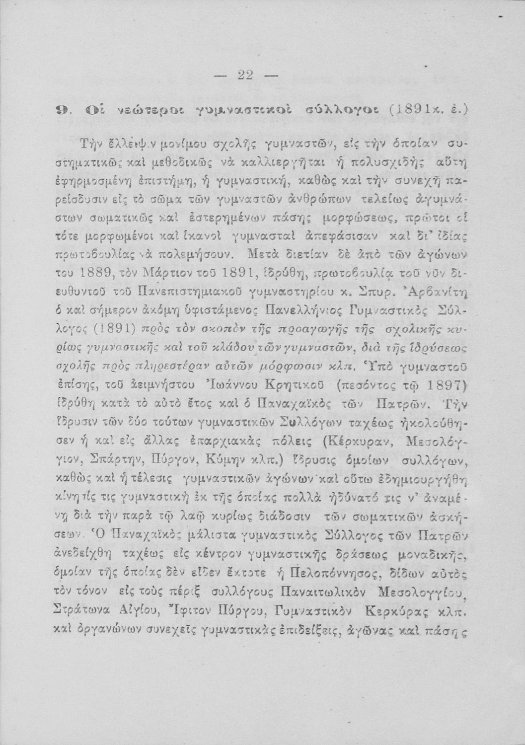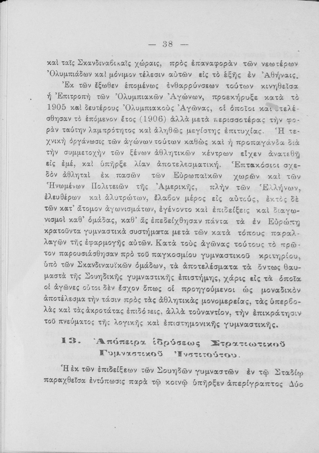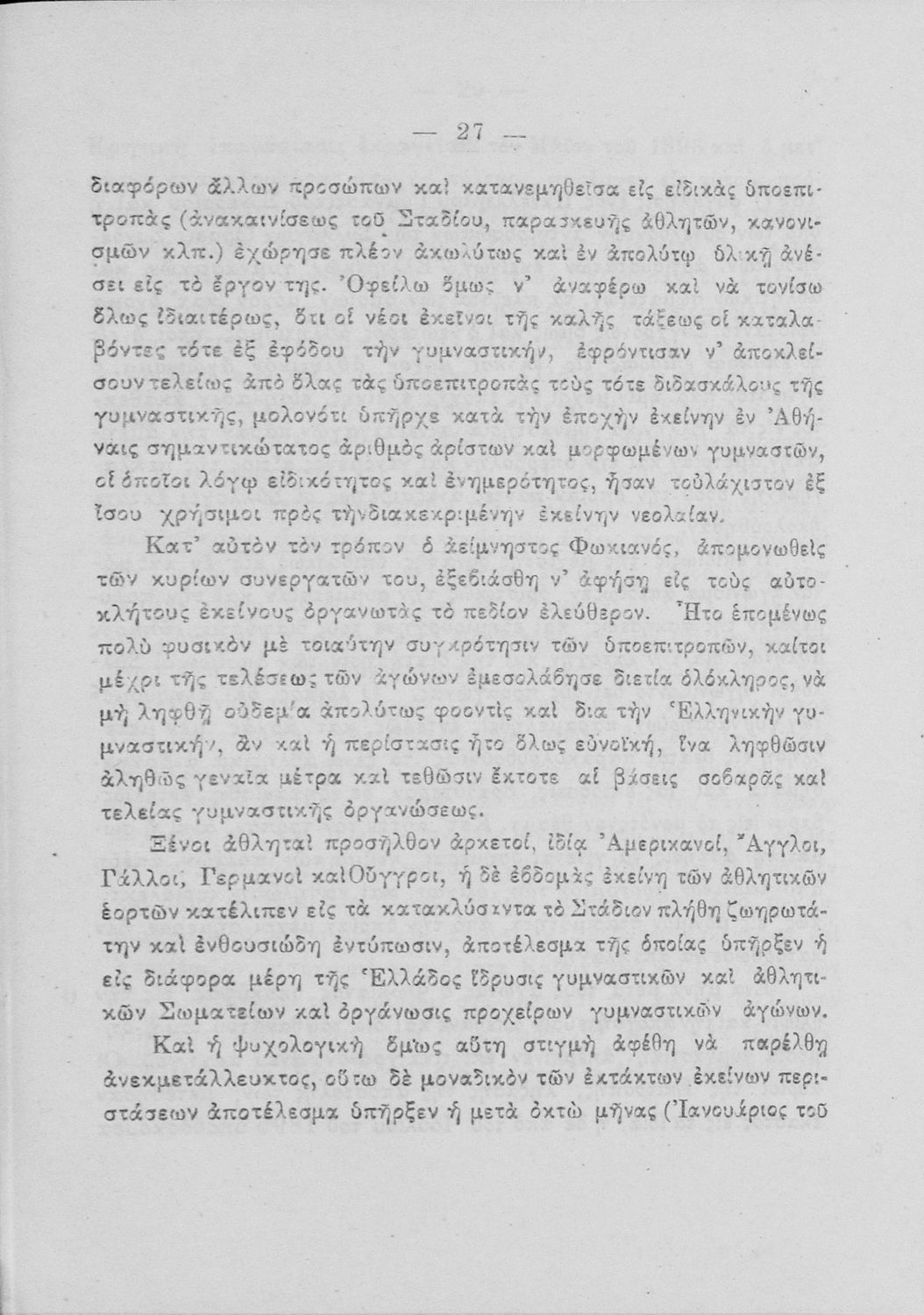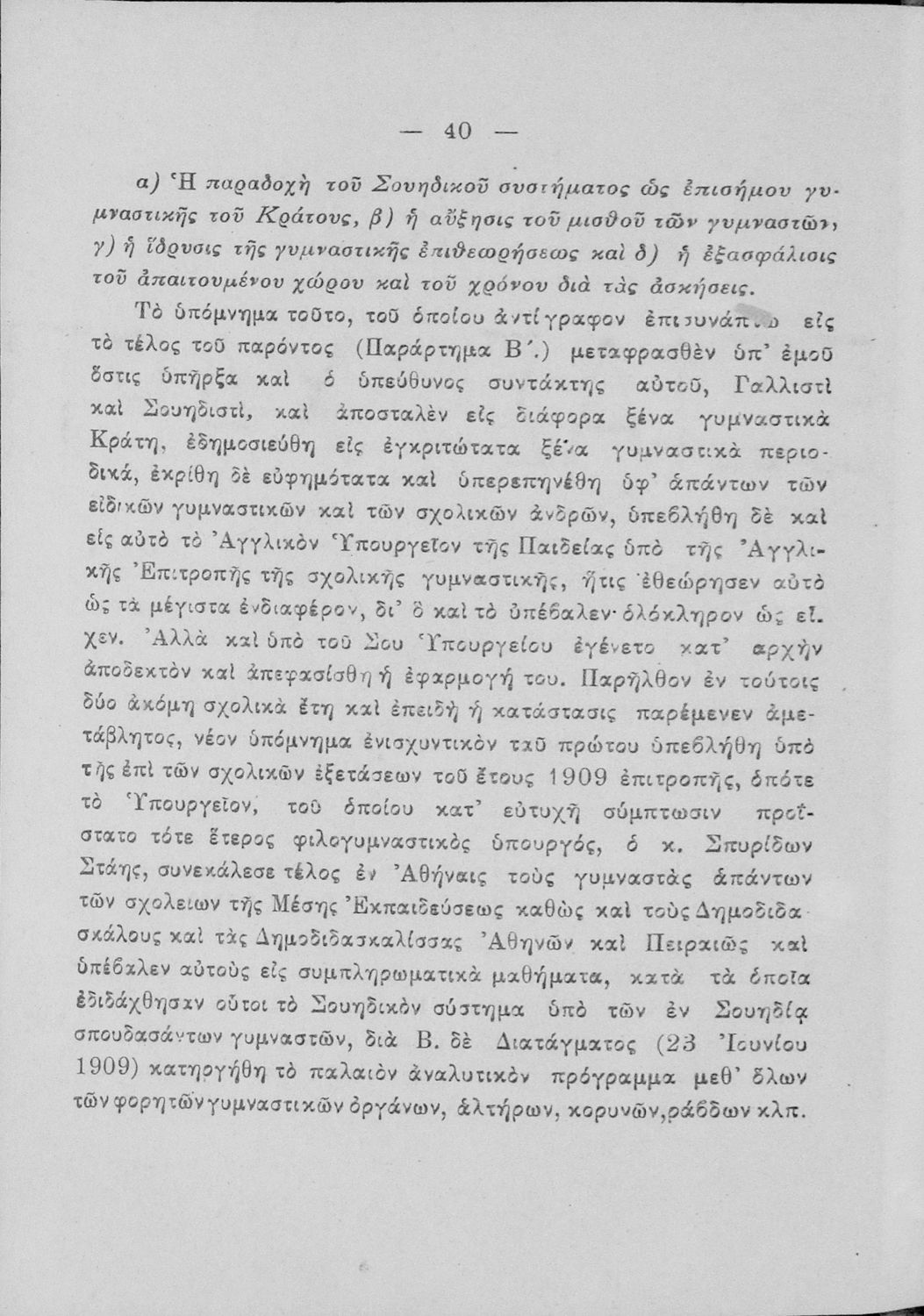 Υπόμνημα που υποβλήθηκε από τον τμηματάρχη Γυμναστικής στο Υπουργείο Εκκλησιαστικών και Δημόσιας Εκπαιδεύσεως και περιλαμβάνει ζητήματα σωματικής αγωγής των νέων, ιστορική αναδρομή και αναφορά στον προσκοπισμό.