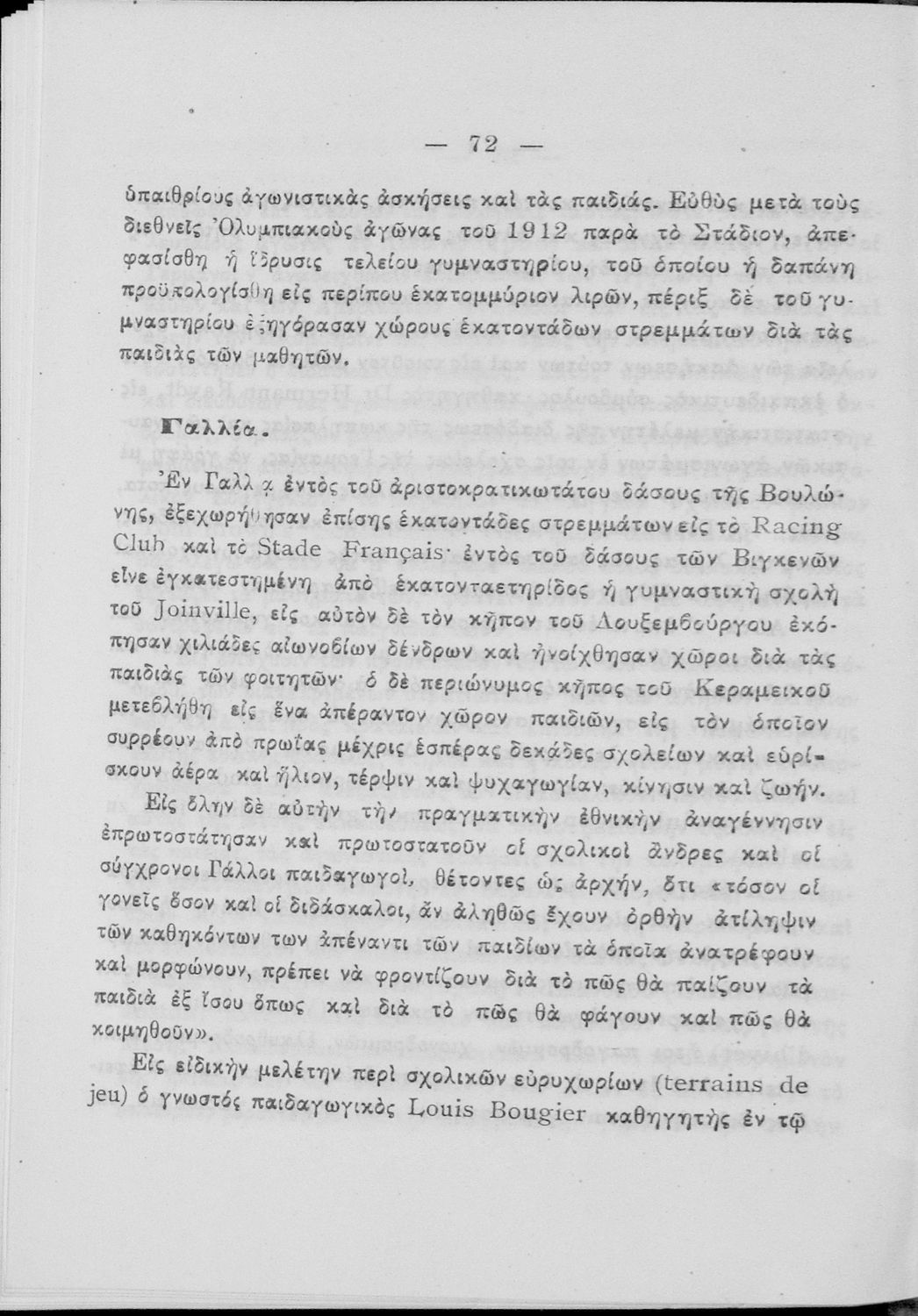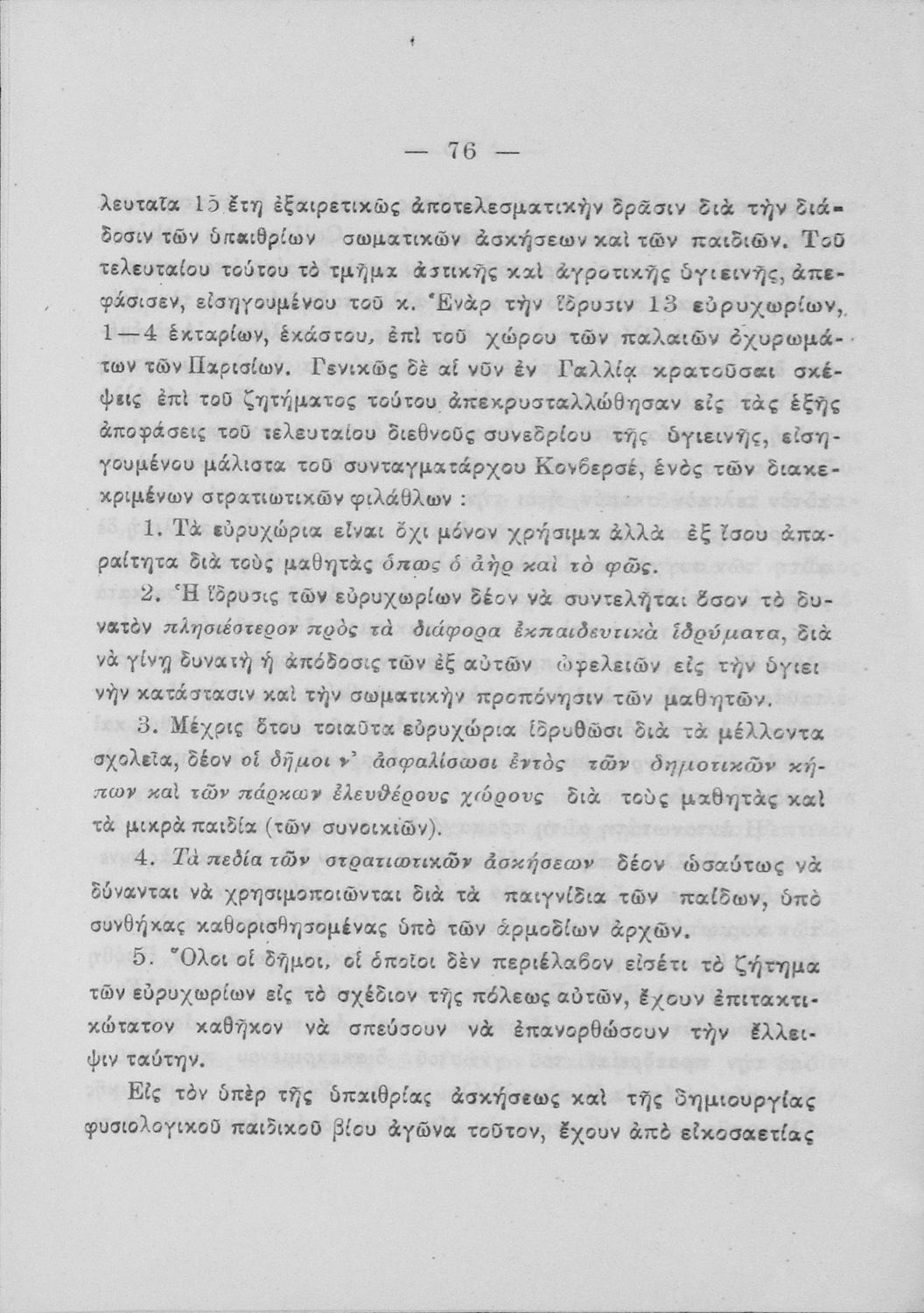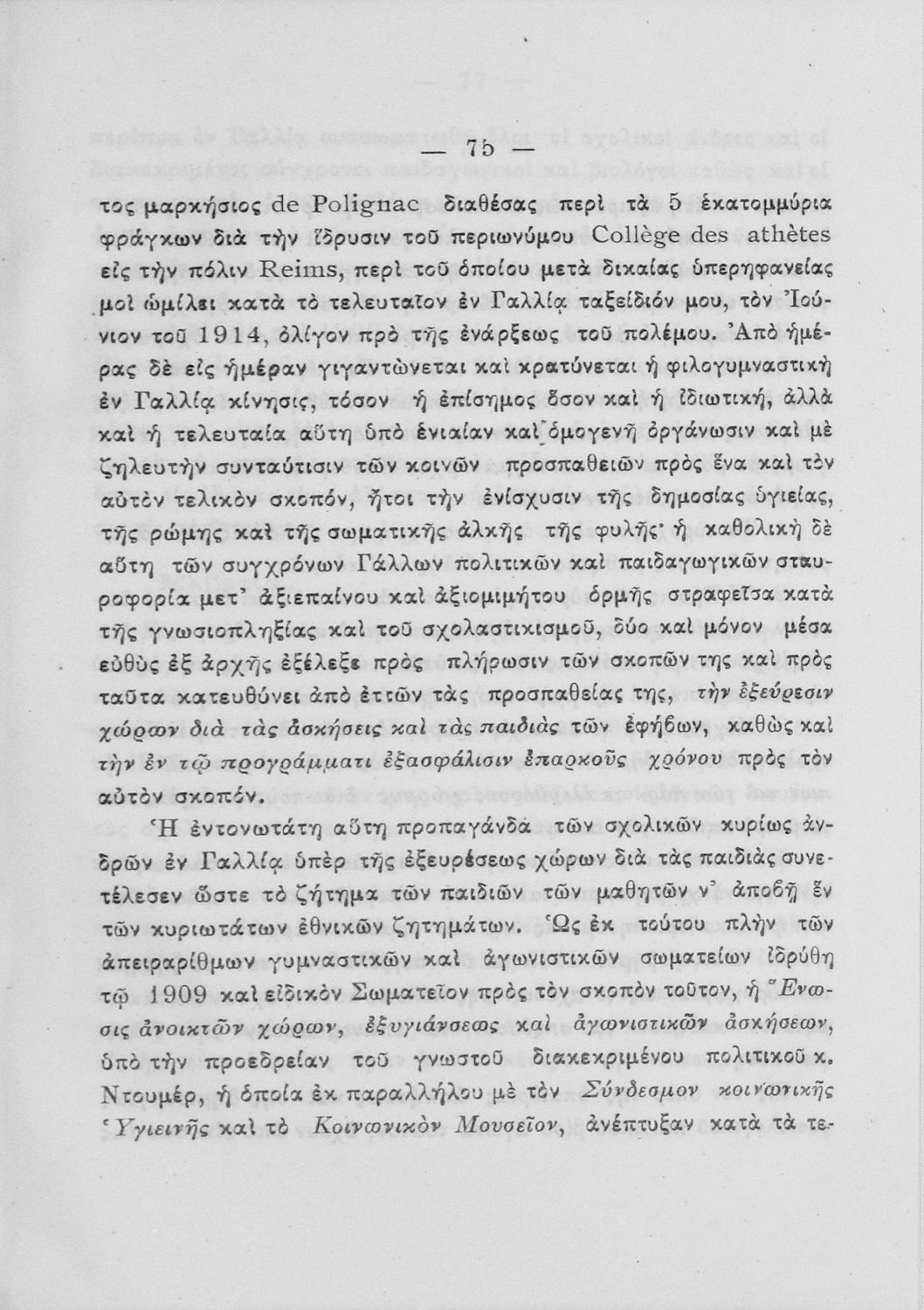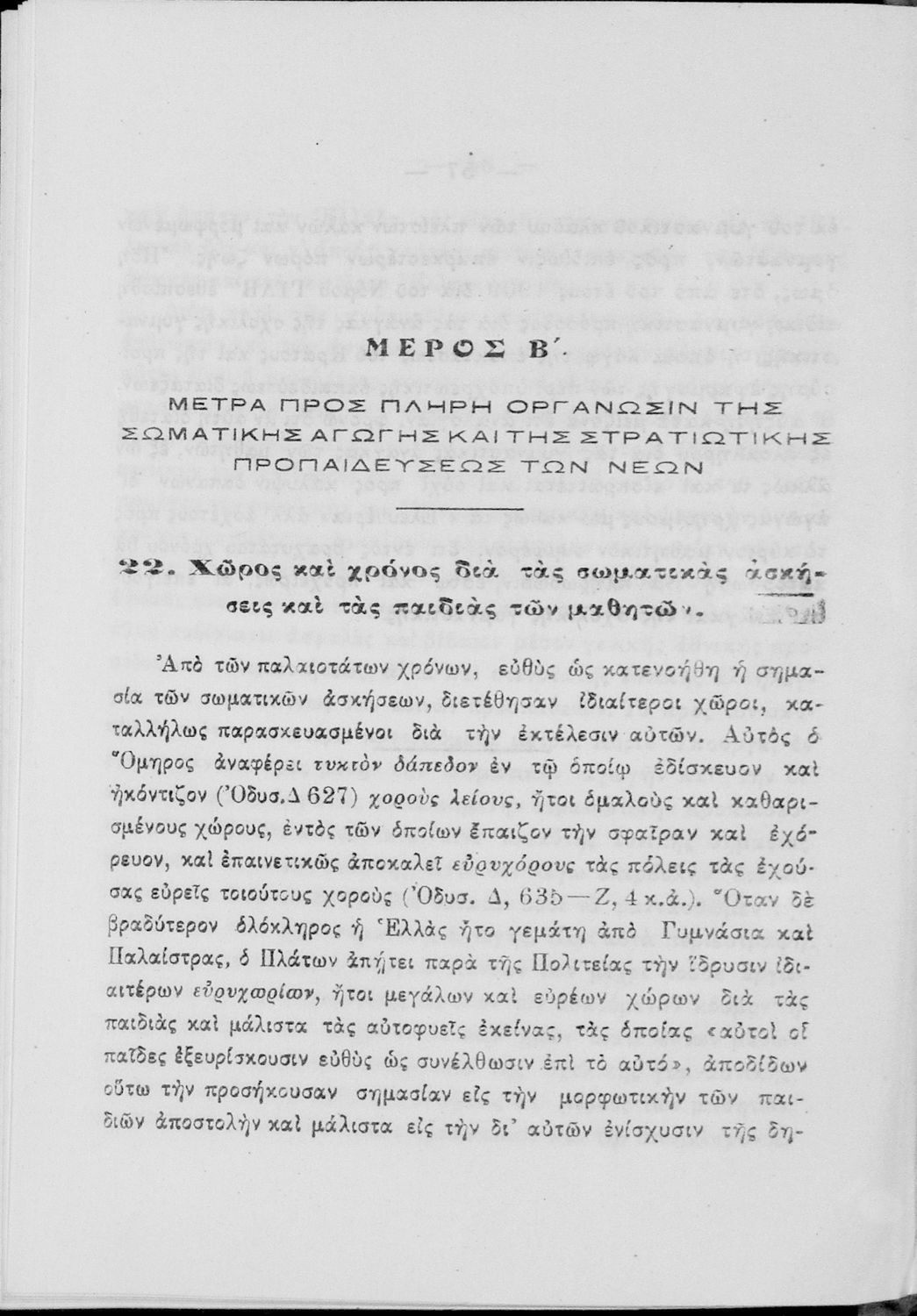 Υπόμνημα που υποβλήθηκε από τον τμηματάρχη Γυμναστικής στο Υπουργείο Εκκλησιαστικών και Δημόσιας Εκπαιδεύσεως και περιλαμβάνει ζητήματα σωματικής αγωγής των νέων, ιστορική αναδρομή και αναφορά στον προσκοπισμό.