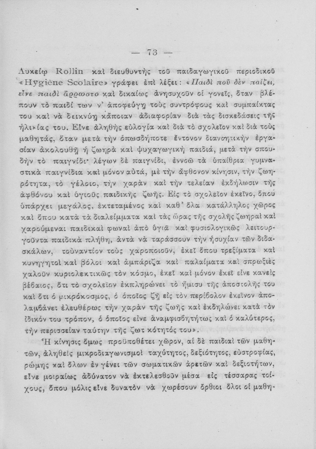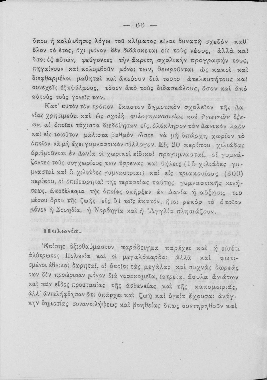 Μάθημα: Φυσική Αγωγή Γλώσσα: Καθαρεύουσα Παρουσίαση περιεχομένου: Υπόμνημα που υποβλήθηκε από τον τμηματάρχη Γυμναστικής στο Υπουργείο Εκκλησιαστικών και Δημόσιας Εκπαιδεύσεως και περιλαμβάνει ζητήματα σωματικής αγωγής των νέων, ιστορική αναδρομή και αναφορά στον προσκοπισμό. |