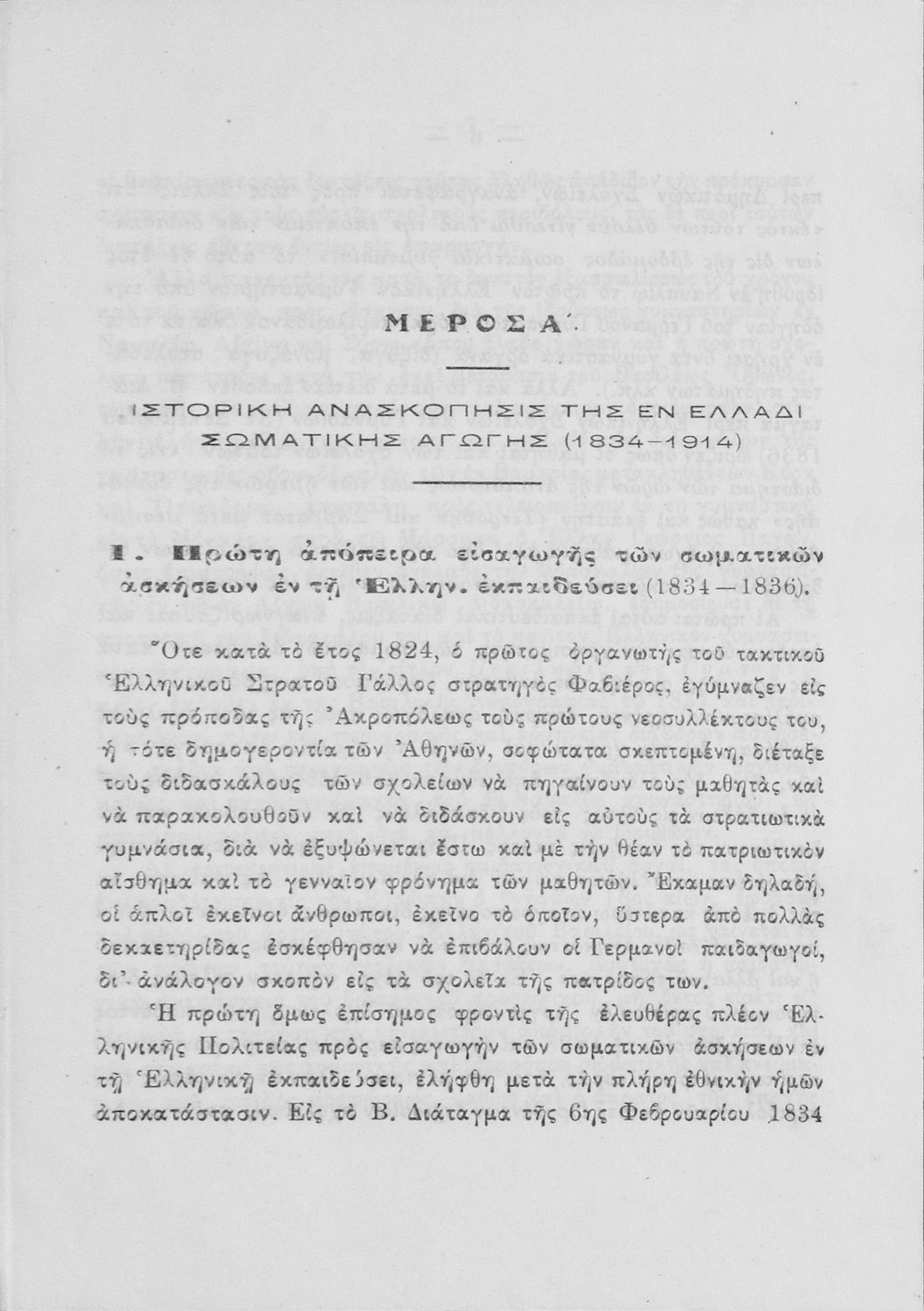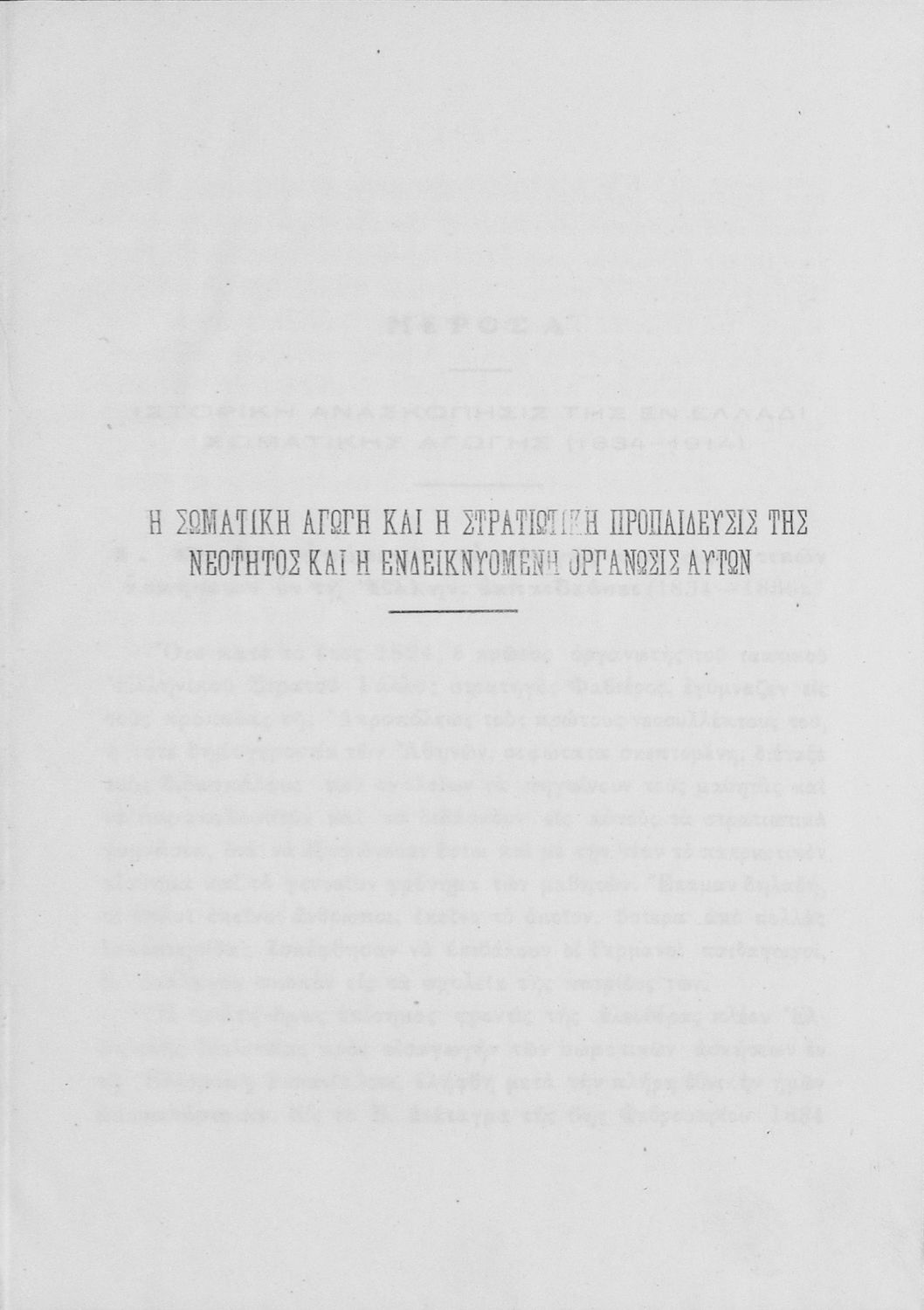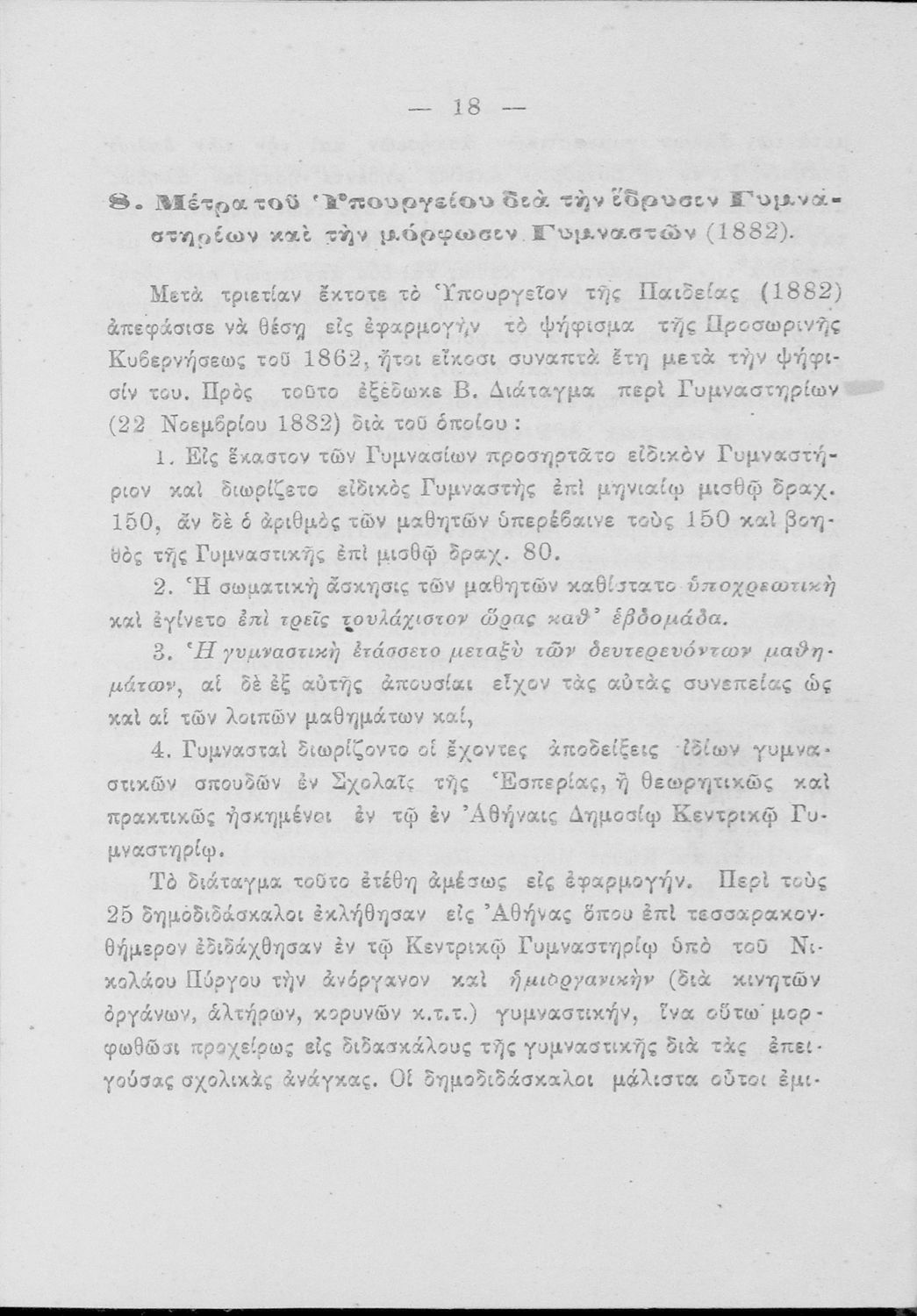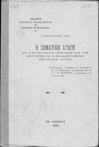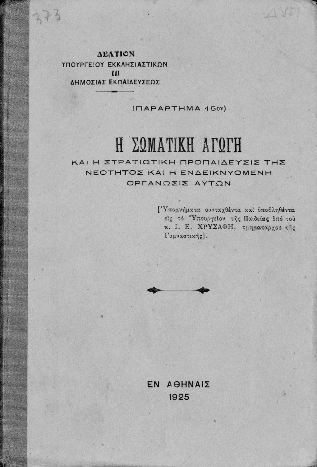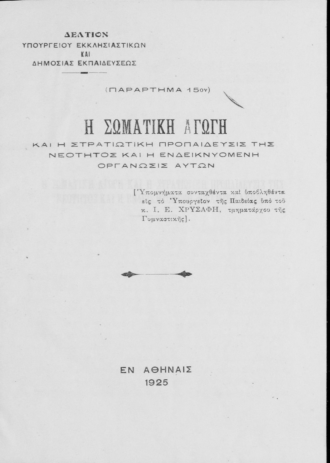 Υπόμνημα που υποβλήθηκε από τον τμηματάρχη Γυμναστικής στο Υπουργείο Εκκλησιαστικών και Δημόσιας Εκπαιδεύσεως και περιλαμβάνει ζητήματα σωματικής αγωγής των νέων, ιστορική αναδρομή και αναφορά στον προσκοπισμό.