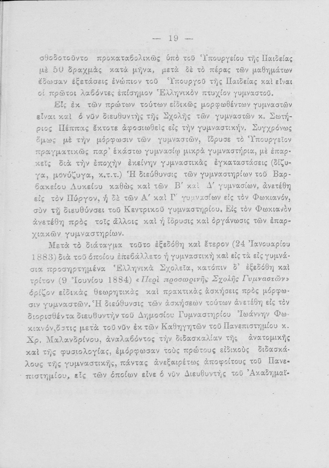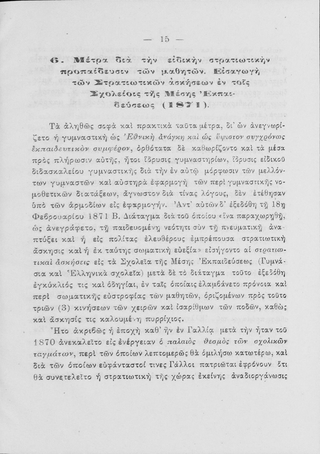 Μάθημα: Φυσική Αγωγή Γλώσσα: Καθαρεύουσα Παρουσίαση περιεχομένου: Υπόμνημα που υποβλήθηκε από τον τμηματάρχη Γυμναστικής στο Υπουργείο Εκκλησιαστικών και Δημόσιας Εκπαιδεύσεως και περιλαμβάνει ζητήματα σωματικής αγωγής των νέων, ιστορική αναδρομή και αναφορά στον προσκοπισμό. |