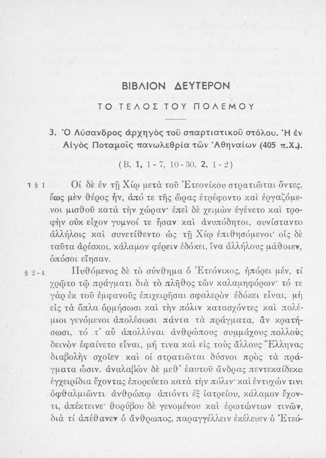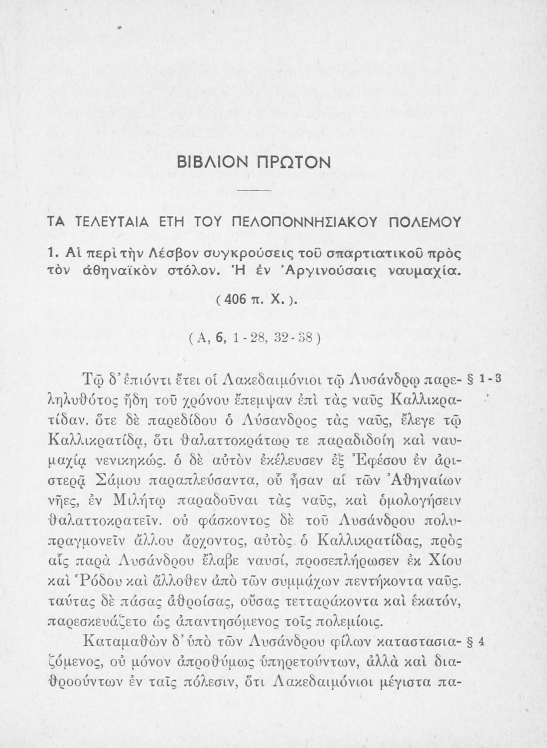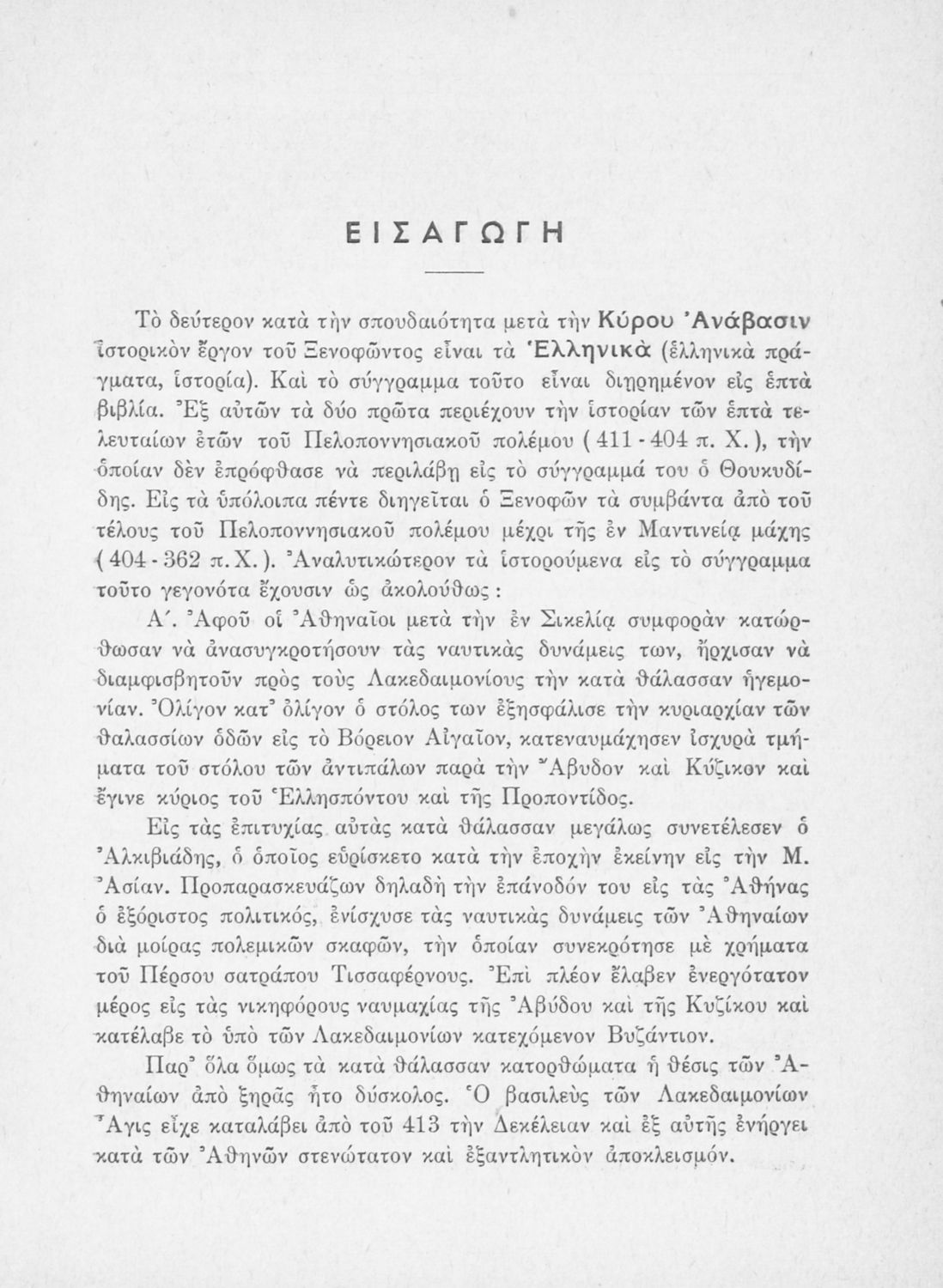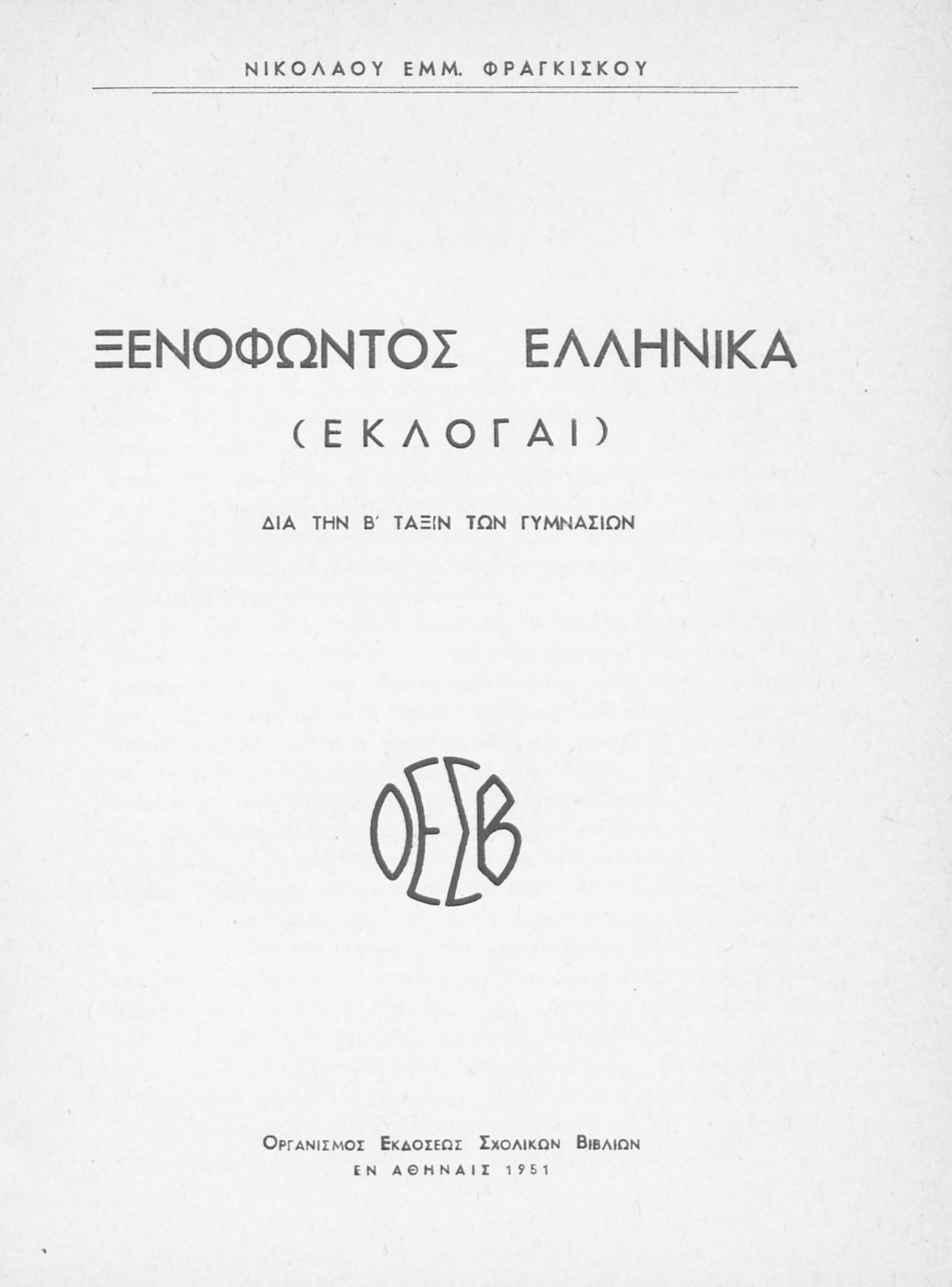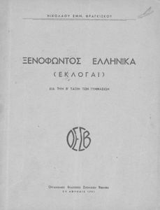 Σχολικό εγχειρίδιο Αρχαίων Ελληνικών Β΄ Γυμνασίου που περιλαμβάνει αποσπάσματα από τα Ελληνικά του Ξενοφώντα, εισαγωγή, ερμηνευτικές παρατηρήσεις και πίνακες και σχεδιαγράμματα μαχών.