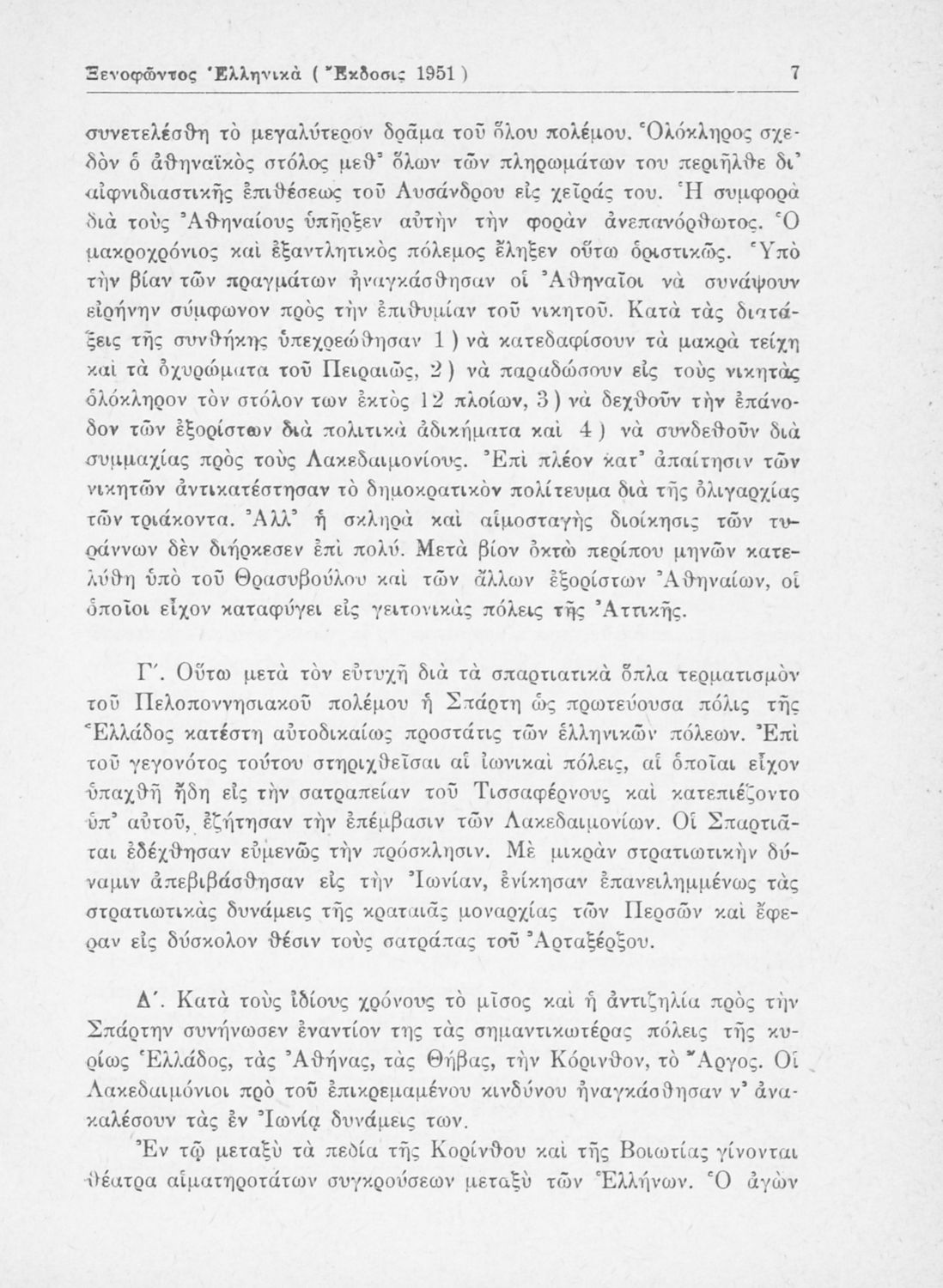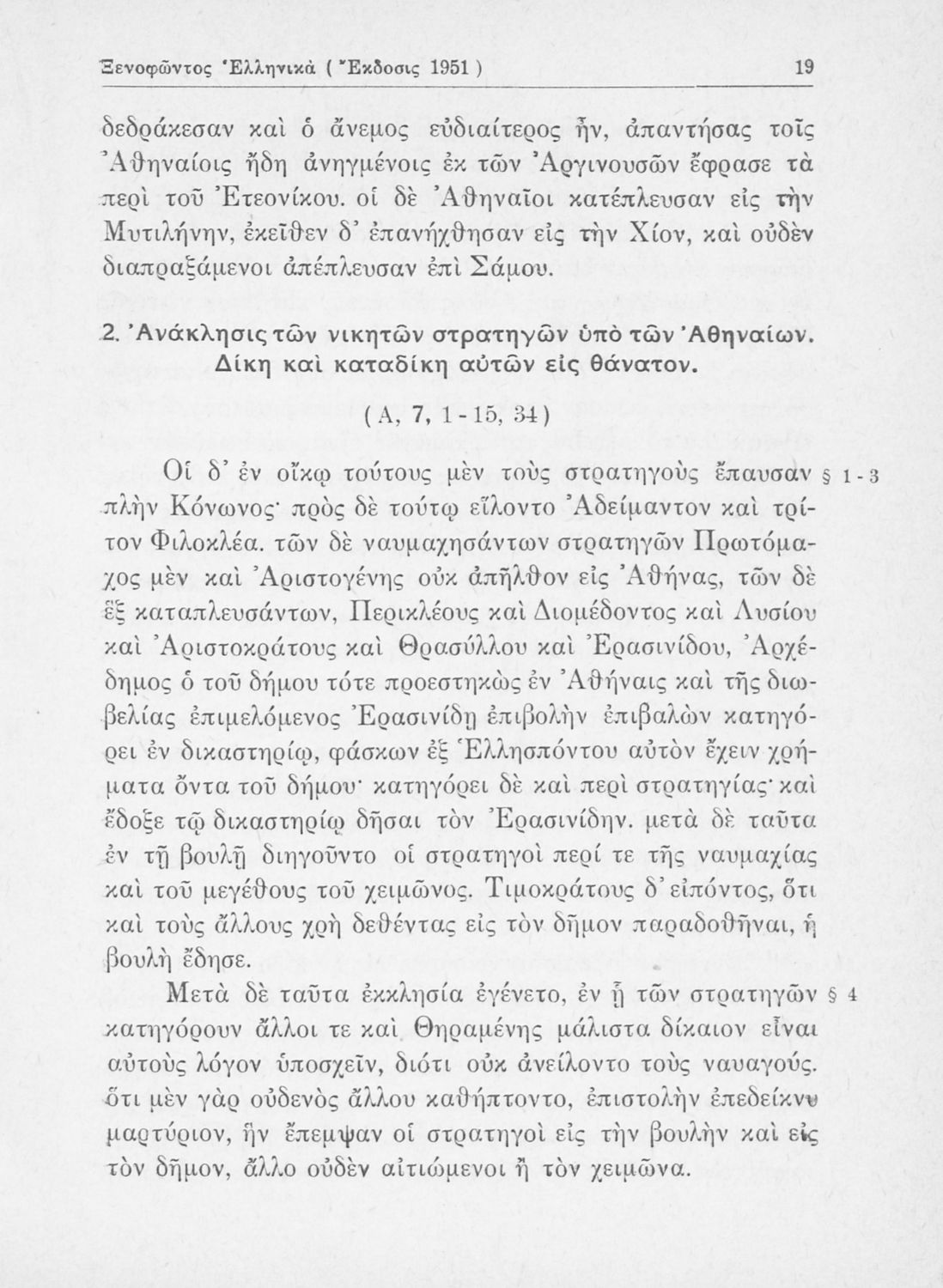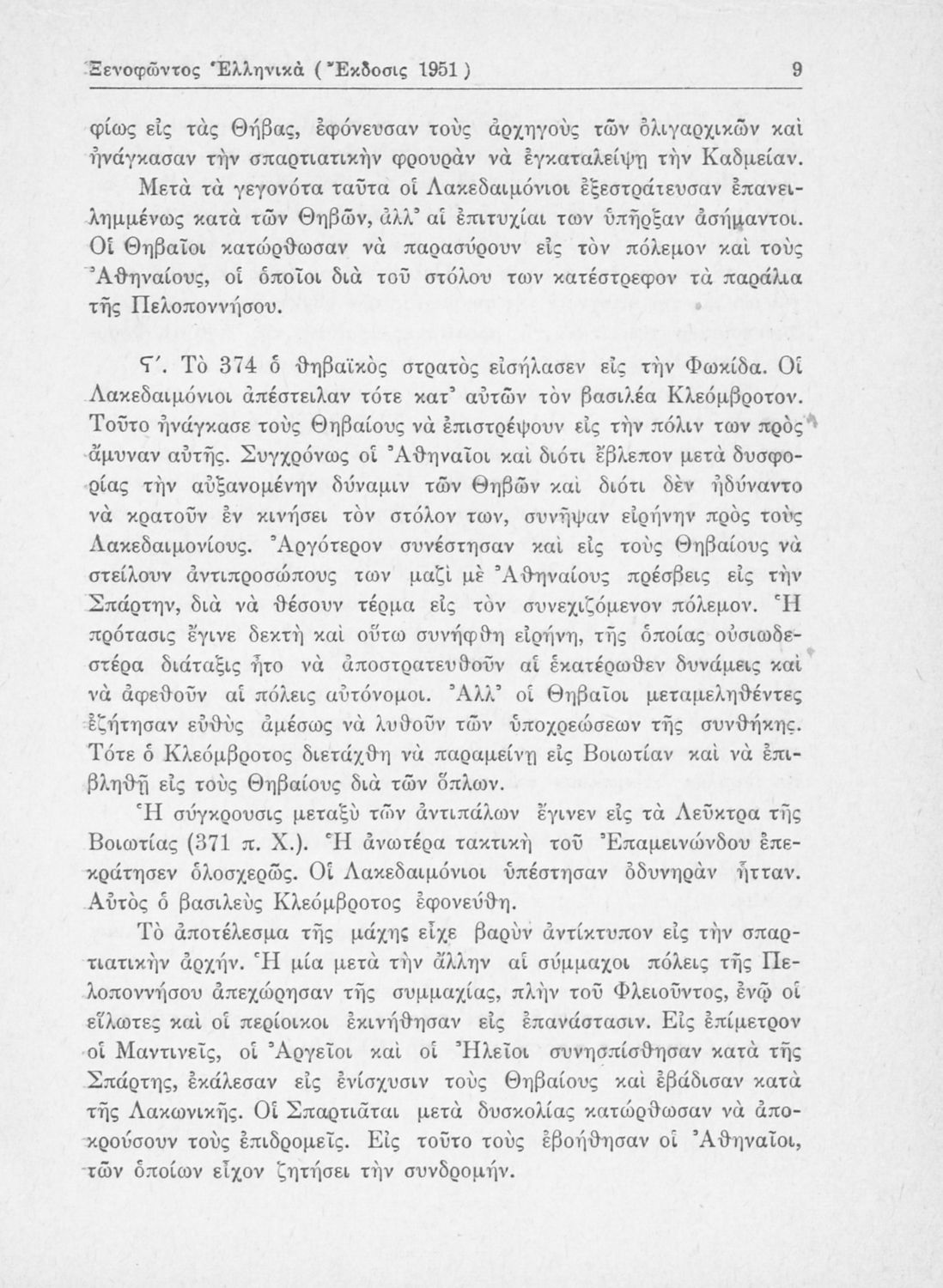 Σχολικό εγχειρίδιο Αρχαίων Ελληνικών Β΄ Γυμνασίου που περιλαμβάνει αποσπάσματα από τα Ελληνικά του Ξενοφώντα, εισαγωγή, ερμηνευτικές παρατηρήσεις και πίνακες και σχεδιαγράμματα μαχών.