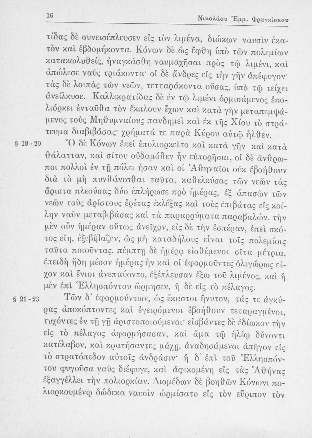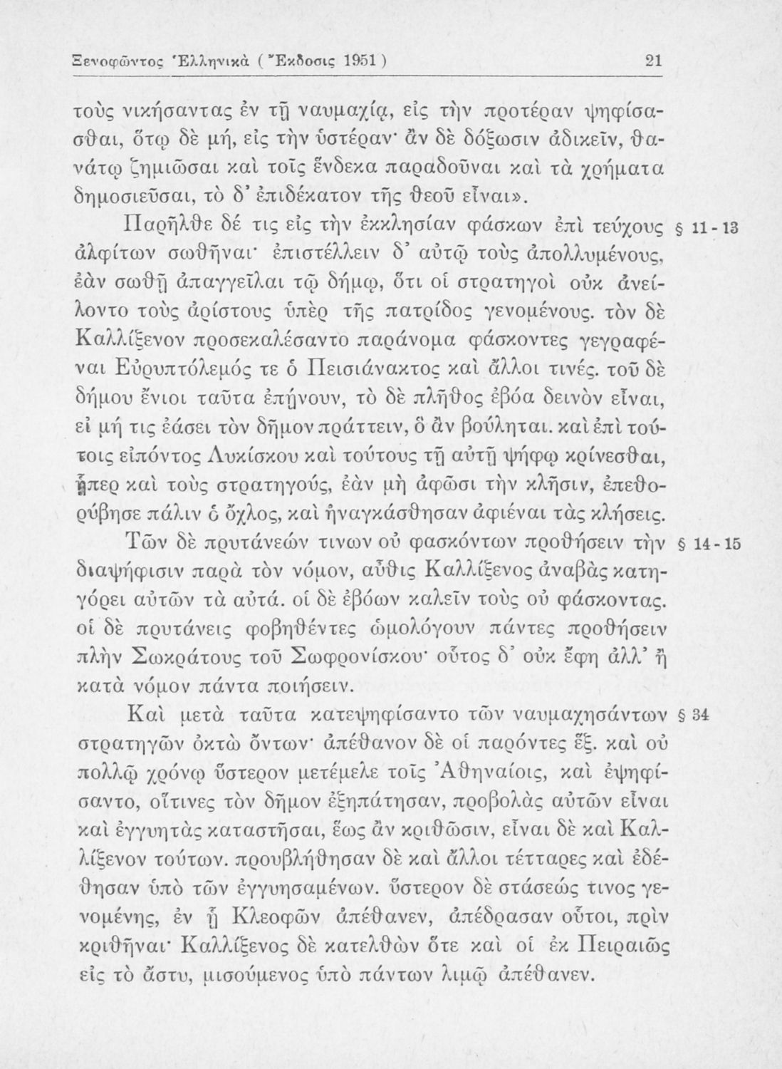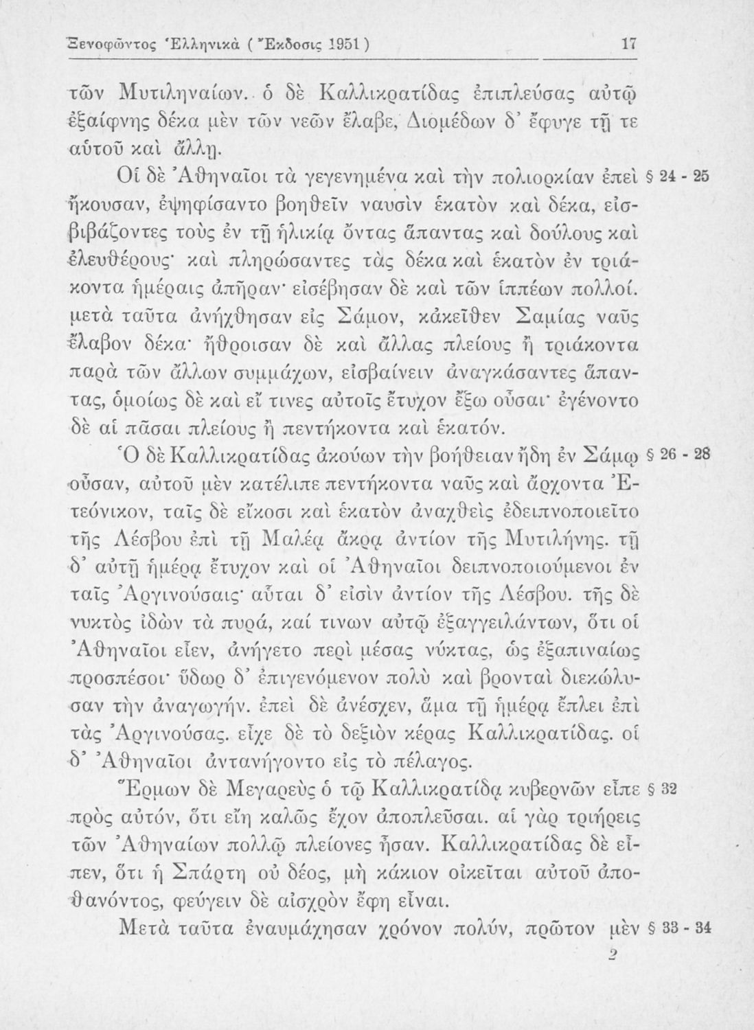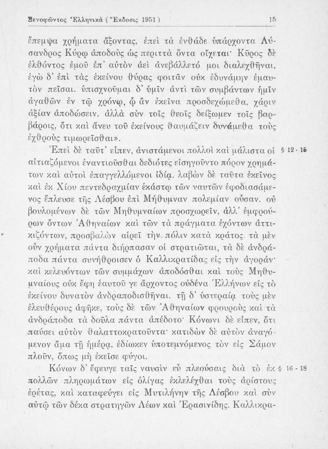 Σχολικό εγχειρίδιο Αρχαίων Ελληνικών Β΄ Γυμνασίου που περιλαμβάνει αποσπάσματα από τα Ελληνικά του Ξενοφώντα, εισαγωγή, ερμηνευτικές παρατηρήσεις και πίνακες και σχεδιαγράμματα μαχών.