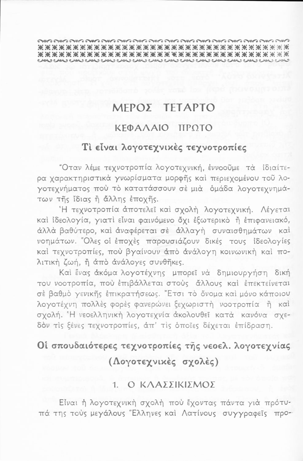 Μαθητικό βοήθημα Νέων Ελληνικών που περιλαμβάνει τα είδη, ρεύματα και τεχνοτροπίες της νεοελληνικής λογοτεχνίας. Περιέχει και στοιχεία μετρικής.
