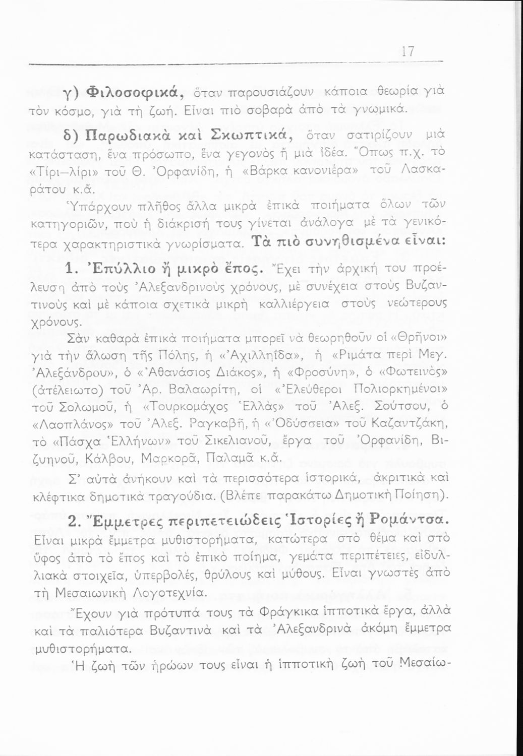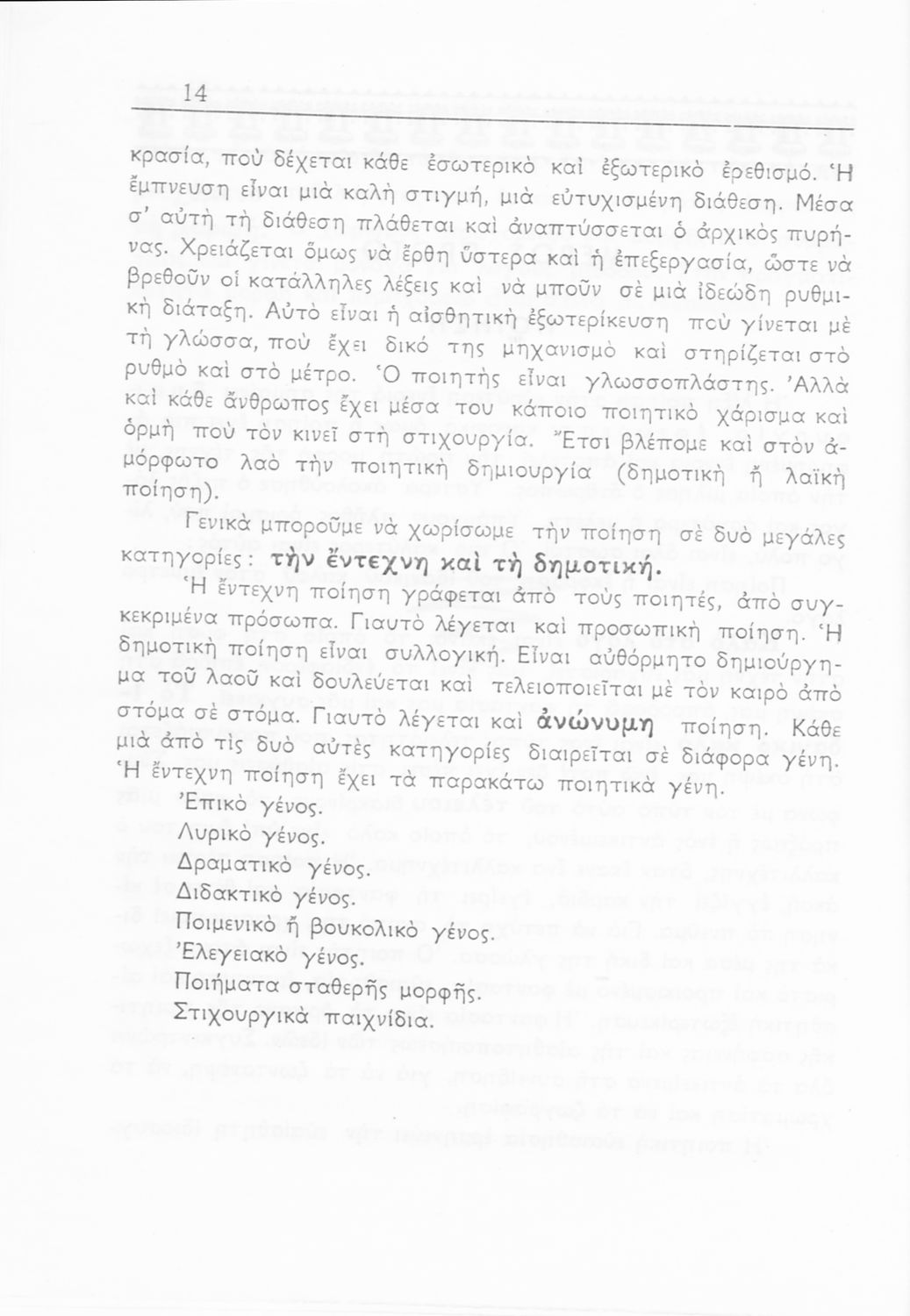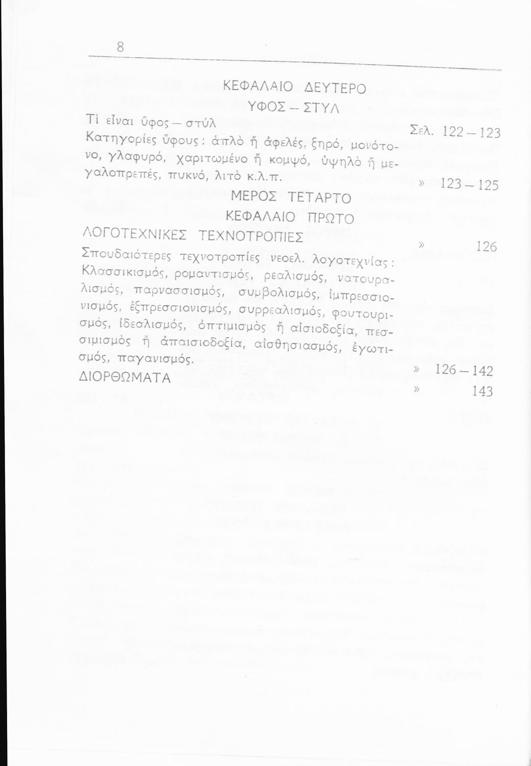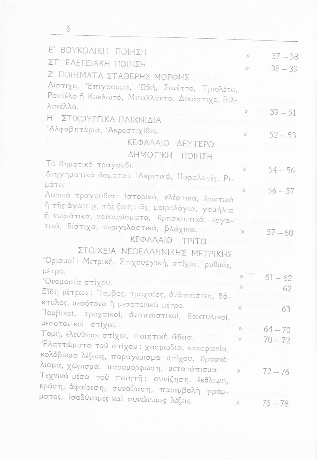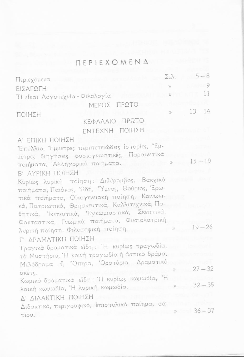 Μαθητικό βοήθημα Νέων Ελληνικών που περιλαμβάνει τα είδη, ρεύματα και τεχνοτροπίες της νεοελληνικής λογοτεχνίας. Περιέχει και στοιχεία μετρικής.