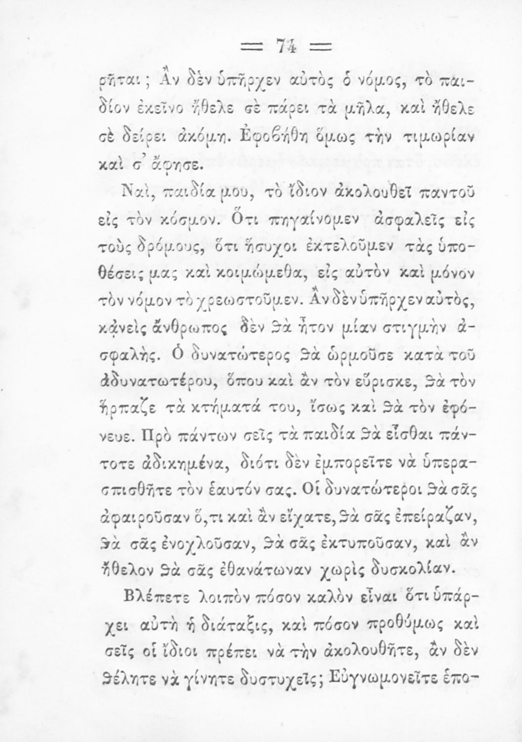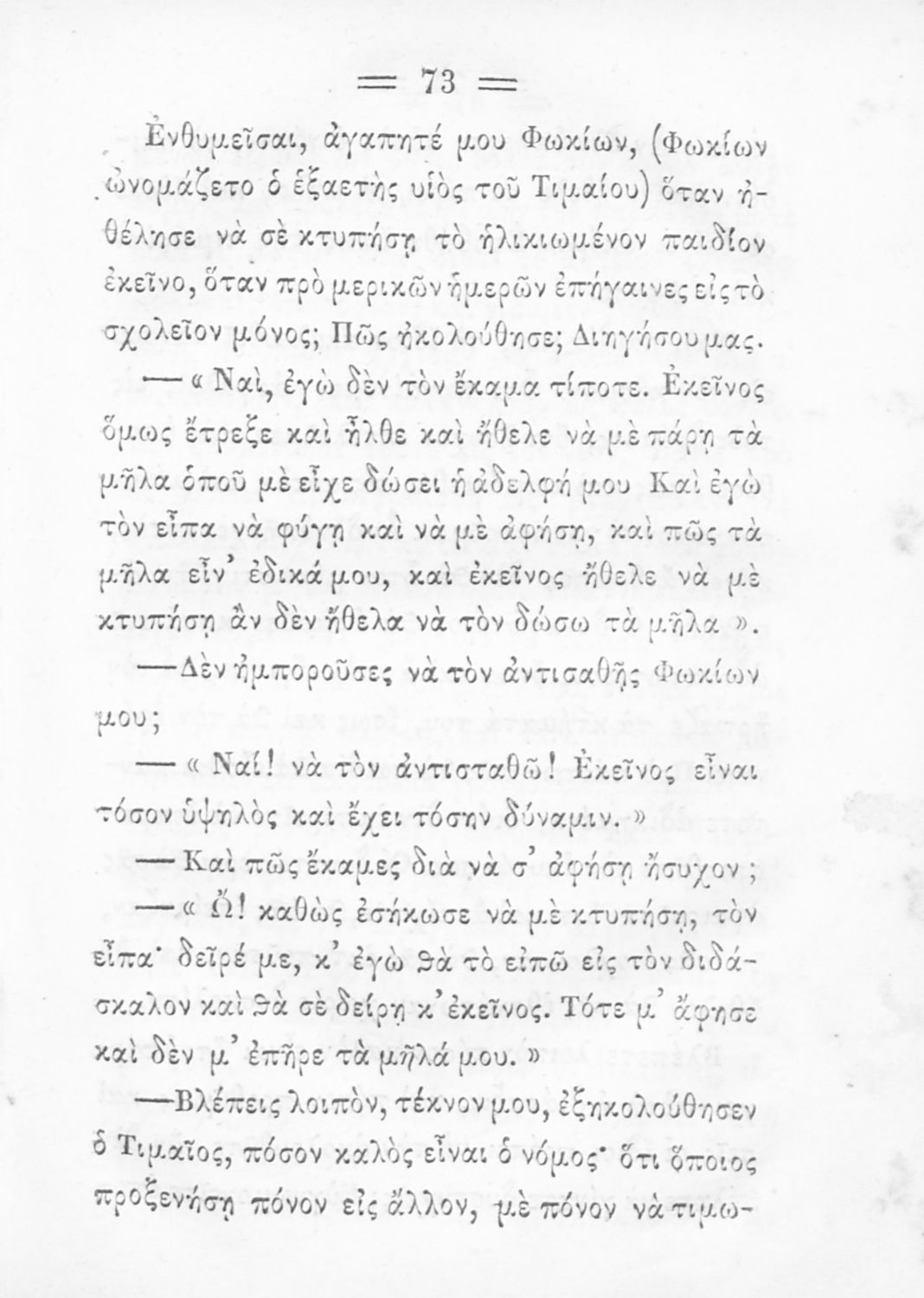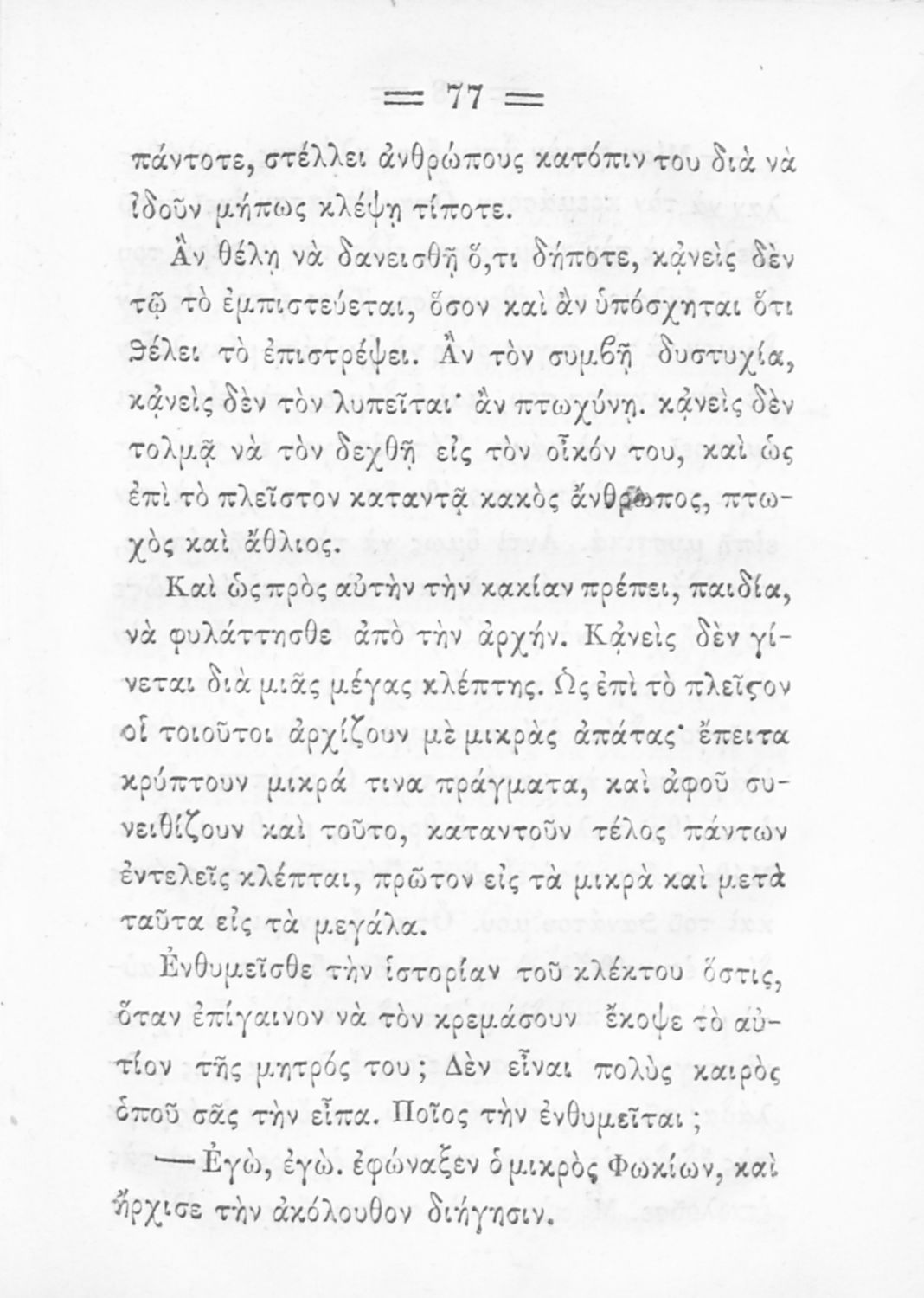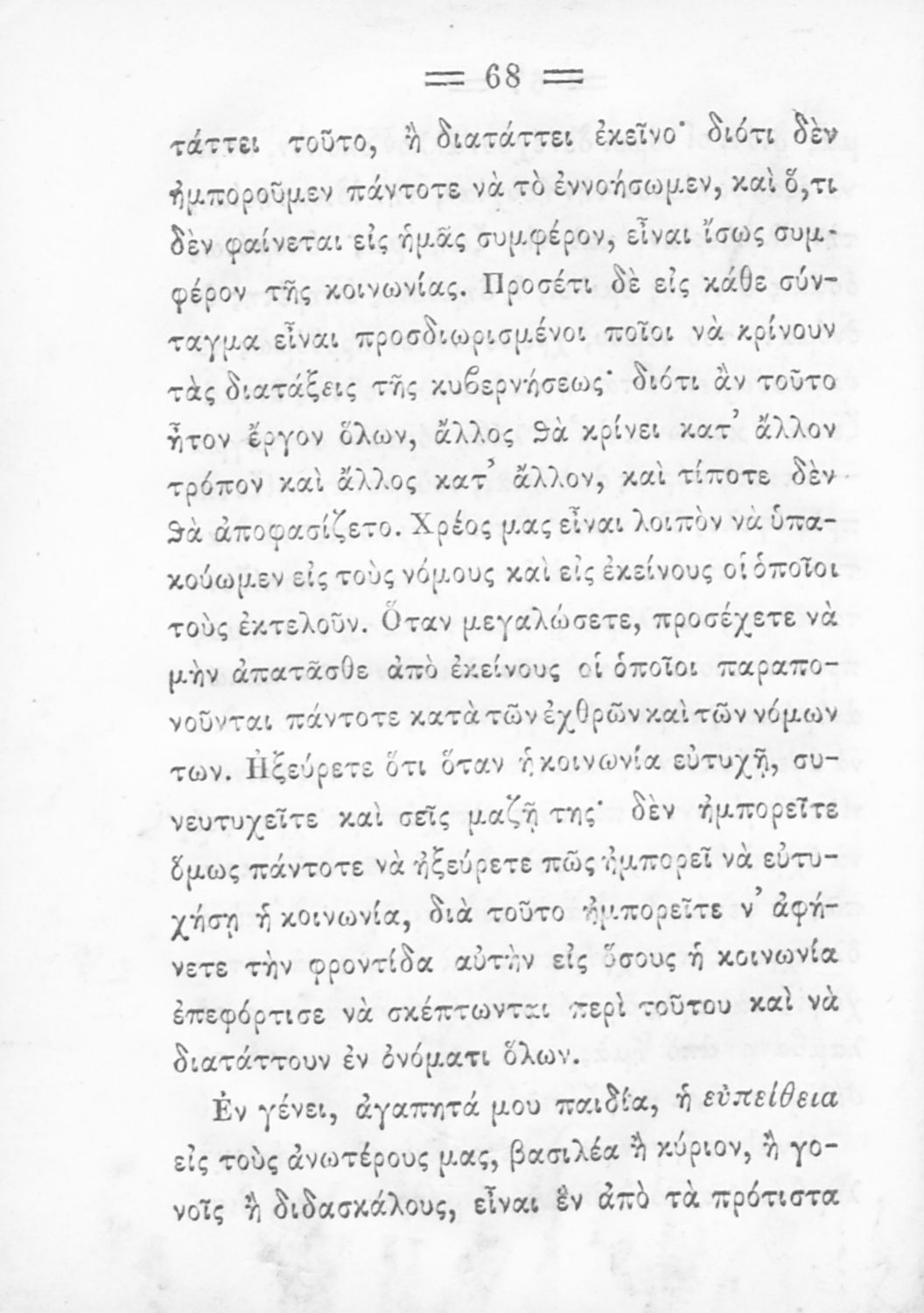 Βαθμίδα εκπαίδευσης: Πρωτοβάθμια Γλώσσα: Καθαρεύουσα Παρουσίαση περιεχομένου: Σχολικό εγχειρίδιο για τα αλληλοδιδακτικά σχολεία που αποσκοπεί στην ηθική και κοινωνική διαπαιδαγώγηση της "ορθόδοξης νεολαίας". Εγκρίθηκε από την Εκκλησιαστική Επιτροπή επειδή δεν περιέχει κάτι που να εναντιώνεται στη "θρησκεία, την ηθική και την εξουσία". |