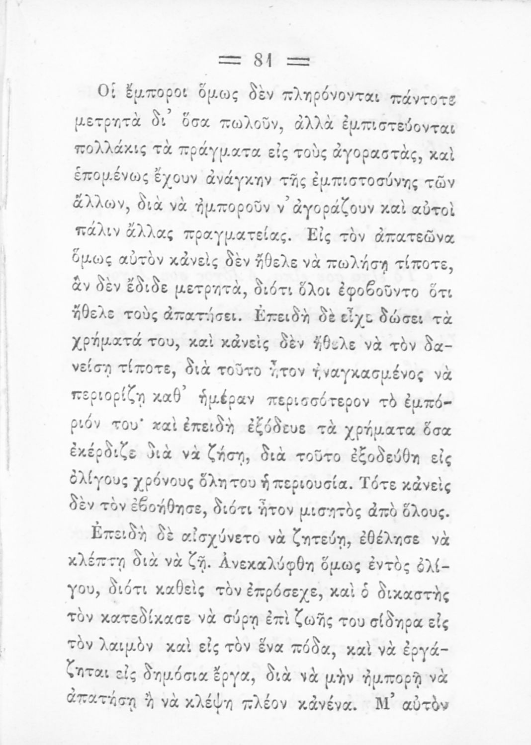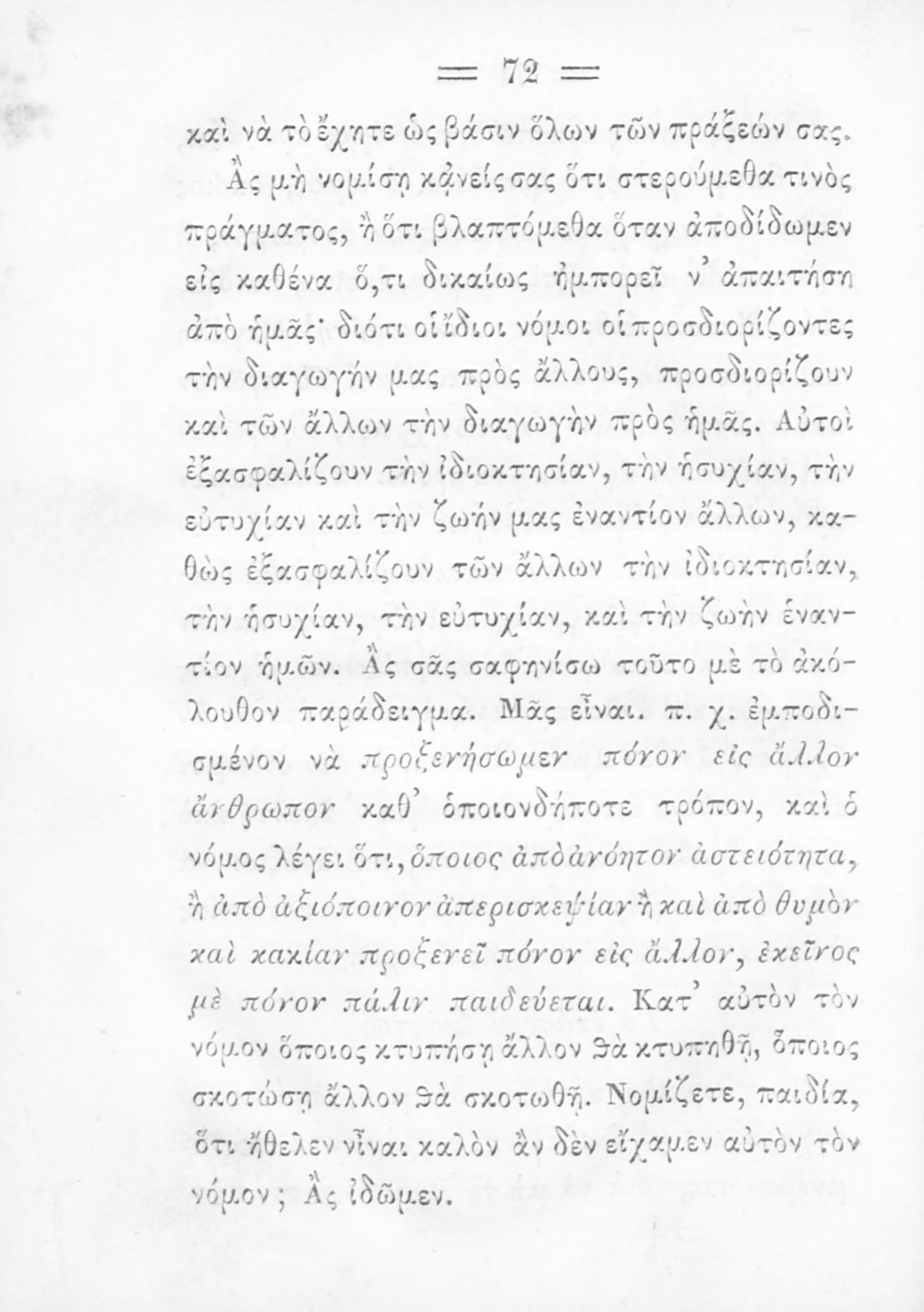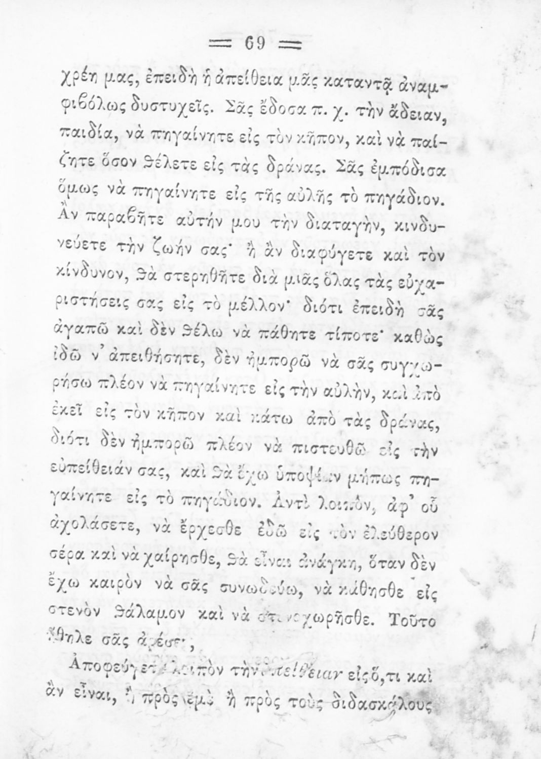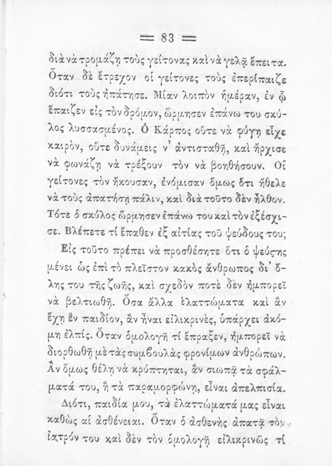 Βαθμίδα εκπαίδευσης: Πρωτοβάθμια Γλώσσα: Καθαρεύουσα Παρουσίαση περιεχομένου: Σχολικό εγχειρίδιο για τα αλληλοδιδακτικά σχολεία που αποσκοπεί στην ηθική και κοινωνική διαπαιδαγώγηση της "ορθόδοξης νεολαίας". Εγκρίθηκε από την Εκκλησιαστική Επιτροπή επειδή δεν περιέχει κάτι που να εναντιώνεται στη "θρησκεία, την ηθική και την εξουσία". |