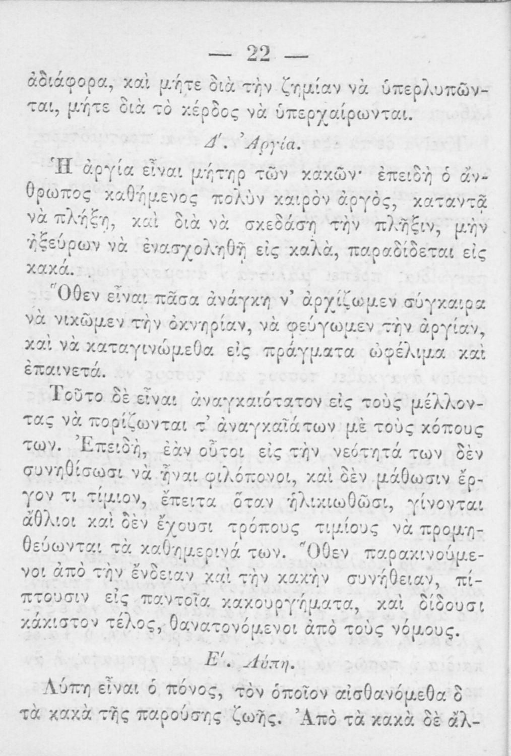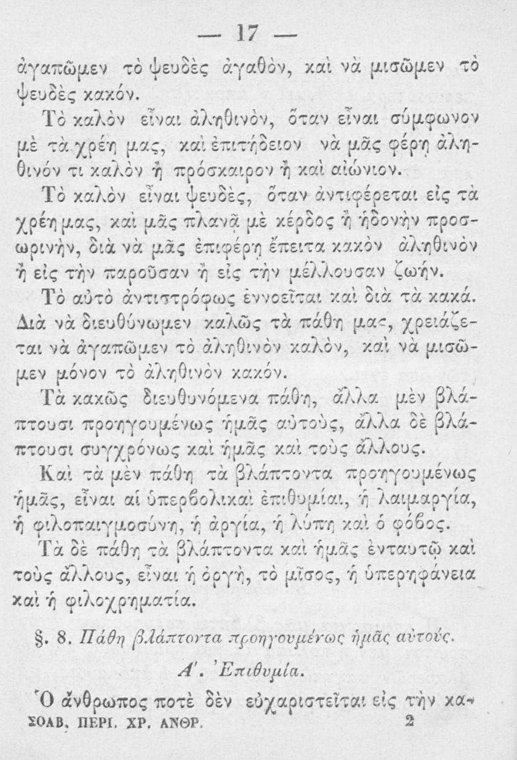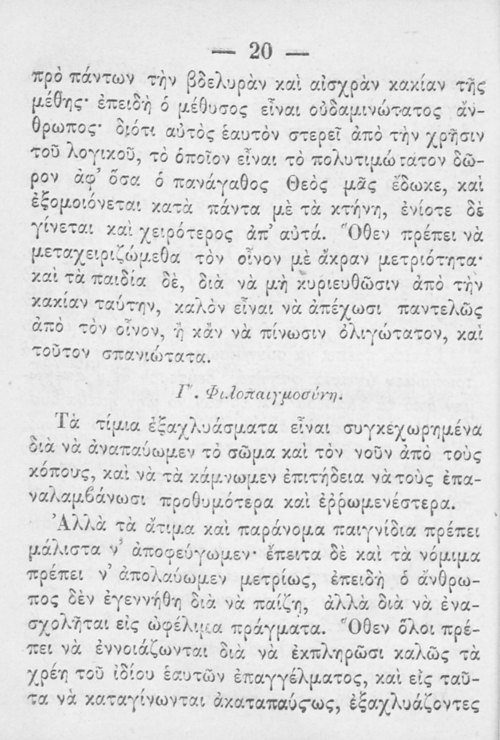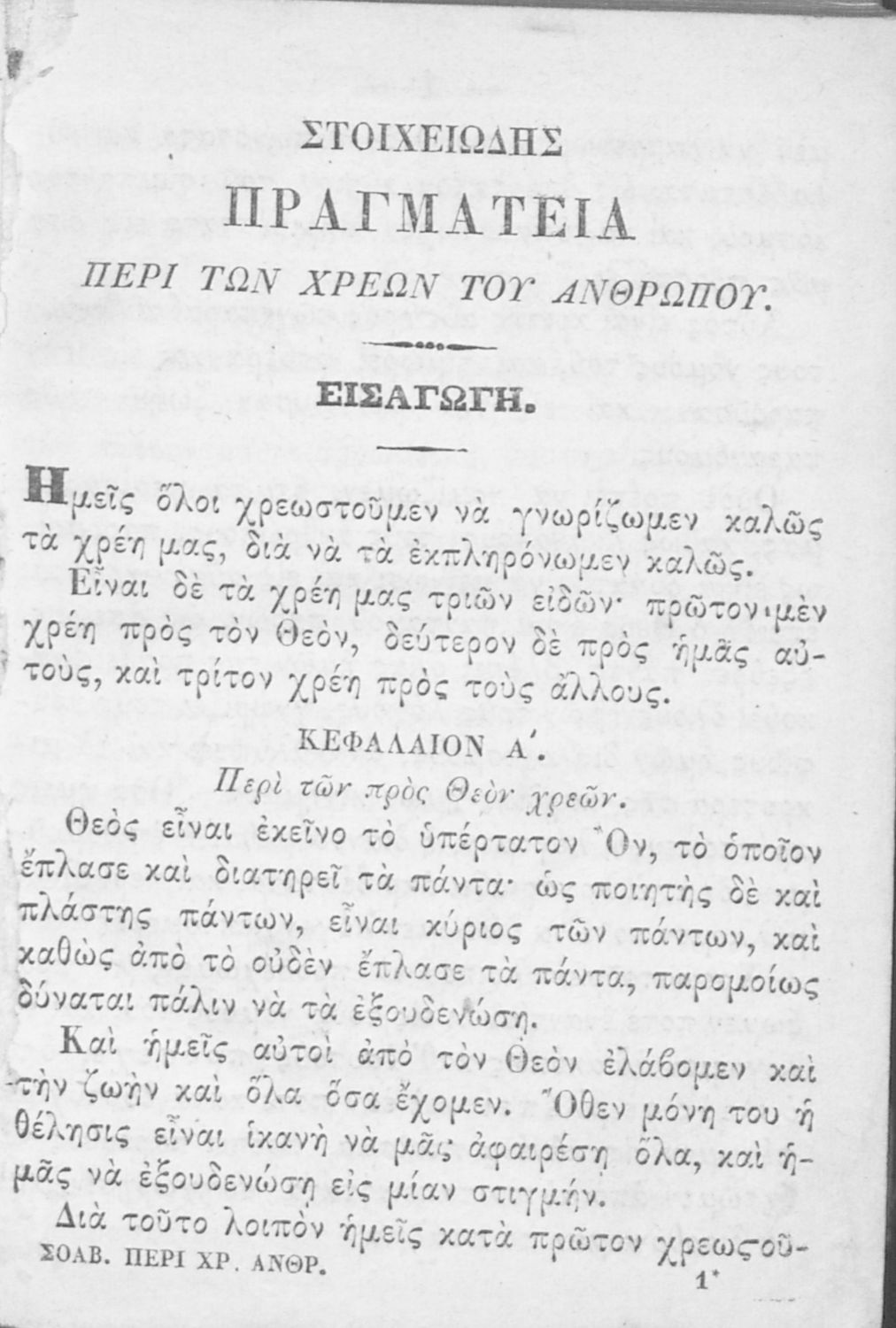 Σχολικό εγχειρίδιο για τα αλληλοδιδακτικά σχολεία που αποσκοπεί στην ηθική και κοινωνική διαπαιδαγώγηση της "ορθόδοξης νεολαίας". Εγκρίθηκε από την Εκκλησιαστική Επιτροπή επειδή δεν περιέχει κάτι που να εναντιώνεται στη "θρησκεία, την ηθική και την εξουσία".