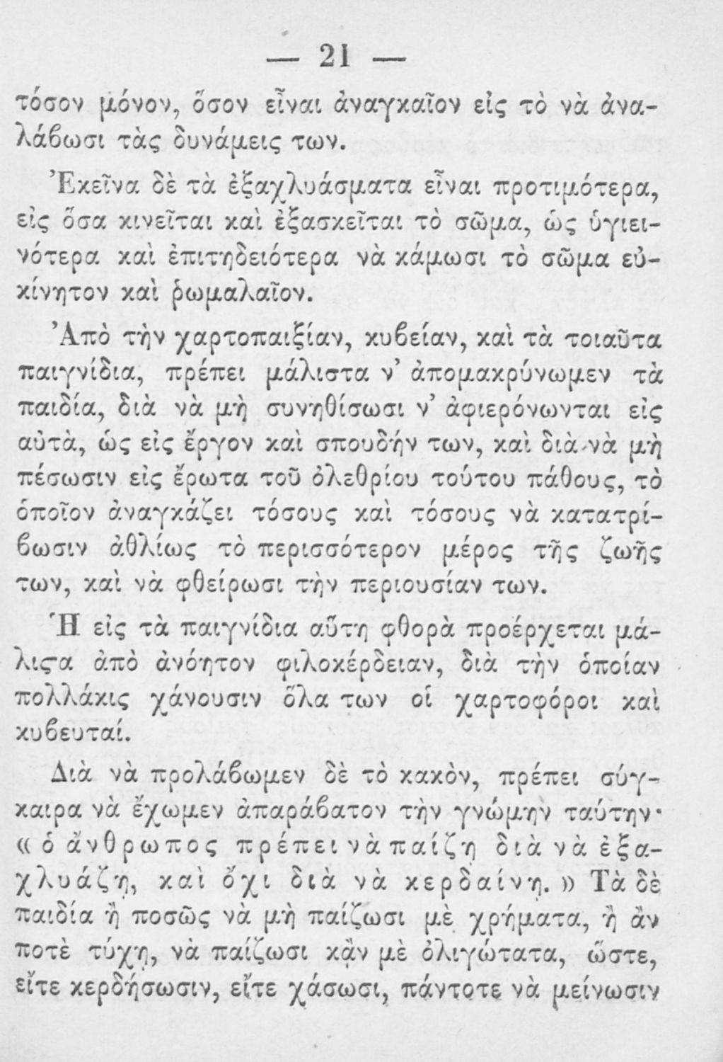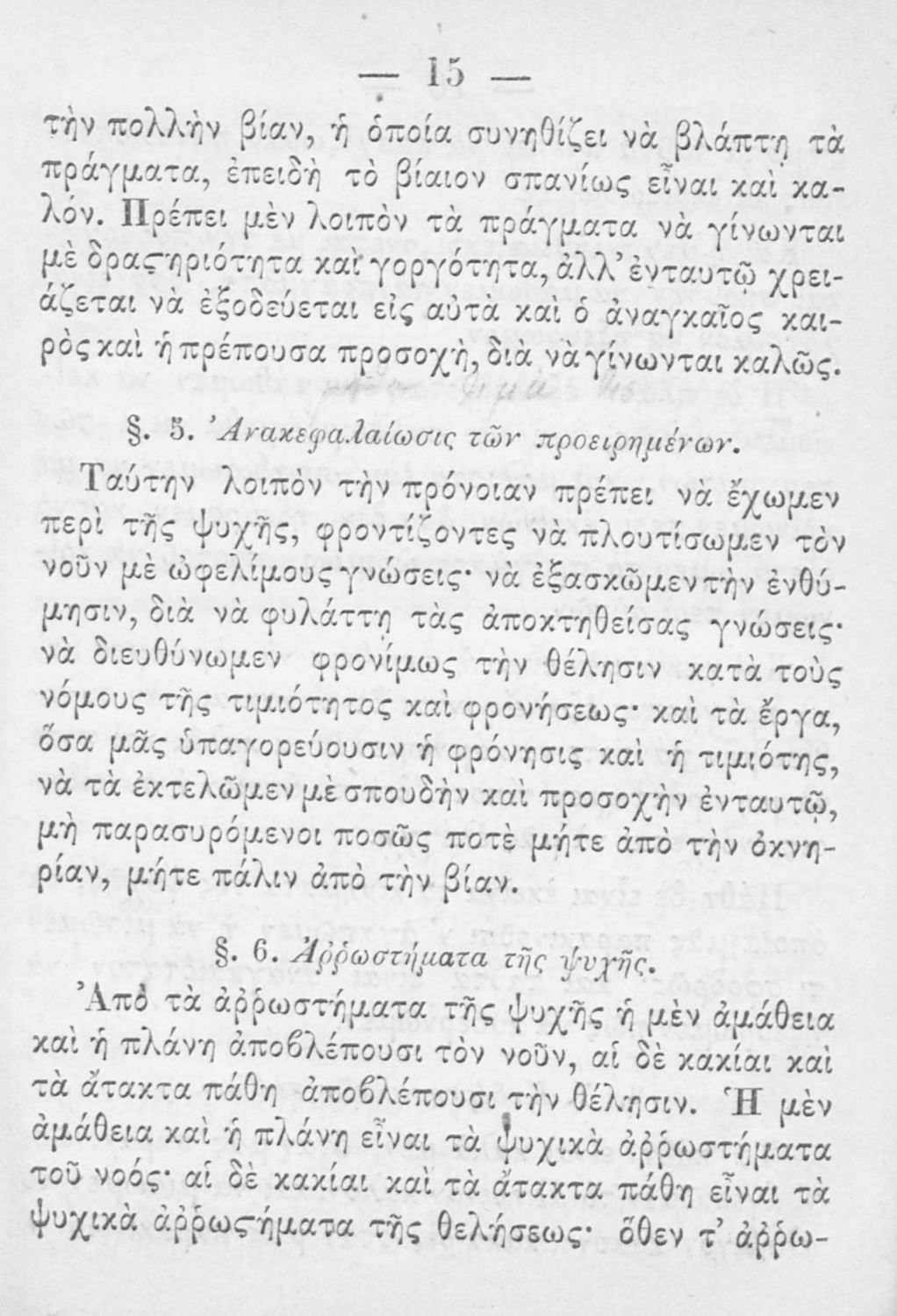 Βαθμίδα εκπαίδευσης: Πρωτοβάθμια Γλώσσα: Καθαρεύουσα Παρουσίαση περιεχομένου: Σχολικό εγχειρίδιο για τα αλληλοδιδακτικά σχολεία που αποσκοπεί στην ηθική και κοινωνική διαπαιδαγώγηση της "ορθόδοξης νεολαίας". Εγκρίθηκε από την Εκκλησιαστική Επιτροπή επειδή δεν περιέχει κάτι που να εναντιώνεται στη "θρησκεία, την ηθική και την εξουσία". |