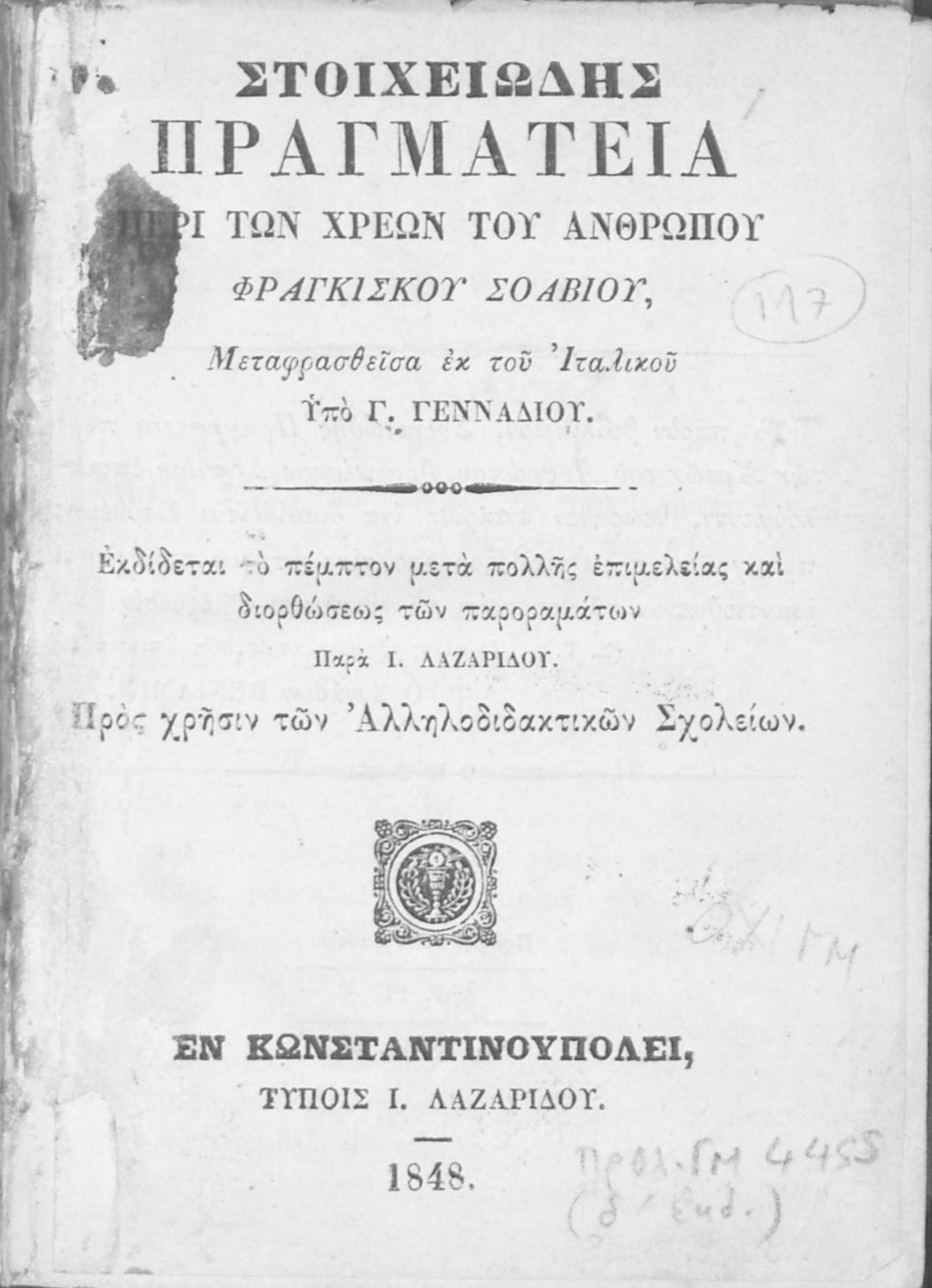 Κωδικός αναγνώρισης: 05-00117a Τίτλος: Στοιχειώδης πραγματεία περί των χρεών του ανθρώπου προς χρήσιν των Αλληλοδιδακτικών Σχολείων Συγγραφέας: Φραγκίσκος Σοάβιος (Francesco Soave), Γ. Γεννάδιος (μετάφραση) Μέγεθος και υπόστρωμα: Σχολικό εγχειρίδιο, μαλακό εξώφυλλο, 80 σελίδες. |