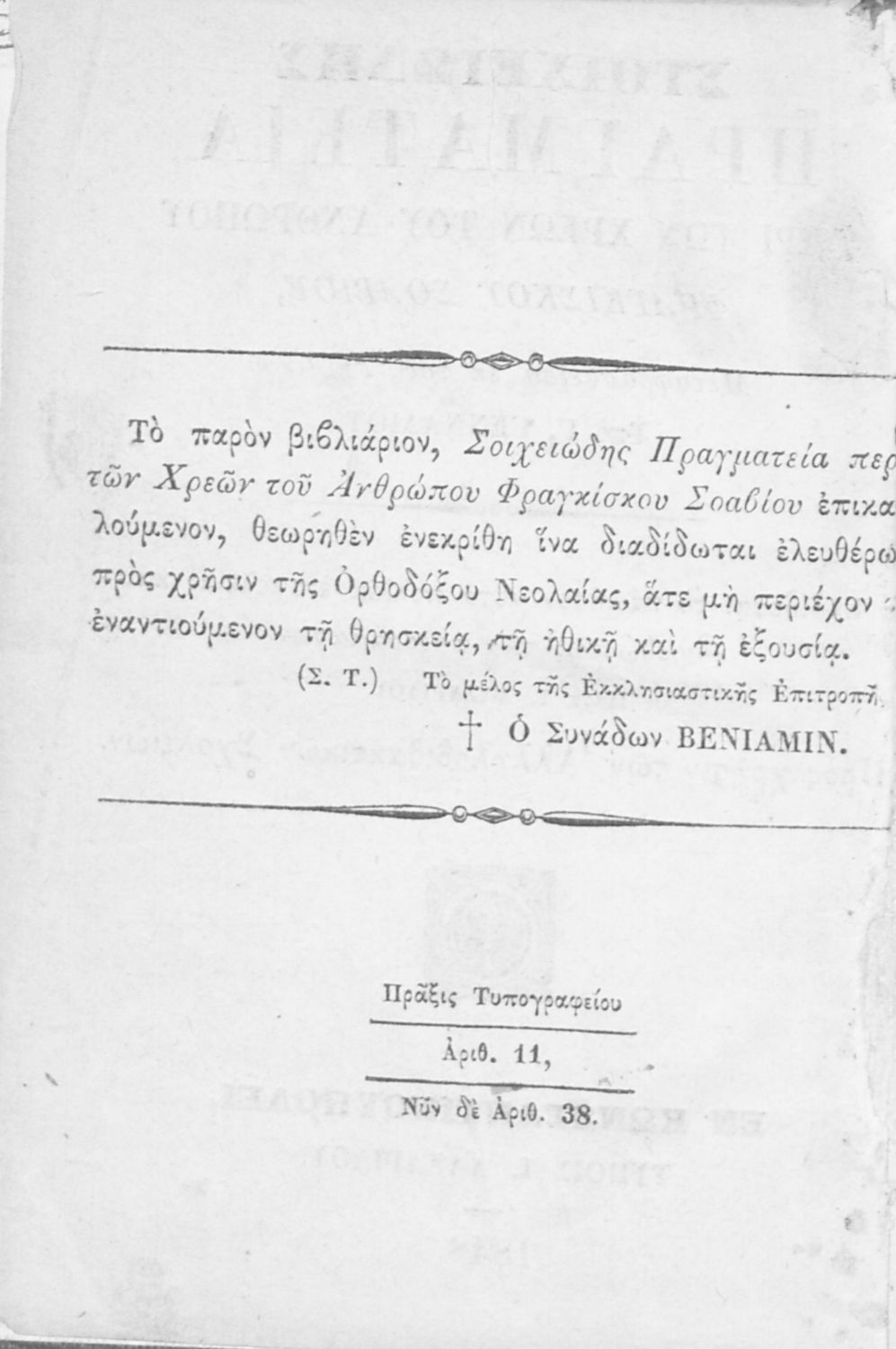 Εκδότης: Τυπογραφείο Ι. Λαζαρίδη Έτος έκδοσης: 1848 Τόπος έκδοσης: Κωνσταντινούπολη Έκδοση: 5η |