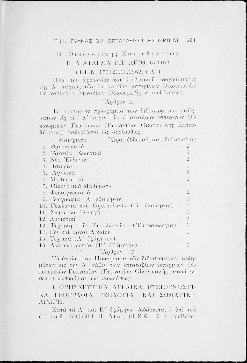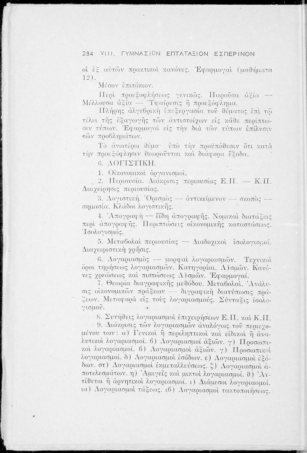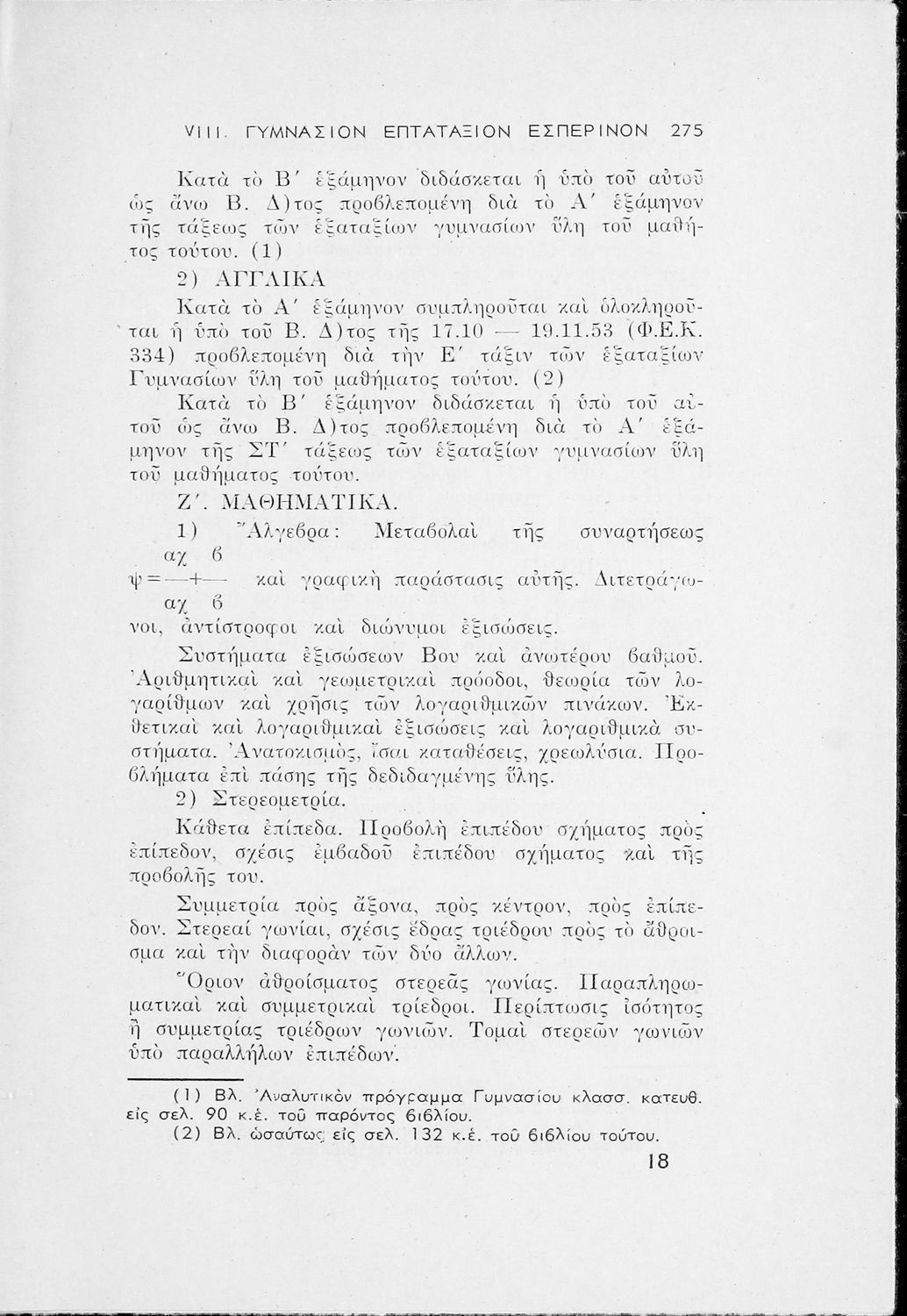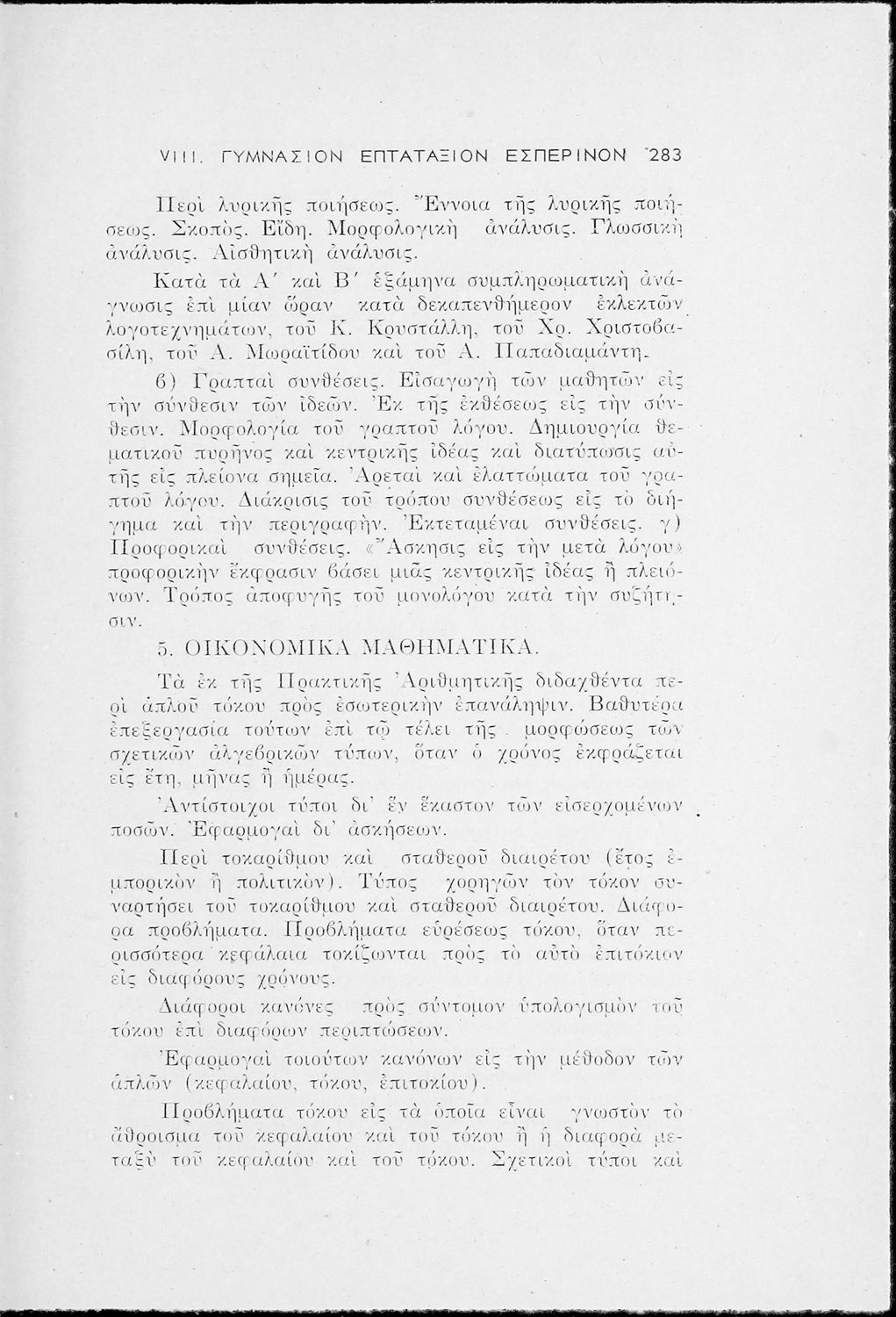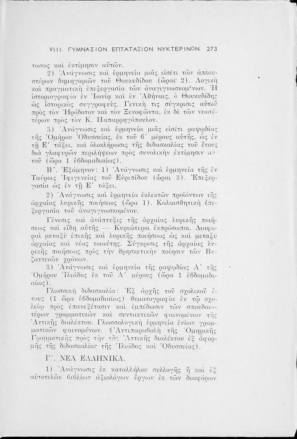 Έκδοση του Υπουργείο Παιδείας που περιλαμβάνει τα ωρολόγια αναλυτικά προγράμματα των μαθημάτων που διδάσκονται στα Εξατάξια Γυμνάσια, Πρακτικά Λύκεια, Ανώτερα Παρθεναγωγεία και τα Τριτάξια Αστικά Σχολεία.