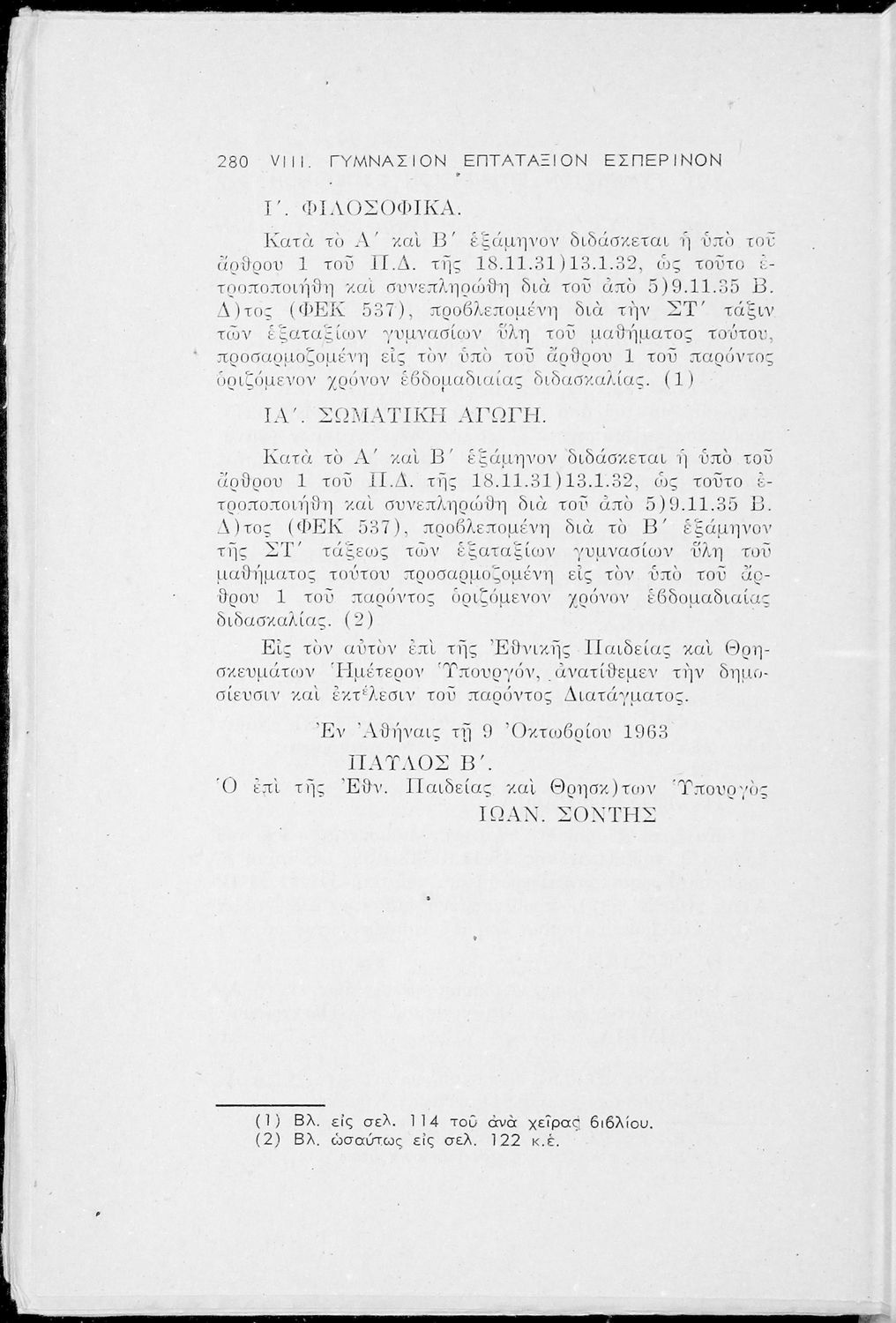 Αναλυτικό πρόγραμμα που υπογράφεται από τον Βασιλιά Κωνσταντίνο. Σε χειρόγραφη σημείωση στο εσωτερικό του αναφέρεται ότι πρόκειται για Το Ωρολόγιο και Αναλυτικό Πρόγραμμα των Δημοτικών που δημοσιεύτηκε στο ΦΕΚ