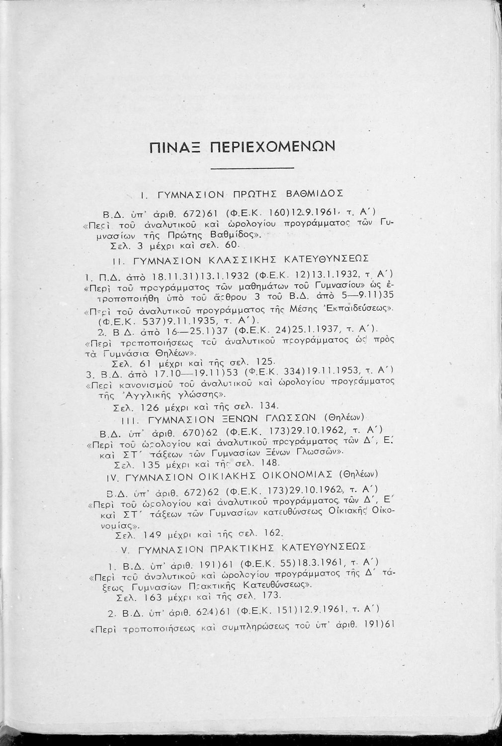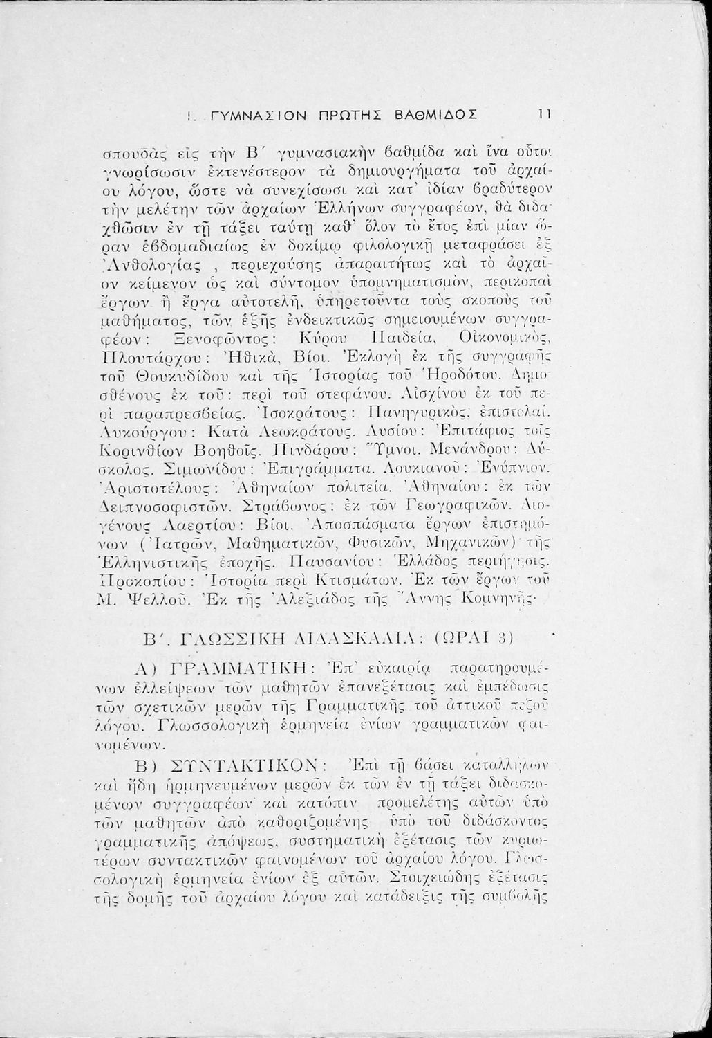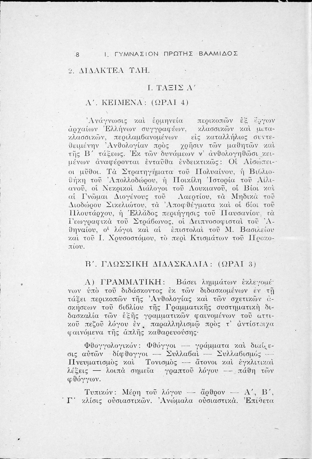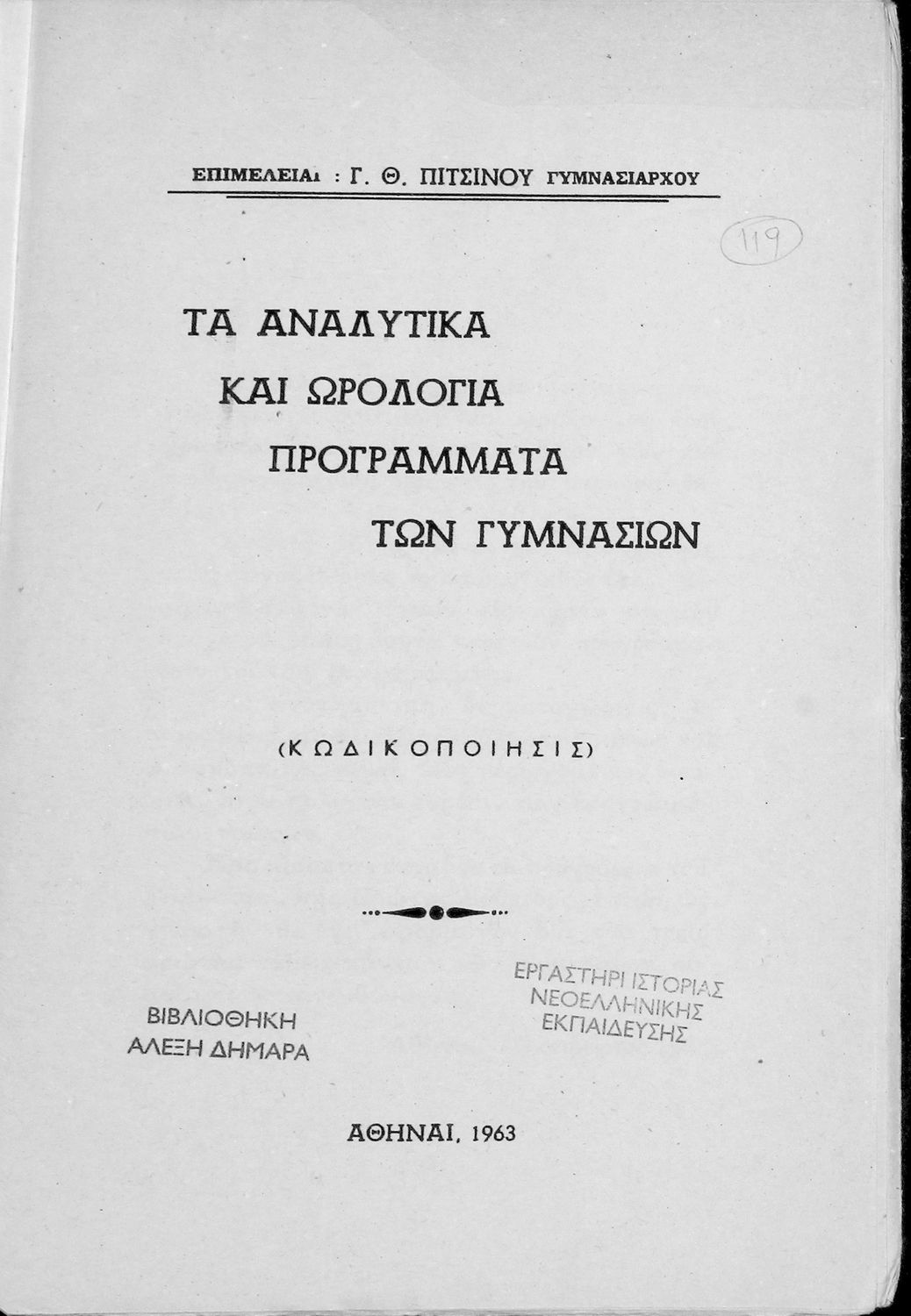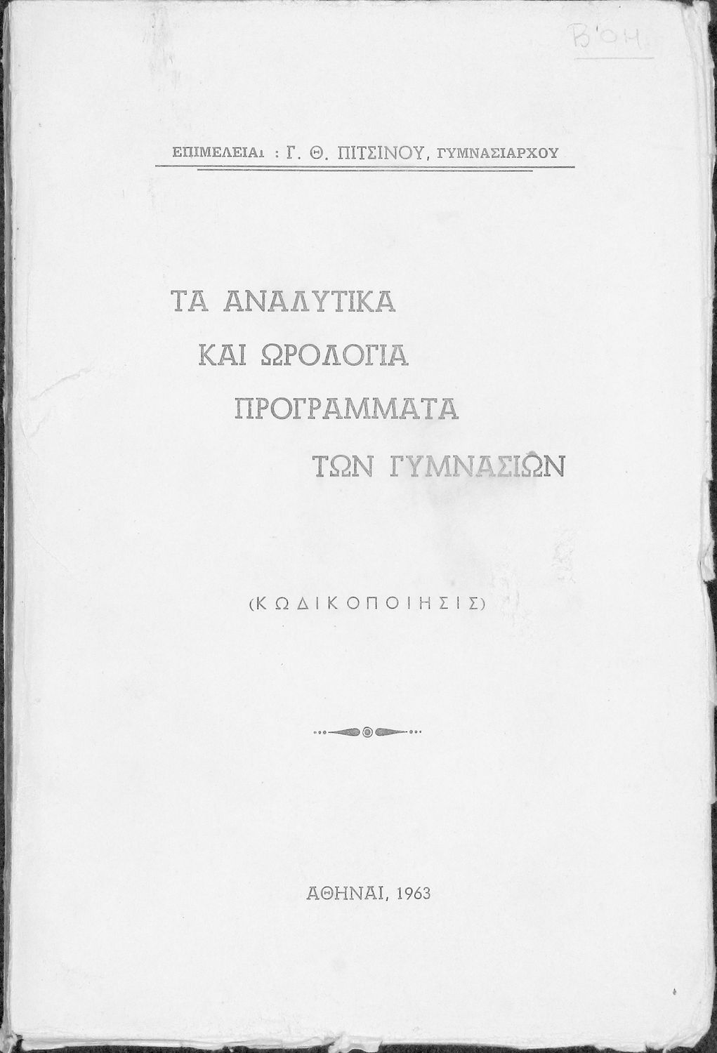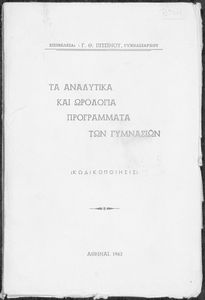 Έκδοση του Υπουργείο Παιδείας που περιλαμβάνει τα ωρολόγια αναλυτικά προγράμματα των μαθημάτων που διδάσκονται στα Εξατάξια Γυμνάσια, Πρακτικά Λύκεια, Ανώτερα Παρθεναγωγεία και τα Τριτάξια Αστικά Σχολεία.