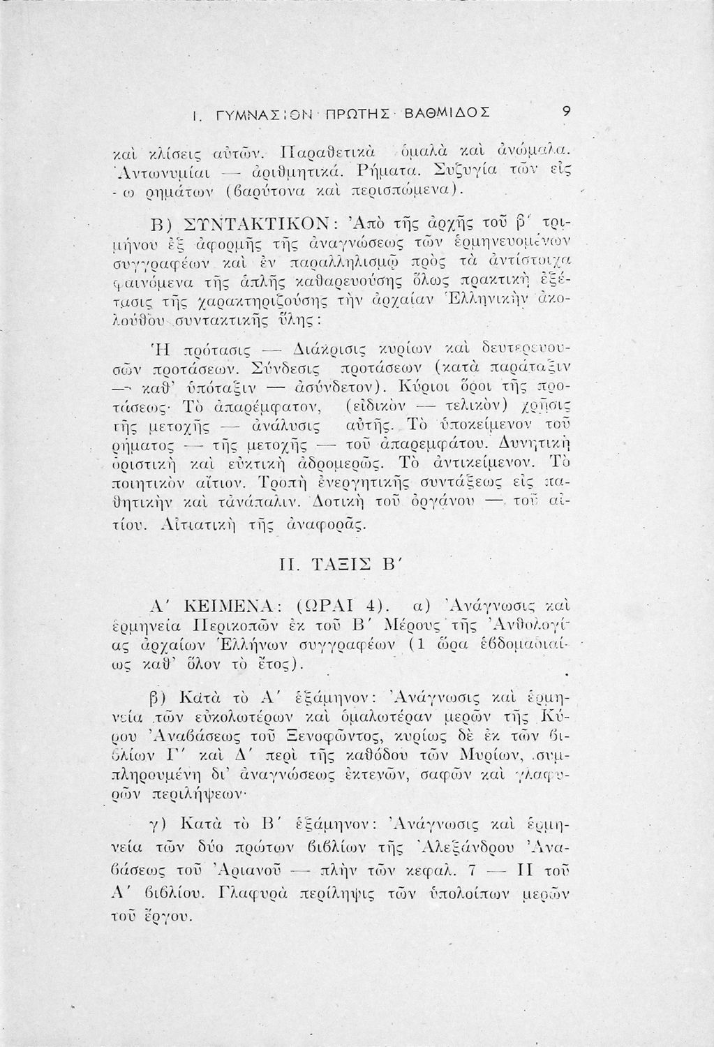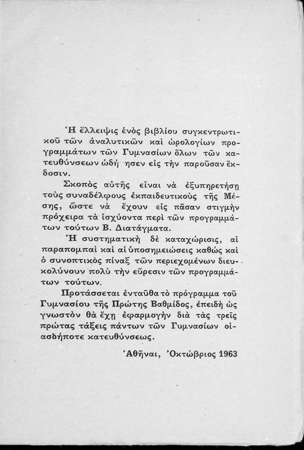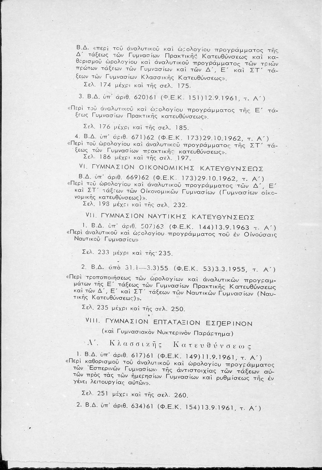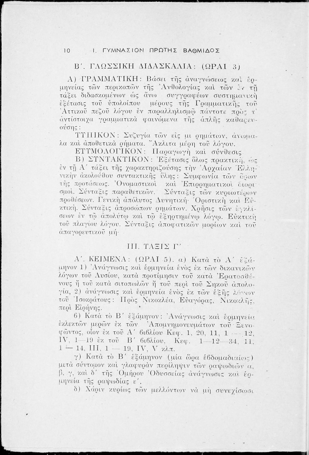 Έκδοση του Υπουργείο Παιδείας που περιλαμβάνει τα ωρολόγια αναλυτικά προγράμματα των μαθημάτων που διδάσκονται στα Εξατάξια Γυμνάσια, Πρακτικά Λύκεια, Ανώτερα Παρθεναγωγεία και τα Τριτάξια Αστικά Σχολεία.