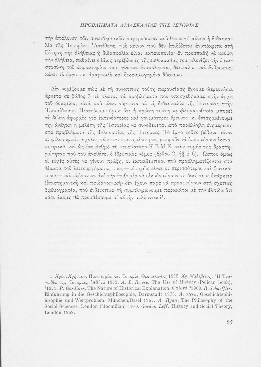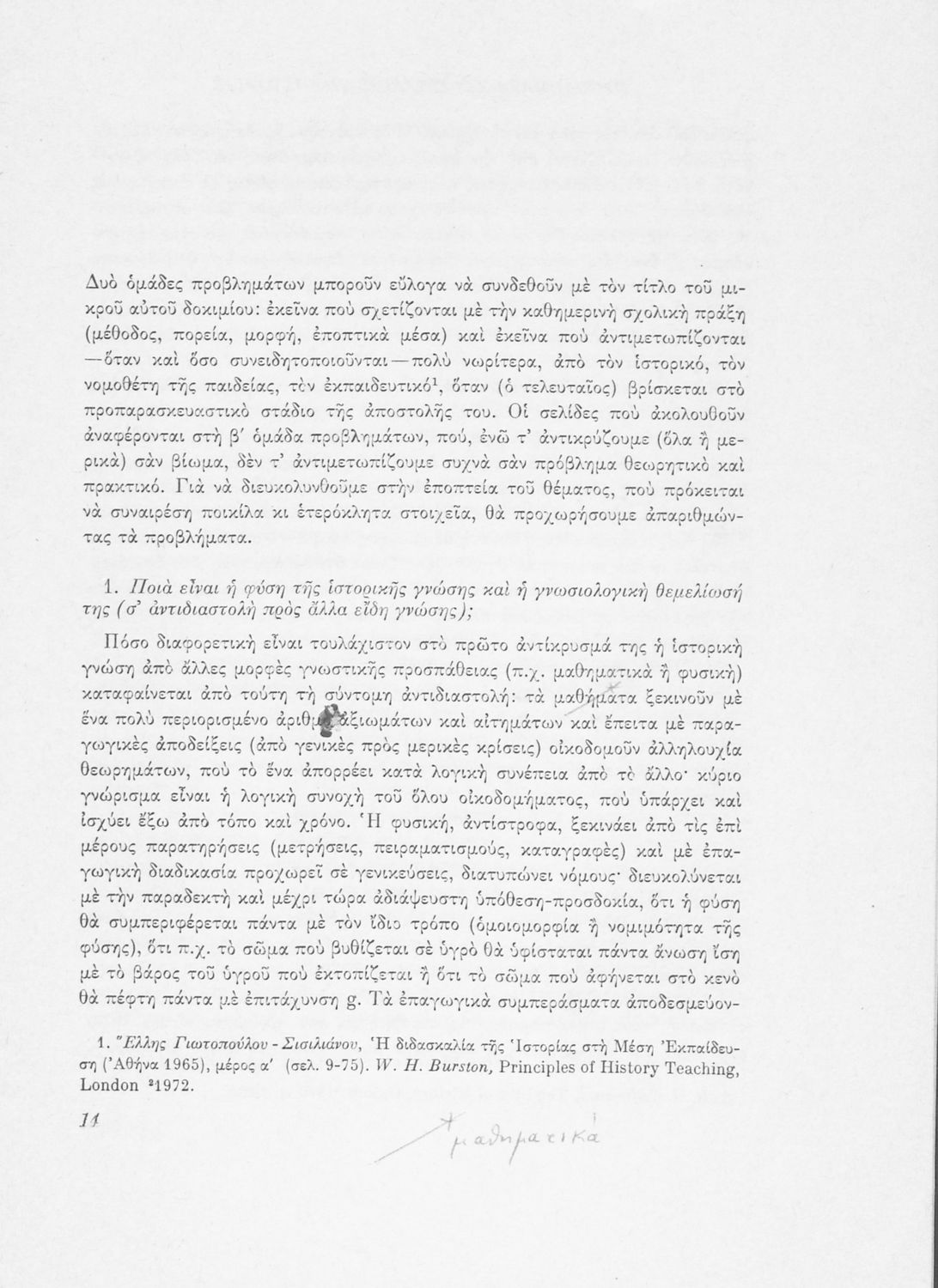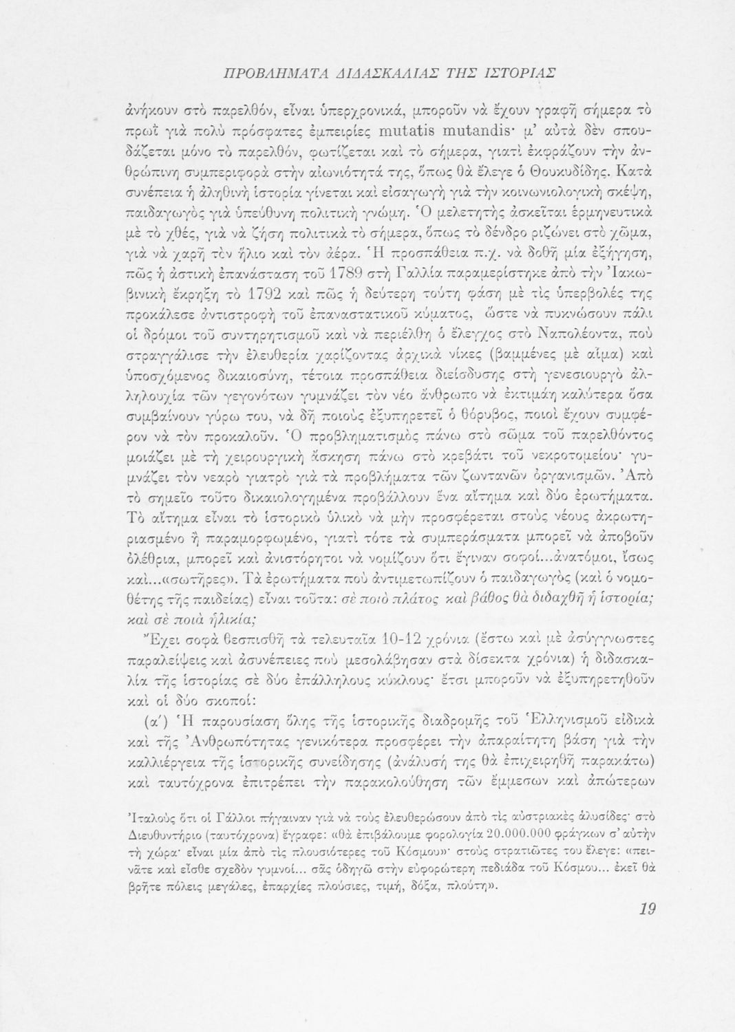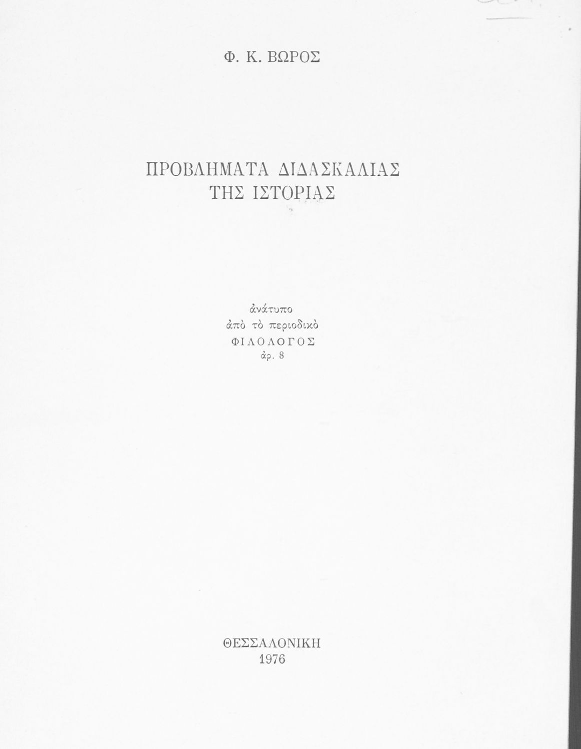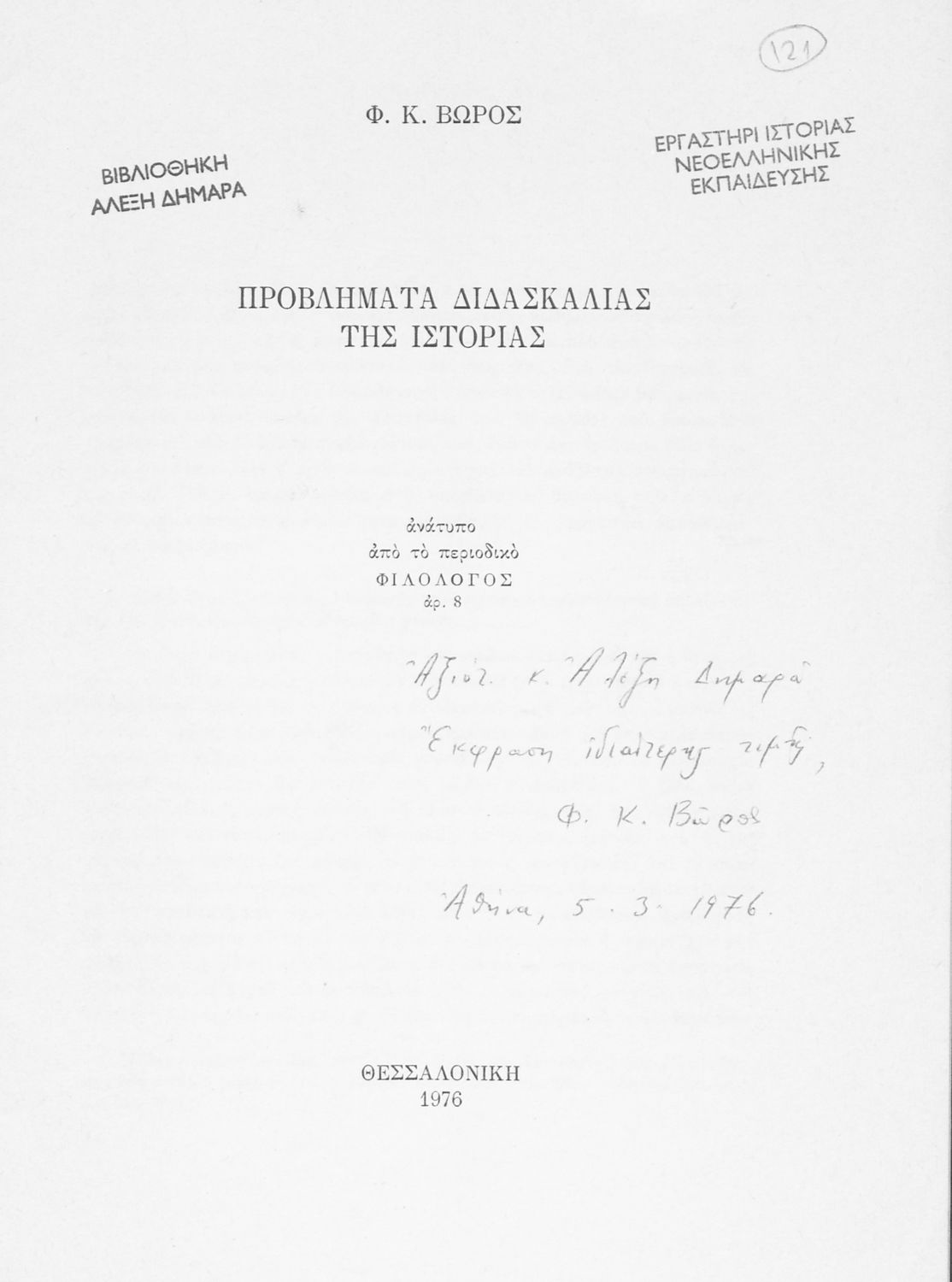 Ανάτυπο, από το περιοδικό Φιλόλογος, το οποίο μέσω ερωτήσεων εξετάζει διάφορα προβλήματα στη διδασκαλία της Ιστορίας. Στην 1η σελίδα φέρει ιδιόχειρη αφιέρωση του συγγραφέα.